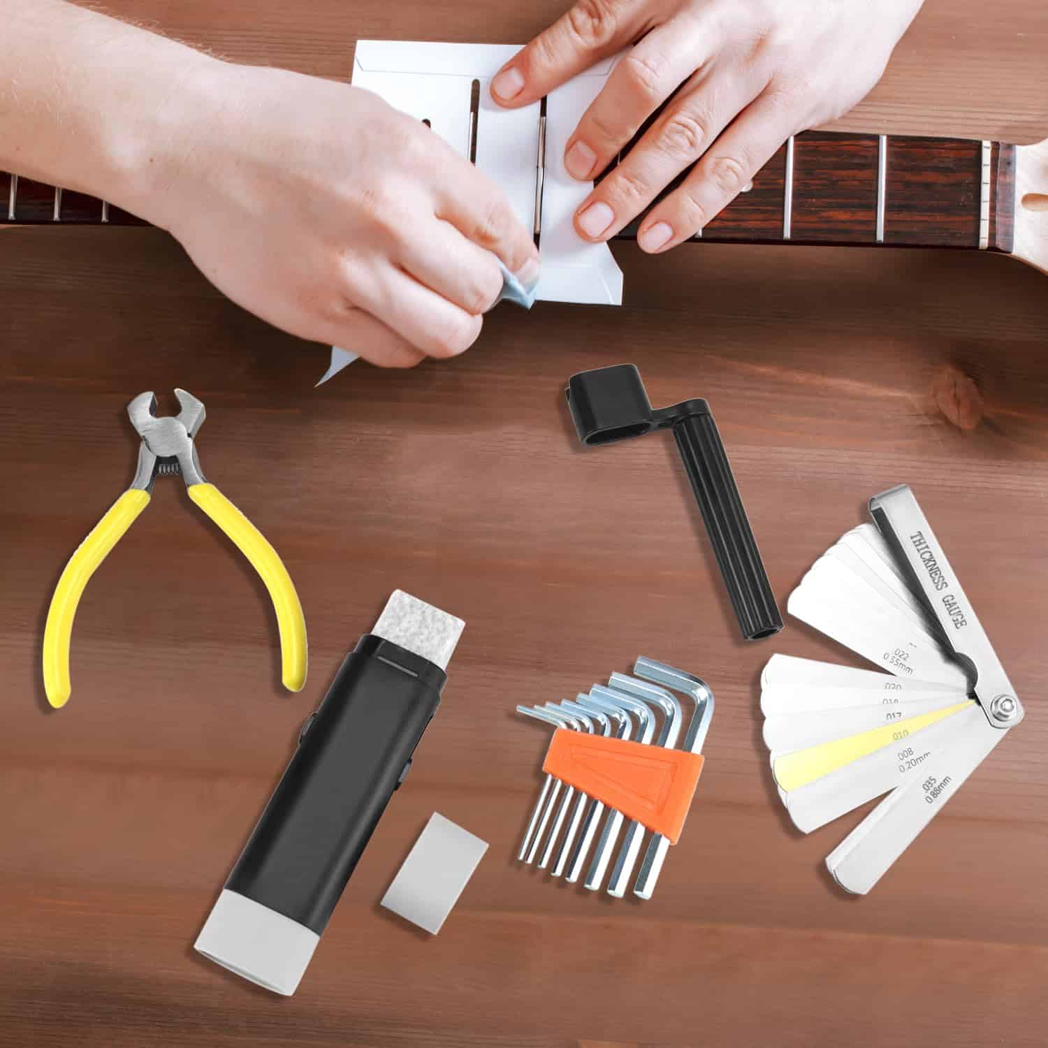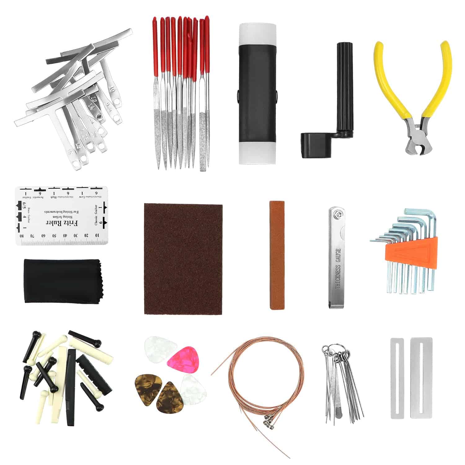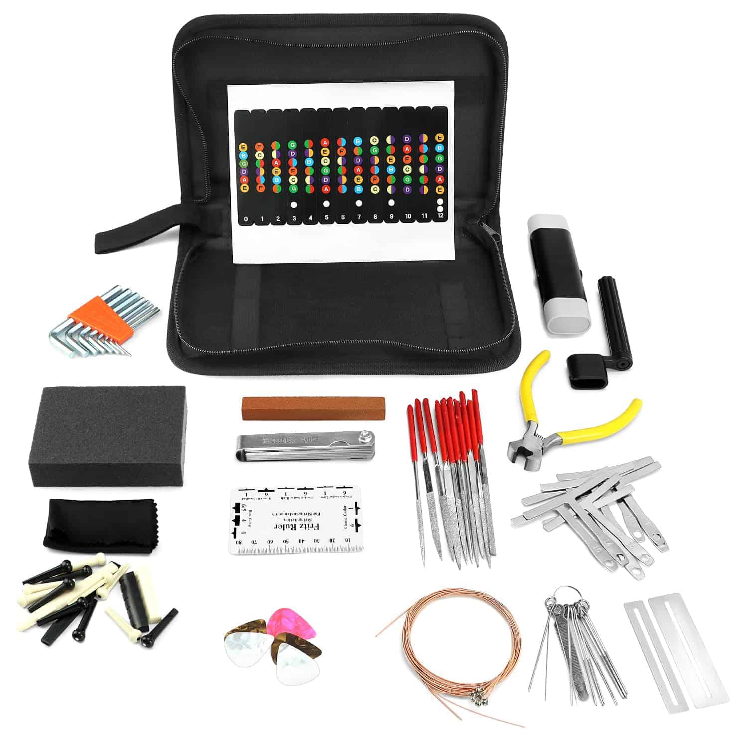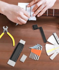 El Kit de Herramientas para Guitarra QWORK de 72 Piezas es el juego completo que necesitas para reparar y mantener tus guitarras, bajos, ukuleles, banjos y más. Con materiales confiables para ofrecer ajustes precisos y duraderos, este set incluye todo lo necesario para la manutención profesional de instrumentos de cuerda. Desde clavijas de puente hasta cuerdas, pasando por púas y archivos para coronar trastes, este set tiene todo lo que necesitas. Además, la bolsa de almacenamiento duradera te permite tener tus herramientas organizadas y listas para llevar donde quieras. No importa si eres un principiante o un experto, este set es ideal para ajustar la acción, establecer la entonación, cambiar cuerdas y realizar reparaciones generales en tu instrumento. ¡Hazte con el Kit de Herramientas para Guitarra QWORK de 72 Piezas y mantén tus instrumentos en perfecto estado!