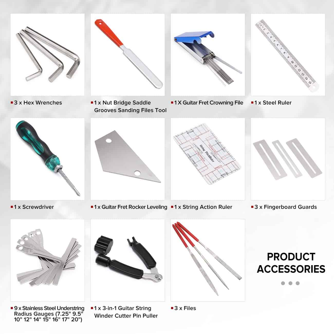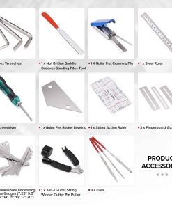 Con este completo kit, podrás cambiar cuerdas, ajustar el tono, la acción, verificar la altura de las cuerdas y realizar otras tareas de mantenimiento y reparación en tus instrumentos de cuerda. Además, las herramientas están diseñadas para ser duraderas, fáciles de usar y portátiles, lo que las convierte en la elección perfecta tanto para principiantes como para profesionales.