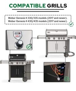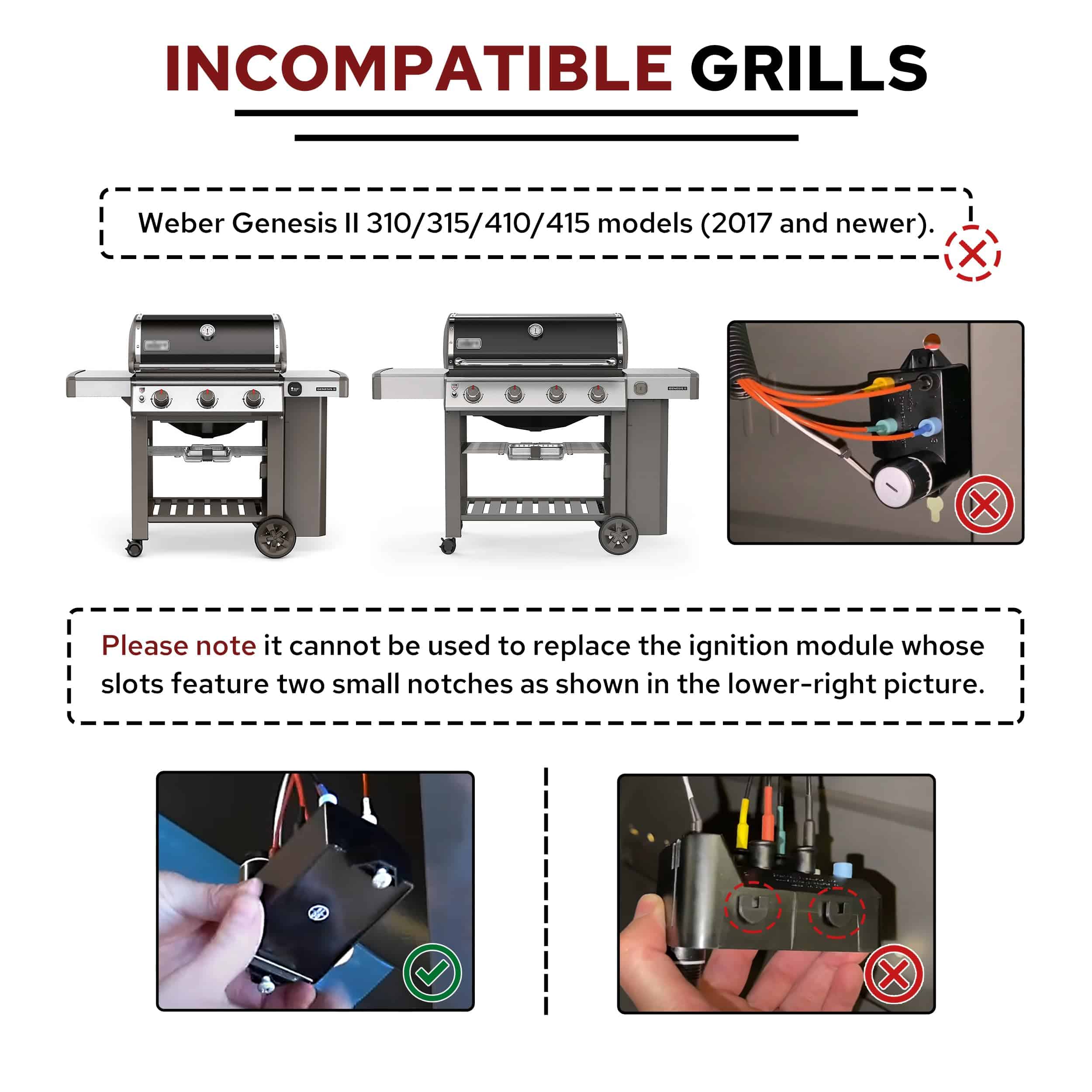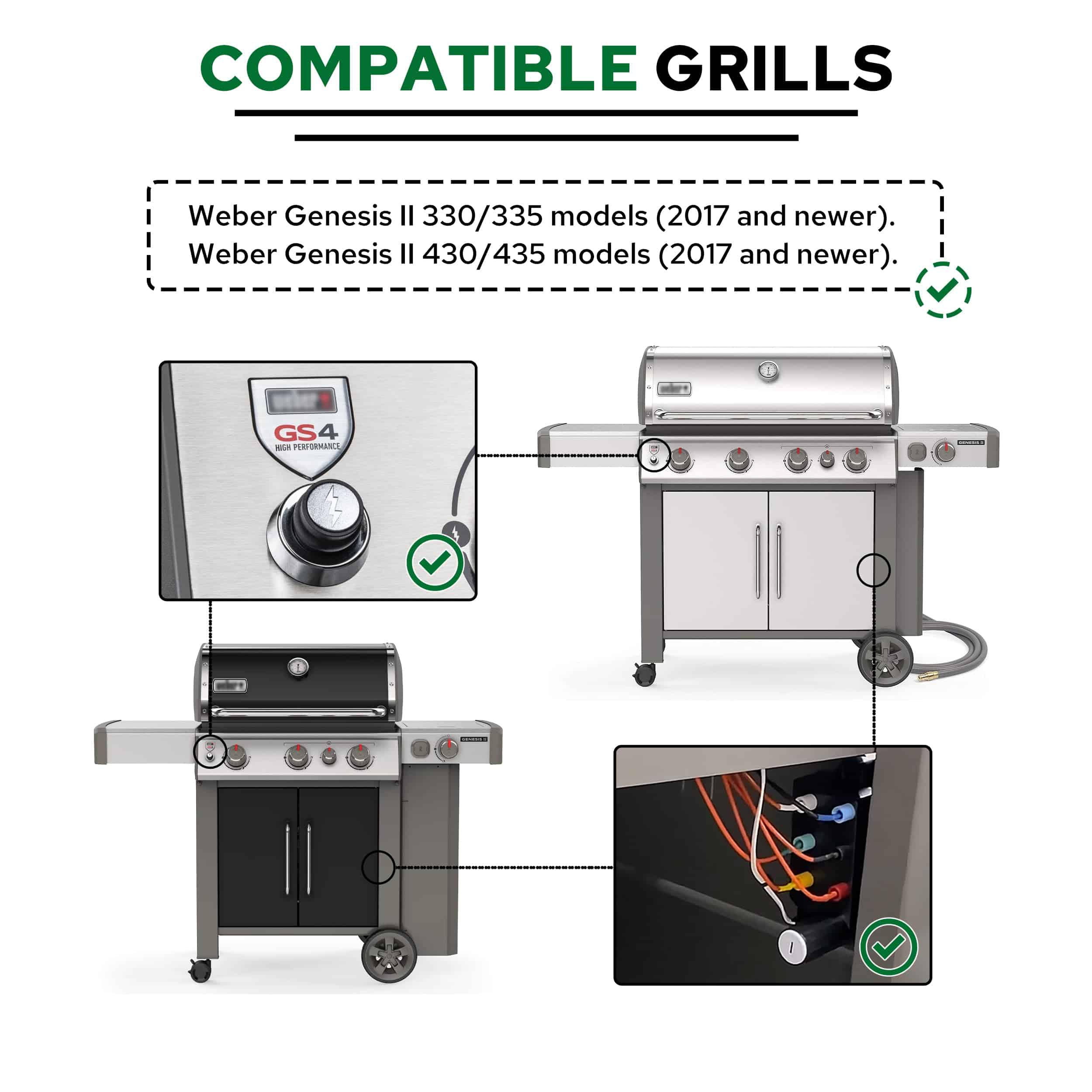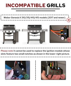Piezas de repuesto para parrillas Weber GS4 Genesis II 330, 335, 430, 435 series (2017 en adelante). Este kit de ignición universal contiene todas las piezas necesarias, excepto la batería AA. No compatible con modelos de parrillas Genesis II 310/315/340/355 o 410/415/440/455 que vienen con un módulo de encendido de 4 salidas. Fácil instalación con manual incluido una vez confirmada la compatibilidad con su parrilla Weber Genesis II GS4.