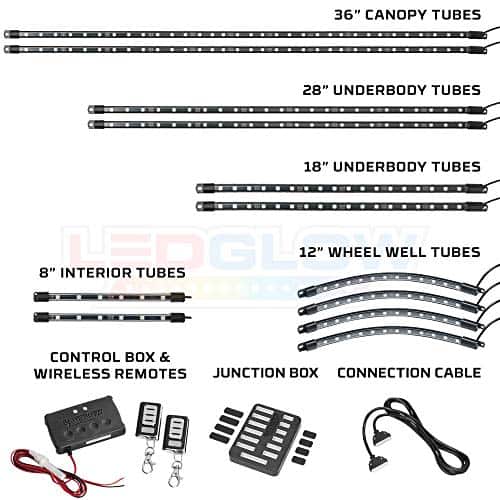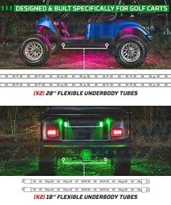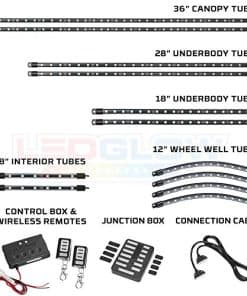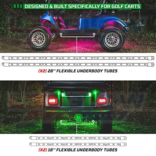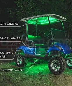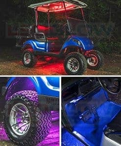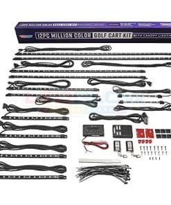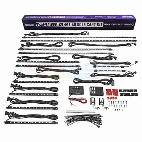 El Kit de Iluminación LEDGlow de 12 piezas para Carros de Golf con Millones de Colores y luces para techo, pozos de ruedas e interiores transformará su carro de golf a gasolina o eléctrico añadiendo un sentido único y dinámico de estilo. Los 12 tubos de luz LED flexibles incluidos iluminarán el bajo carro, techo, ruedas e interior de su carro de golf. Diseñado específicamente para carros de golf, los tubos de luz de 18″ se ajustarán debajo del frente y la parte trasera de su carro de golf, mientras que los tubos de 28″ se ajustarán debajo de los lados. Los tubos de luz de 36″ para el techo iluminarán la parte inferior del techo de su carro de golf, junto con tubos de luz de 8″ para el interior de su carro de golf. Los tubos de luz flexibles de 12″ para los pozos de ruedas se pueden contornear en los pozos de ruedas del carro de golf, iluminando las ruedas y el suelo debajo de ellas. Todos los tubos son altamente duraderos y resistentes al agua, y pueden soportar la mayoría de las condiciones en las que se utilizará su carro de golf. Se requiere un sistema de 12 voltios para activar su Kit de Iluminación LEDGlow de 12 piezas con LEDs SMD de Millones de Colores para Carros de Golf. Por lo tanto, siempre que haya una fuente de alimentación de 12 voltios accesible, este kit de luces funcionará completamente en carros de golf tanto a gasolina como eléctricos. Puede conectar fácilmente todos los tubos en el cuadro de unión de 12 puertos incluido para conectar todas las características del kit juntas. El cuadro de control alimenta todas las características disponibles del kit, que se pueden controlar a través del cuadro de control o los 2 controles remotos inalámbricos incluidos. También podrá aprovechar los modos de color sólido, diversos efectos de iluminación y modos de activación de sonido que permiten que las luces reaccionen a la música que se reproduce en o alrededor de su carro de golf. LEDGlow incluye soporte técnico gratuito de por vida y una garantía limitada de un año con cada compra.