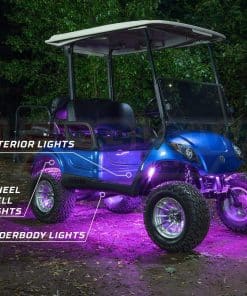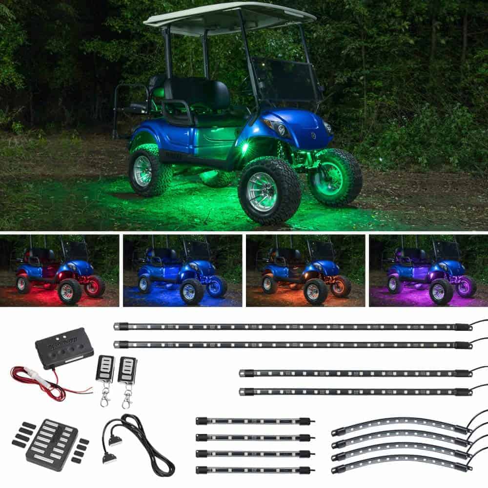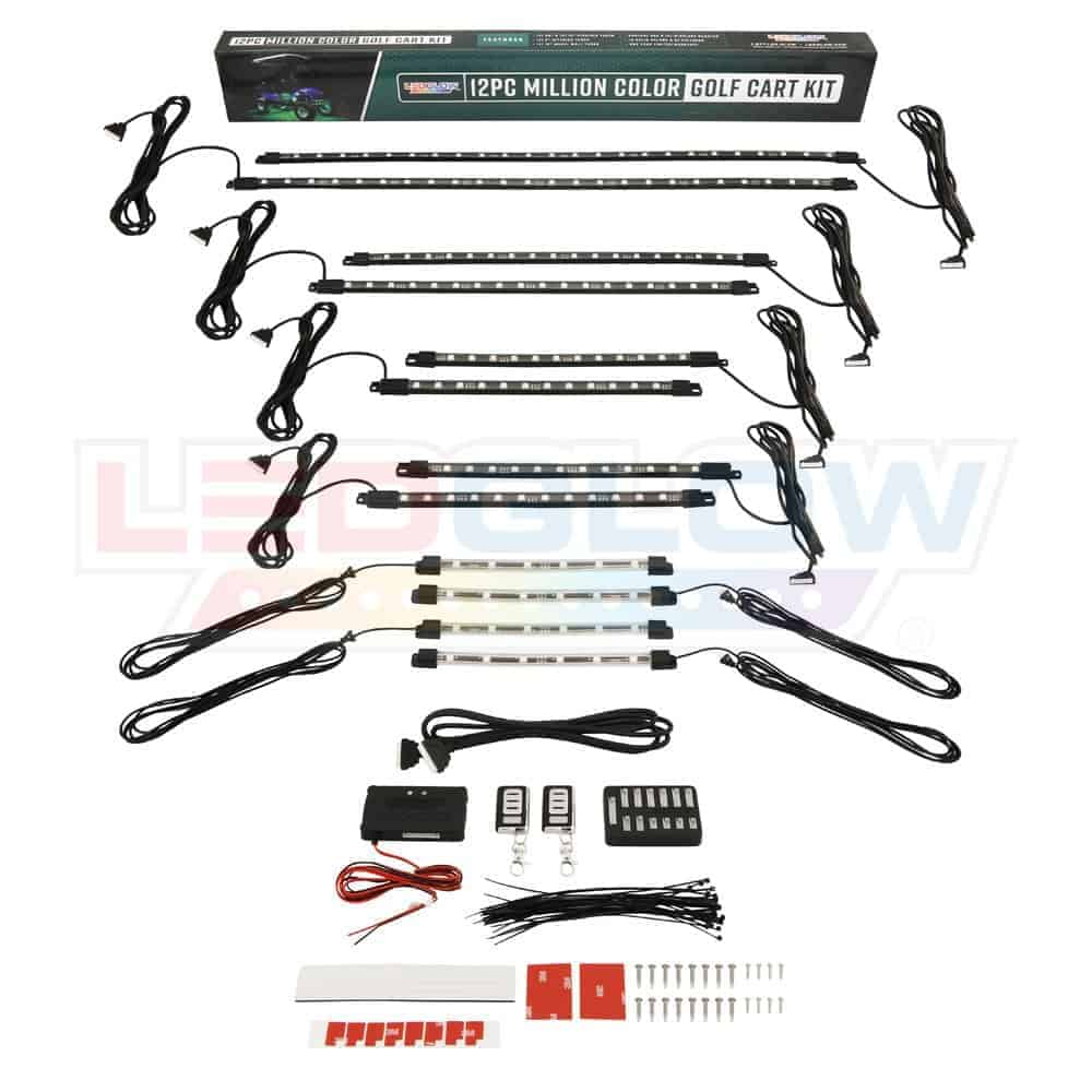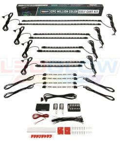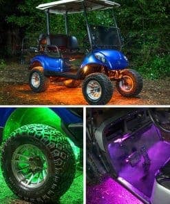El Kit de Iluminación LEDGlow multicolor de 12 piezas para Carrito de Golf es el paquete de iluminación definitivo, que incluye (2) tubos flexibles de 28″ y (2) tubos flexibles de 18″ para el subchasis, junto con (4) tubos flexibles de 12″ para las ruedas y (4) tubos flexibles de 8″ para el interior que convierten tu carro en un espectáculo visualmente impresionante con 156 LED SMD ultrabrillantes. Los tubos para el subchasis incluidos en este kit están diseñados específicamente para carritos de golf. Al incluir dos longitudes diferentes, permite que cada sección debajo del carrito de golf esté adecuadamente iluminada, sin dejar ninguna sección sin luz. Los tubos para las ruedas se instalan fácilmente en el revestimiento de las ruedas para iluminar cada rueda y los tubos del interior agregan iluminación a los compartimentos para los pies. Este kit también incluye un sencillo cuadro de control, dos controles remotos inalámbricos, una caja de conexiones de 12 puertos en la que cada tubo se conecta directamente, y un cable de conexión utilizado para enlazar la caja de conexiones con el cuadro de control. El cuadro de control incluido funciona con cualquier fuente de alimentación de 12 voltios. Selecciona entre modos como Iluminación Sólida con 9 colores únicos que incluyen azul, rojo, verde, naranja, turquesa, rosa, rosa intenso, púrpura, blanco y amarillo, así como 3 modos de destello, un Ciclo de Colores, 3 Modos de Atenuación, 2 Modos de Destello, Atenuación de Colores y Modo de Degradado, un Modo Demo, 4 Modos Activados por Sonido y un Modo de Destello S.O.S. y más. Las opciones adicionales incluyen 5 Ajustes de Velocidad para ajustar cada patrón a tu nivel de velocidad preferido. Los usuarios pueden seleccionar los colores sólidos o modos de iluminación destacados utilizando cualquiera de los dos controles remotos inalámbricos incluidos o los cuatro botones ubicados directamente en el cuadro de control. LEDGlow incluye instrucciones de instalación, soporte técnico de por vida gratuito y una garantía limitada de un año con cada compra.