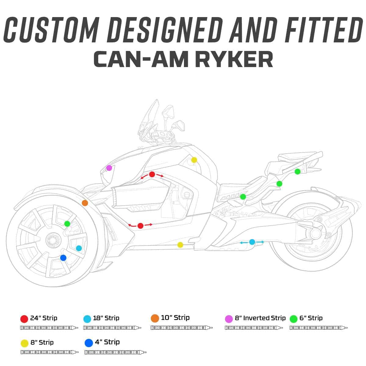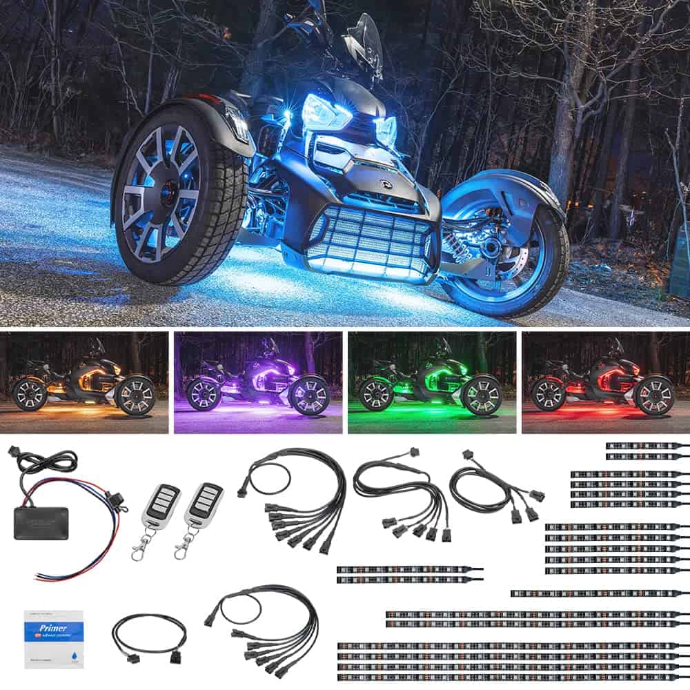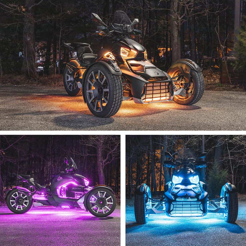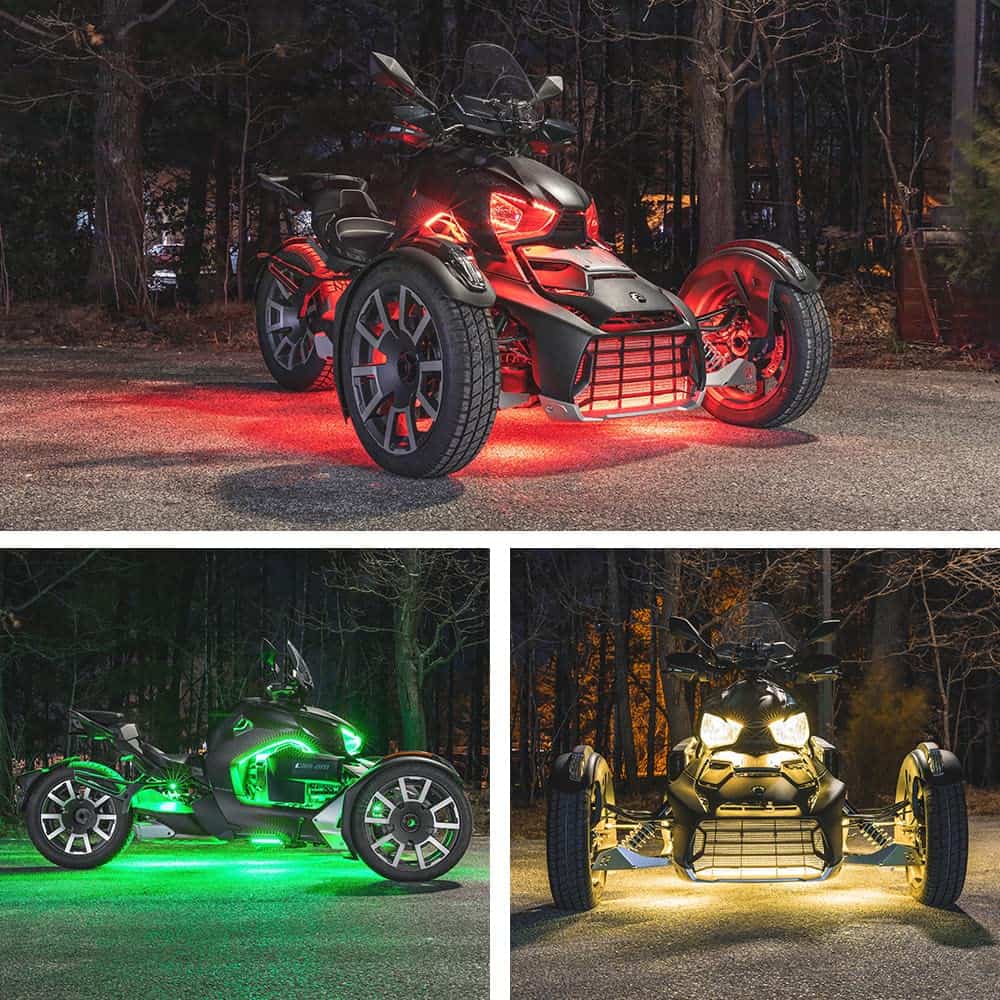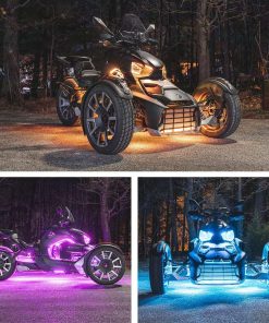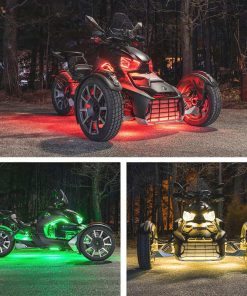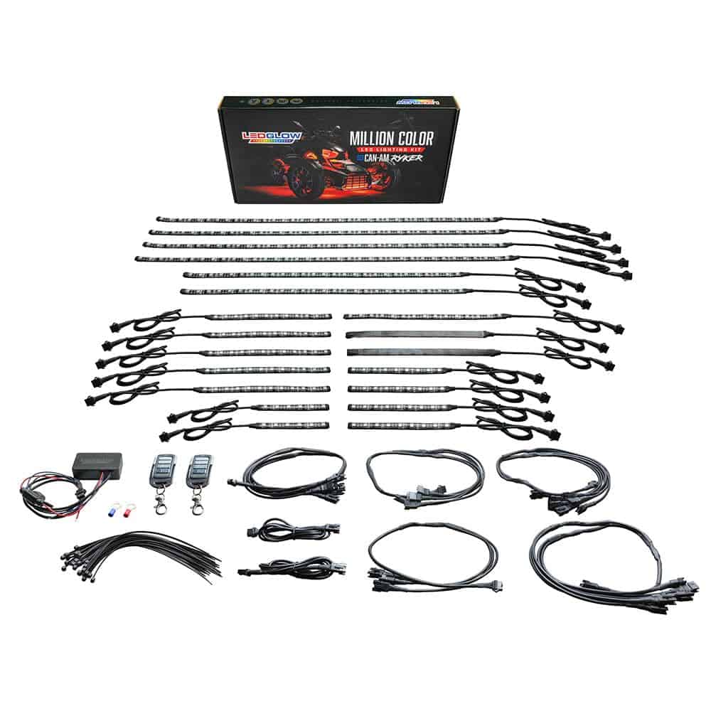 El Kit LEDGlow 20pc Advanced Million Color SMD LED Underglow es compatible con Can-Am Ryker y viene con una caja de control impermeable que cuenta con 15 modos de color sólido, 3 modos intermitentes, 2 modos de ciclo de color y 1 modo de atenuación. La función de luz de freno automática ilumina todo el Ryker con LEDs rojos al unísono con las luces de freno. Incluye tiras de iluminación flexibles de diferentes longitudes que contienen 331 LEDs SMD, caja de control impermeable, 2 controles remotos inalámbricos, arnés de alimentación de tiras de motocicleta, extensiones de cable, paquetes de promotor de adhesión, instrucciones detalladas de instalación paso a paso y garantía LEDGlow con garantía limitada de un año y soporte técnico gratuito de por vida.