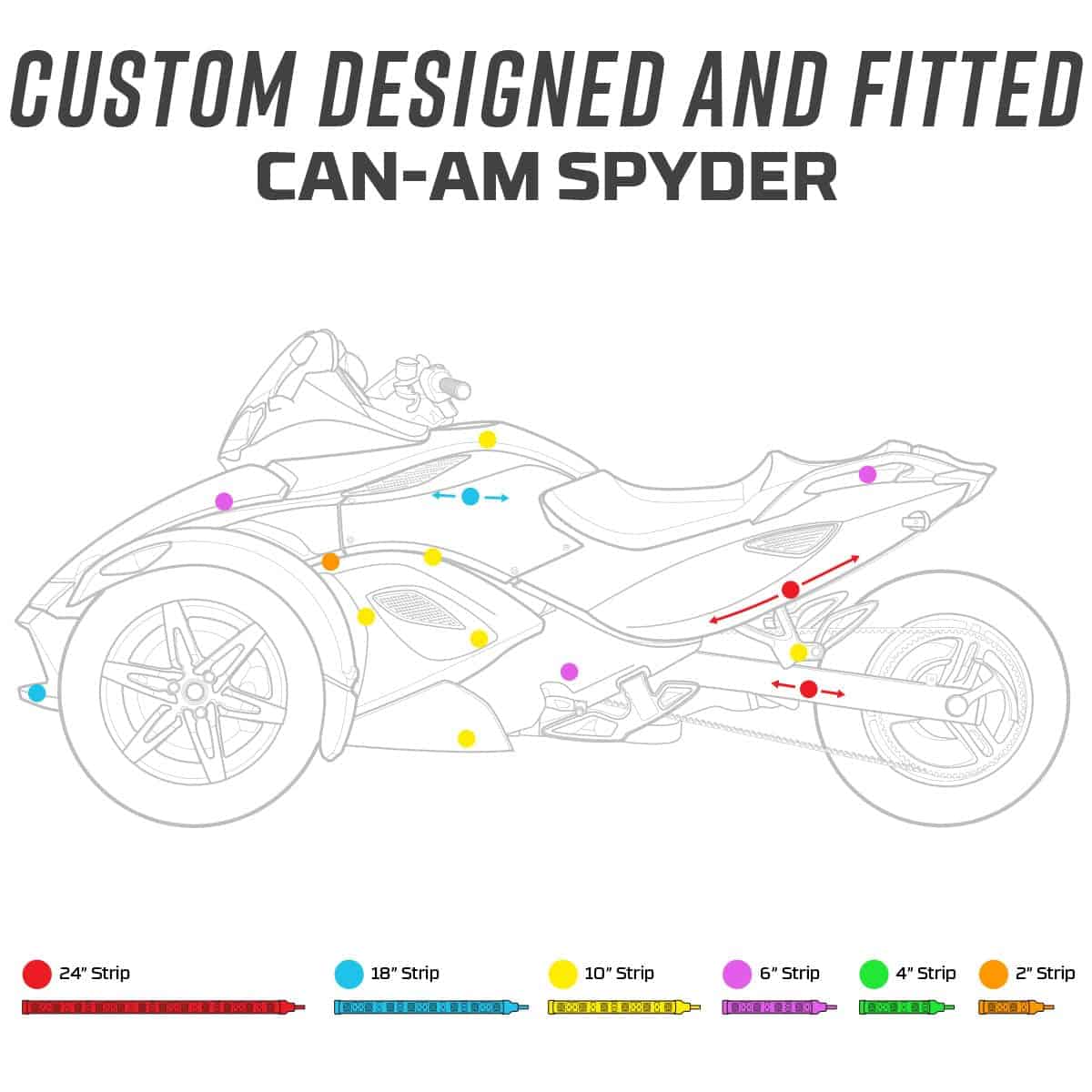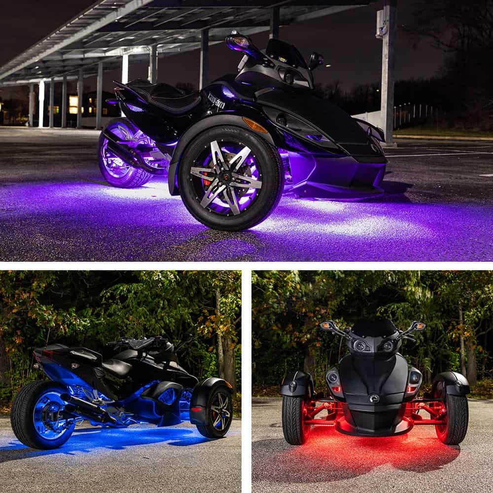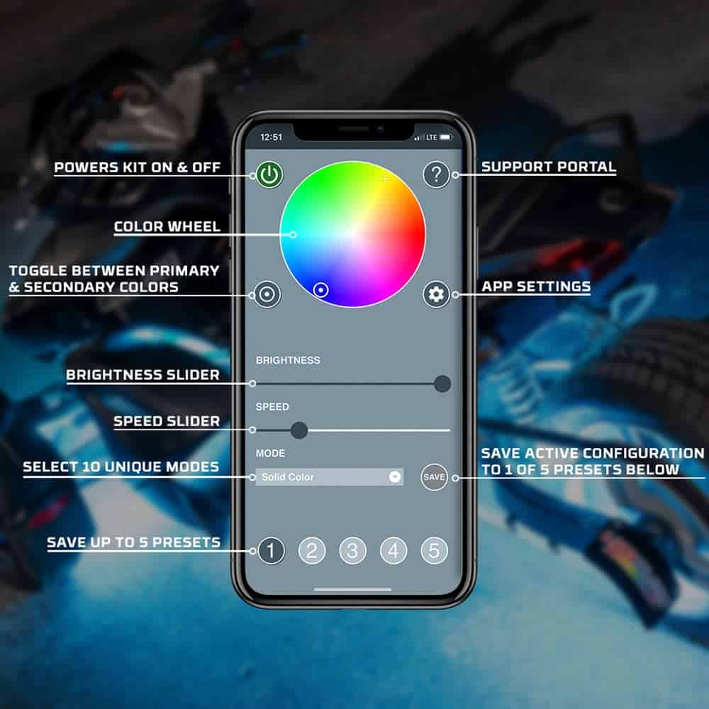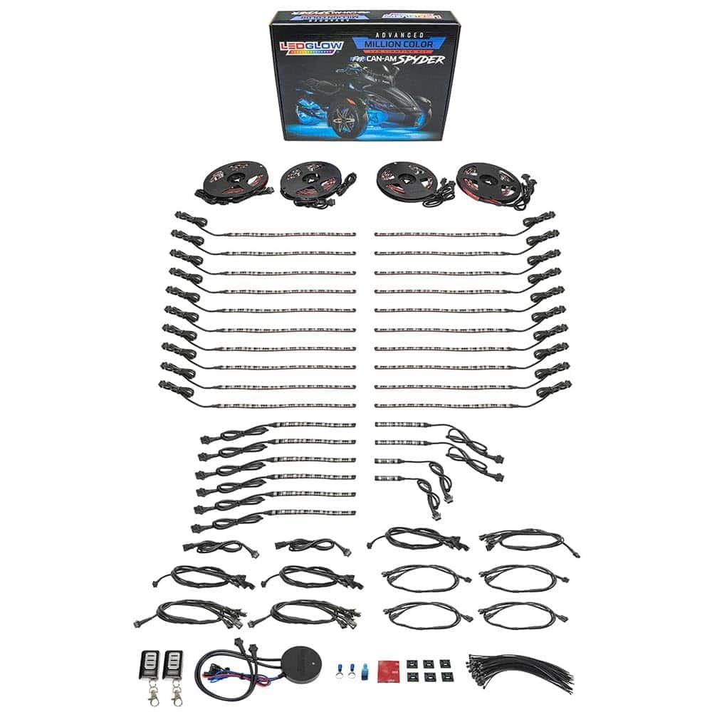 El Kit de iluminación LEDGlow 38pc Bluetooth de color multimillonario avanzado para motocicletas es compatible con Can-Am Spyder y combina tu dispositivo smartphone con luces de acento multicolores ultrabrillantes que transforman el aspecto y estilo de tu Spyder con unos simples gestos. La aplicación de control de motocicletas LEDGlow cuenta con un selector de color para elegir cualquier color sólido, 10 modos de iluminación únicos, 5 preajustes para guardar tus colores/patrones favoritos, control de zona dual para colores/patrones personalizados en 2 secciones, función de luces de freno automáticas que iluminan toda la motocicleta con LEDs rojos al unísono con las luces de freno, función de luces de peligro, apagado por bajo voltaje, disponible en iOS y Android. Incluye (2) 2″, (2) 4″, (6) 6″, (20) 10″, (4) 18″ & (4) 24″ tiras de iluminación flexibles que alojan 624 LED SMD, caja de control Bluetooth, 2 mandos a distancia inalámbricos, arnés de alimentación de tiras para motocicletas, (2) extensiones de cable de 3 pies, (10) paquetes de promotor de adherencia, 1-1/2′ de alambre por tira, bridas y una guía detallada de instalación que te guía en el proceso de instalación del kit y emparejar tu dispositivo smartphone con la caja de control Bluetooth. La caja de control presenta un chip Bluetooth 4.0 LE que se conecta perfectamente al smartphone, diseño a prueba de agua, compacto y fácil de ocultar bajo el asiento, capacidad para usar el kit con smartphone o mandos a distancia inalámbricos. Garantía de LEDGlow con garantía limitada de un año y soporte técnico gratuito de por vida.