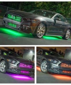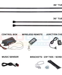 El nuevo y mejorado Kit de iluminación LEDGlow de 4 piezas de millón de colores SMD LED inalámbrico encaja universalmente 378 LEDs SMD de ángulo amplio ultra brillantes alojados en (2) tubos de bajo cuerpo de 46″ y (2) de 36″ en cualquier automóvil. Con un diseño de tubo de montaje plano con soportes de montaje claros de 15 grados angulados que ocupan menos espacio que el modelo anterior, este kit de iluminación de bajo cuerpo renovado produce un derrame de color mucho más brillante y fuerte que rodea la parte inferior del vehículo para un aspecto personalizado y llamativo! br br La caja de control incluida presenta (18) modos de colores sólidos, (12) patrones de iluminación únicos, (5) modos de activación de sonido, (5) niveles de velocidad y un modo de ciclo de color que utiliza los 18 colores sólidos diferentes. Cada patrón de iluminación se selecciona fácilmente usando el control remoto inalámbrico de 4 botones incluido o utilizando los botones correspondientes ubicados directamente en la caja de control. El sensor de música incluido se conecta en el lateral de la caja de control y permite que las luces de bajo cuerpo parpadeen al ritmo de la música que se reproduce dentro de su automóvil! La caja de control también recordará el último modo al que se configuró el kit de bajo cuerpo antes de que su vehículo se apague. Cada tubo de iluminación de bajo cuerpo cuenta con 13′ de cable de alimentación, con la excepción del tubo trasero de 36″ que cuenta con 18′ de cable de alimentación. Esto le permite tener más que suficiente cableado para enrutar los cables de alimentación a la bahía del motor donde se montará el cable de unión de bajo cuerpo. br br LEDGlow incluye hardware de montaje, instrucciones de instalación, soporte técnico gratuito de por vida y una garantía limitada de un año con cada compra.
