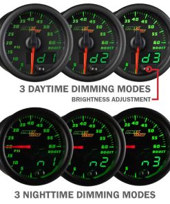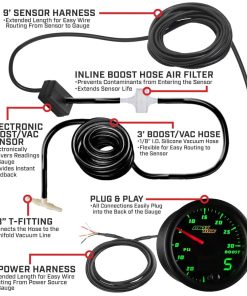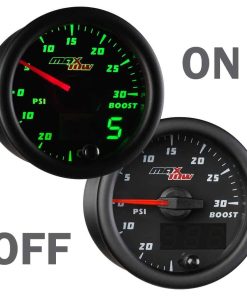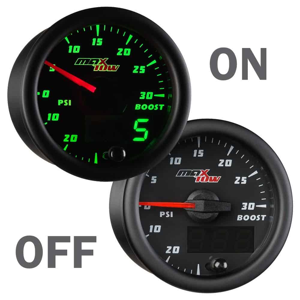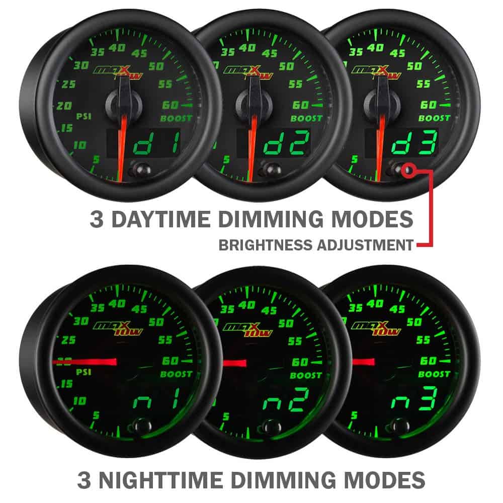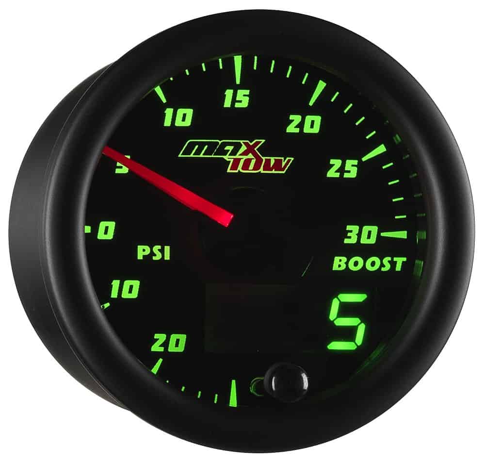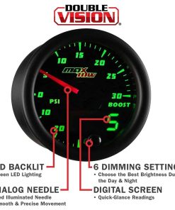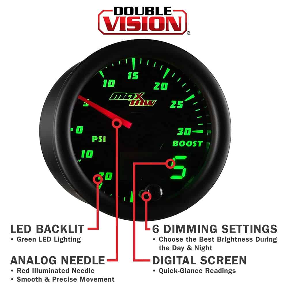 El indicador de doble visión de sobrealimentación/vaciómetro de MaxTow es un medidor de camión de gas de alto rendimiento y controlado electrónicamente que incluye un sensor de sobrealimentación electrónico que lee y muestra los niveles de presión de sobrealimentación de 0 a 30 PSI y niveles de compresión de -30 a 0 inHg con una precisión incomparable mientras elimina la necesidad de usar una manguera de vacío larga y una T. br br La serie de indicadores de doble visión de MaxTow cuenta con una pantalla LED verde, así como una aguja iluminada en rojo, que le brindará el aspecto clásico de un indicador analógico mientras le proporciona una lectura digital verde fácil de leer. ¡La serie de indicadores de doble visión ofrece múltiples opciones y mayor comodidad al leer la salida de su indicador de camión! Este indicador de sobrealimentación de 2 1/16 pulgadas (52 mm) supera a la competencia al presentar tecnología de motor paso a paso que permite que todo movimiento de aguja sea excepcionalmente suave y todas las lecturas del indicador sean extremadamente precisas, asegurando que las partes vitales de su camión funcionen correctamente. Este medidor de sobrealimentación también presenta innovadores modos de atenuación diurna y nocturna con tres ajustes de brillo personalizables (bajo, medio, alto) para cada modo. ¡Esto le brinda múltiples opciones de atenuación para configurar su preferencia individual cuando salga a la carretera durante el día o las últimas horas de la noche! La función de recuerdo de brillo incluida recordará el ajuste de brillo anterior que tenía antes de apagar su vehículo, para que no tenga que restablecerlo cada vez que encienda su vehículo. br br El indicador de sobrealimentación turbo de MaxTow cuenta con arneses de cableado extendidos tanto para la alimentación (3 pies) como para las conexiones del sensor de presión de sobrealimentación (9 pies), asegurando que tendrá suficiente cable para una instalación rápida y fácil. Todo el hardware de montaje del indicador e instrucciones de instalación vienen de serie con cada medidor de presión de sobrealimentación comprado, así como una garantía limitada de un año y soporte técnico gratuito de por vida.