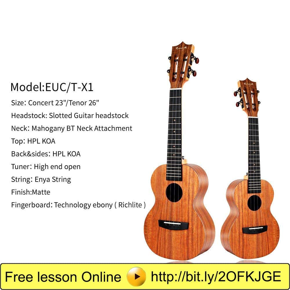 Garantía: Cada ukelele se inspecciona cuidadosamente antes del envío. Soporte al cliente de por vida, no dude en hacernos saber cómo podemos ayudarlo mejor. Sobre la música Enya: Tu viaje musical puede arruinarse fácilmente por un instrumento barato y de mala calidad. Enya Music se enfoca en proporcionar los instrumentos musicales hechos a mano más rentables a todos los amantes de la música, y hacer que la calidad sea mejor por menos. Especificaciones: Modelo EUT-X1 Tamaño Tenor 26″ Clavijero: Ranurado Mástil Caoba Conexión de Mástil BT Tapa HPL KOA Dorso y lados HPL KOA Diapasón Tecnología de Ébano Clavijero Clavijas de Máquina Abiertas Cuerdas Cuerdas Daddario Acabado: Mate Accesorios incluidos: Ukelele Tenor de 26 pulgadas 1 Estuche Premium 1 Púa 2 Correa 1 Afinador 1 Capo 1 Paño para Pulir 1 Juego Extra de Cuerdas 1 Maraca de Arena 1