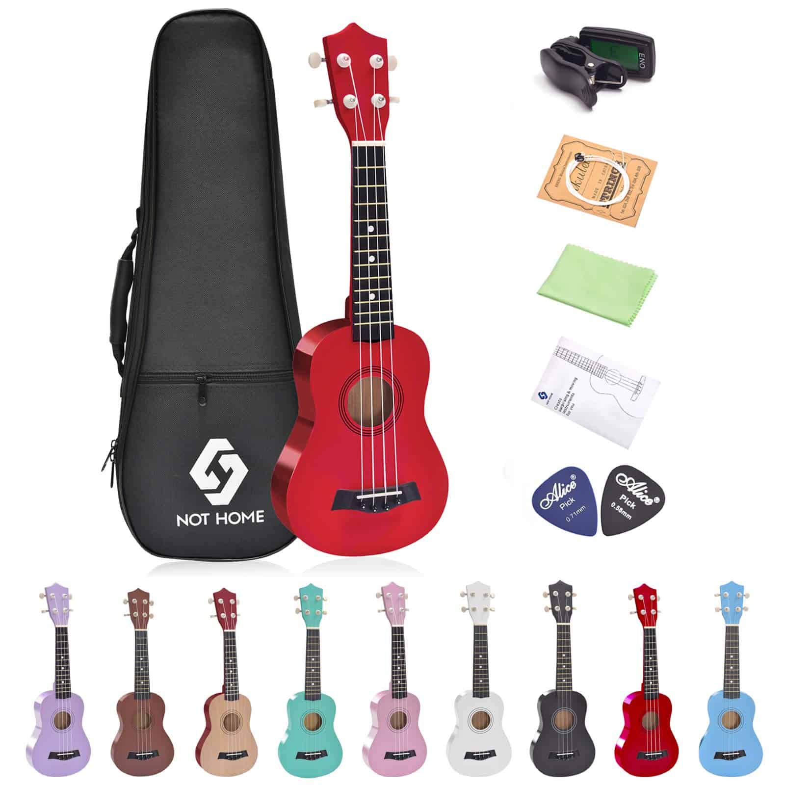 El Kit de Iniciación Soprano Ukulele NOT HOME de 21 pulgadas viene con todo lo que necesitas para empezar a tocar hoy. Nuestro ukulele para principiantes, excelente y cuidadosamente elaborado, tiene un cuerpo laminado de basswood, lo que significa que no es tan frágil ni tan susceptible a los cambios de temperatura y humedad como uno de madera maciza. Además, ofrece una resonancia bastante buena y una entonación precisa. Tamaño de 21 pulgadas adecuado para llevarlo contigo cuando vayas de camping o de viaje. Puedes tocarlo donde quieras cuando despliegues el bolso, en la playa con el sol, en el parque, en casa, jardín, etc. Cómo afinar el ukulele: La afinación estándar en Do incluye cuerdas afinadas en Sol Do Mi La (de izquierda a derecha cuando sostienes el ukulele recto y mirando hacia adelante). Es posible que necesites afinar el ukulele varias veces hasta que la fuerza y la afinación se estabilicen. Esta adaptación puede durar unos días, variando según la temperatura y humedad. (Por cierto, será más fácil afinar el uku con nuestro afinador digital). Descripción del Producto: Material: Basswood en la parte superior, trasera y madera maciza en el mástil. Tamaño: 21 pulgadas Ukulele Hawaiano. Diseño y fabricación de alta calidad: Diapasón de madera, textura natural, alta resistencia a la corrosión, difícil de deformar. Diseño de cuerpo de barril, líneas suaves. Disfruta de la música: Libera tu mente siguiendo el ritmo dulce, comparte tu felicidad con tu familia y amigos, pasa tu belleza a los transeúntes. Paquete que incluye: – 1 Ukulele Soprano de 21 pulgadas – 1 bolso duradero y conveniente – 1 Afinador Digital (batería incluida) – 4 Cuerdas originales de repuesto – 1 Libro de instrucciones – 2 Púas de repuesto (los colores se envían al azar)