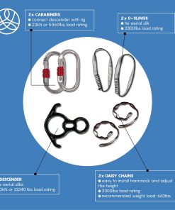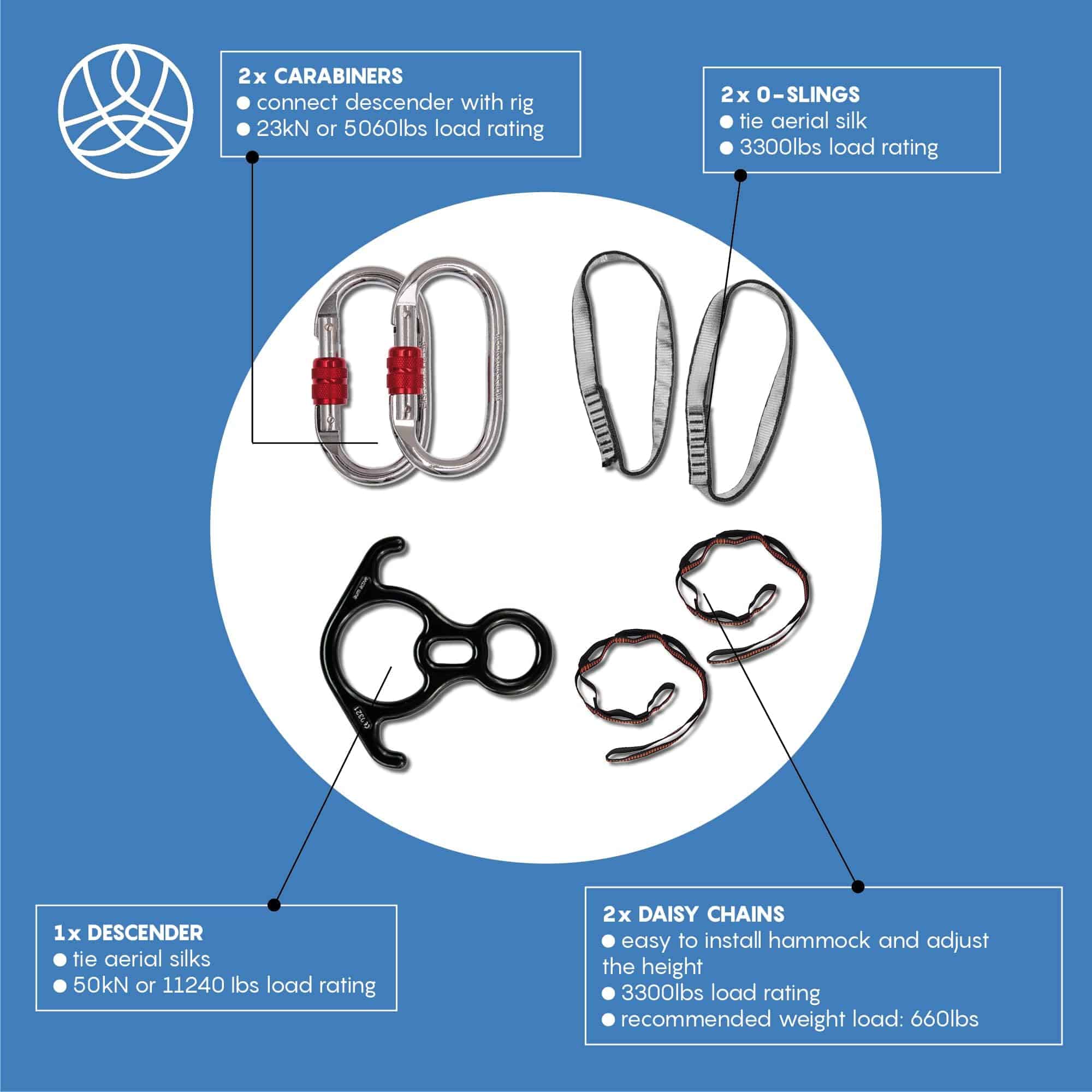 Siéntete seguro al realizar escaladas y descensos con nuestro hardware de grado de escalada. Nuestras telas aéreas pueden soportar hasta 1800 lbs y los accesorios pueden soportar más de 3000 lbf, brindándote la tranquilidad de poder realizar tus movimientos con seguridad.