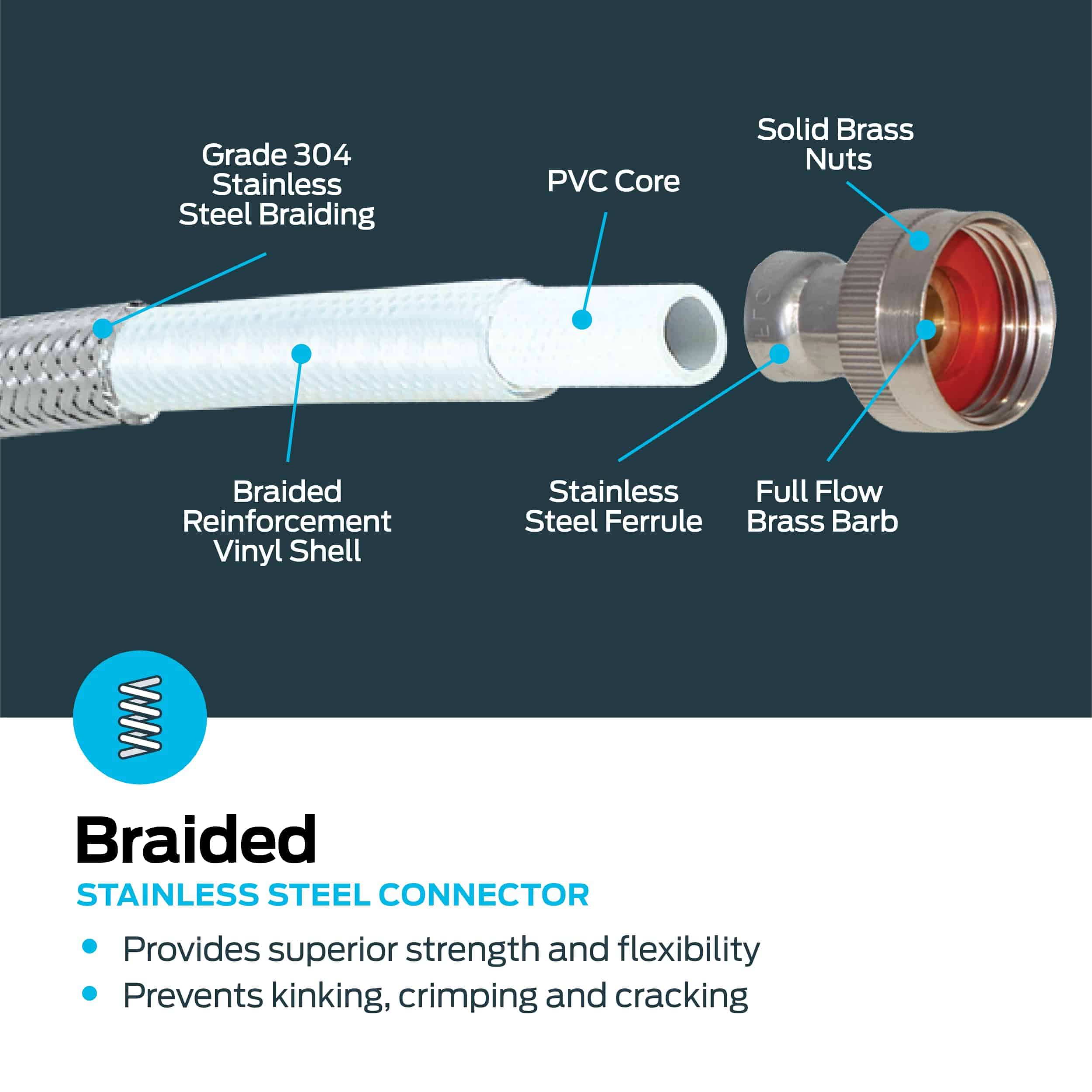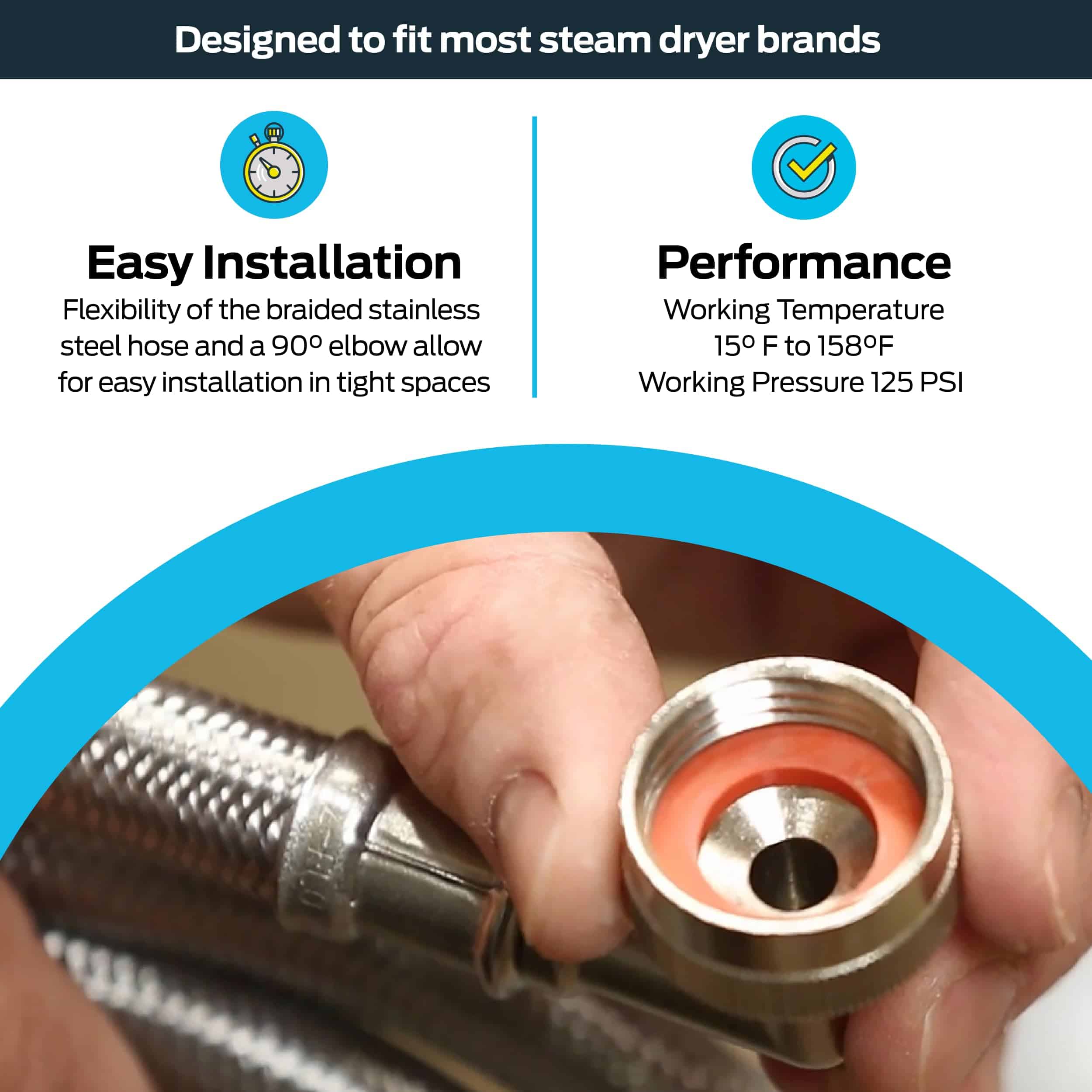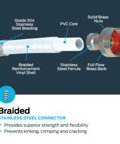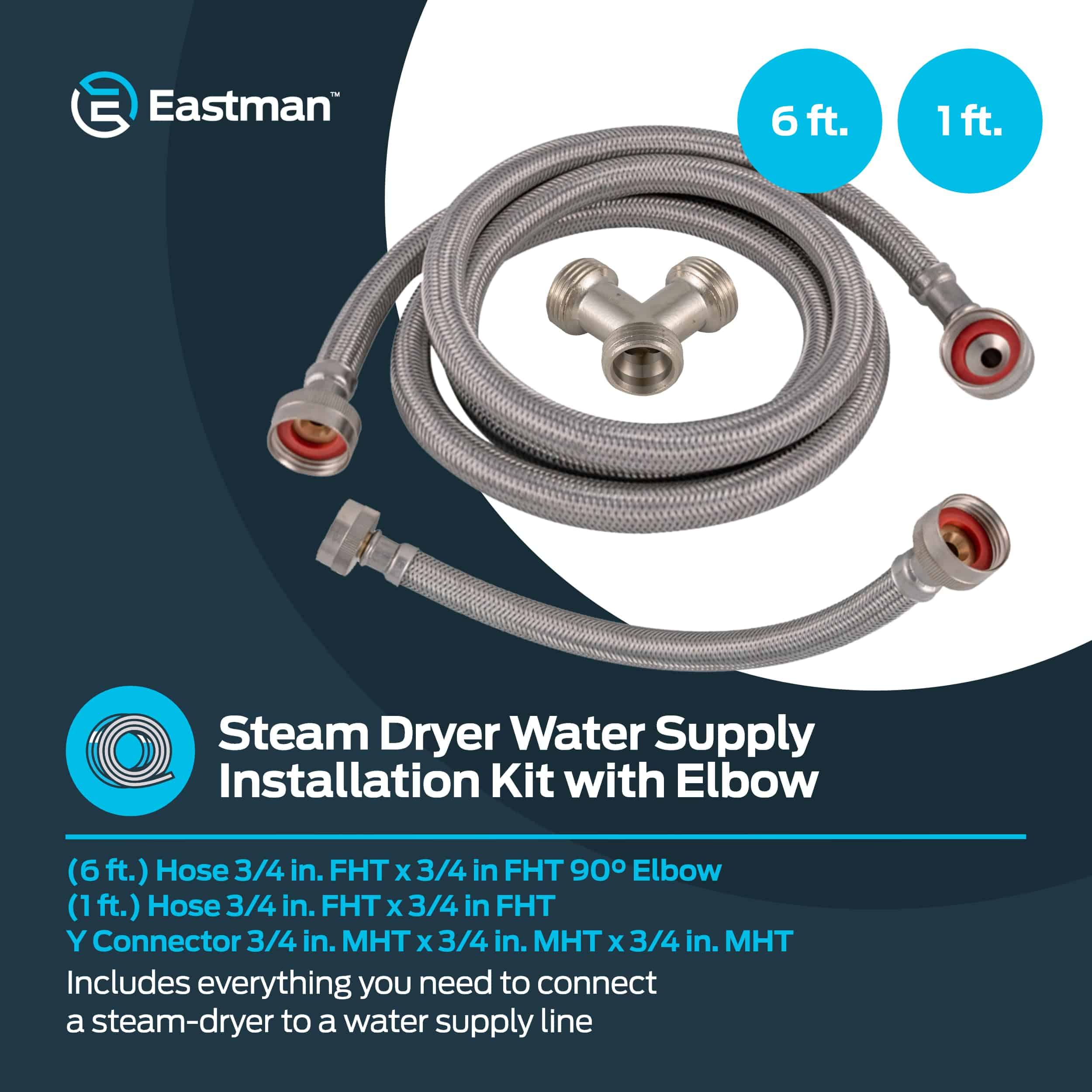 Simplifica tus proyectos de fontanería con este kit de conexión en Y de acero inoxidable trenzado para secadora de vapor. El kit de división en Y de secadora de vapor incluye (1) manguera de llenado de secadora de vapor de 6 pies, (1) manguera de conexión de 1 pie y (1) adaptador Y; cada extensión de manguera de secadora de vapor presenta una conexión de hembra de 3/4 de pulgada x hembra de 3/4 de pulgada para permitir una instalación fácil. Estas mangueras de secadora de vapor ofrecen un rendimiento superior para una conexión confiable y sin fugas, y las mangueras de agua de secadora de vapor están diseñadas para soportar un flujo completo y alta presión, con una temperatura de trabajo de 15 grados F a 158 grados F. Cada línea de secadora de vapor está construida con acero inoxidable trenzado resistente y robusto para evitar el doblado y crimpado, es resistente a la corrosión y está garantizada de no reventar. El kit de conexión de secadora de vapor está equipado con un codo de 90 grados para una instalación fácil y suave en un espacio reducido y alivia la tensión en la manguera. Las mangueras de secadora de vapor miden 6 pies de longitud y son compatibles con la mayoría de las marcas de secadoras de vapor.