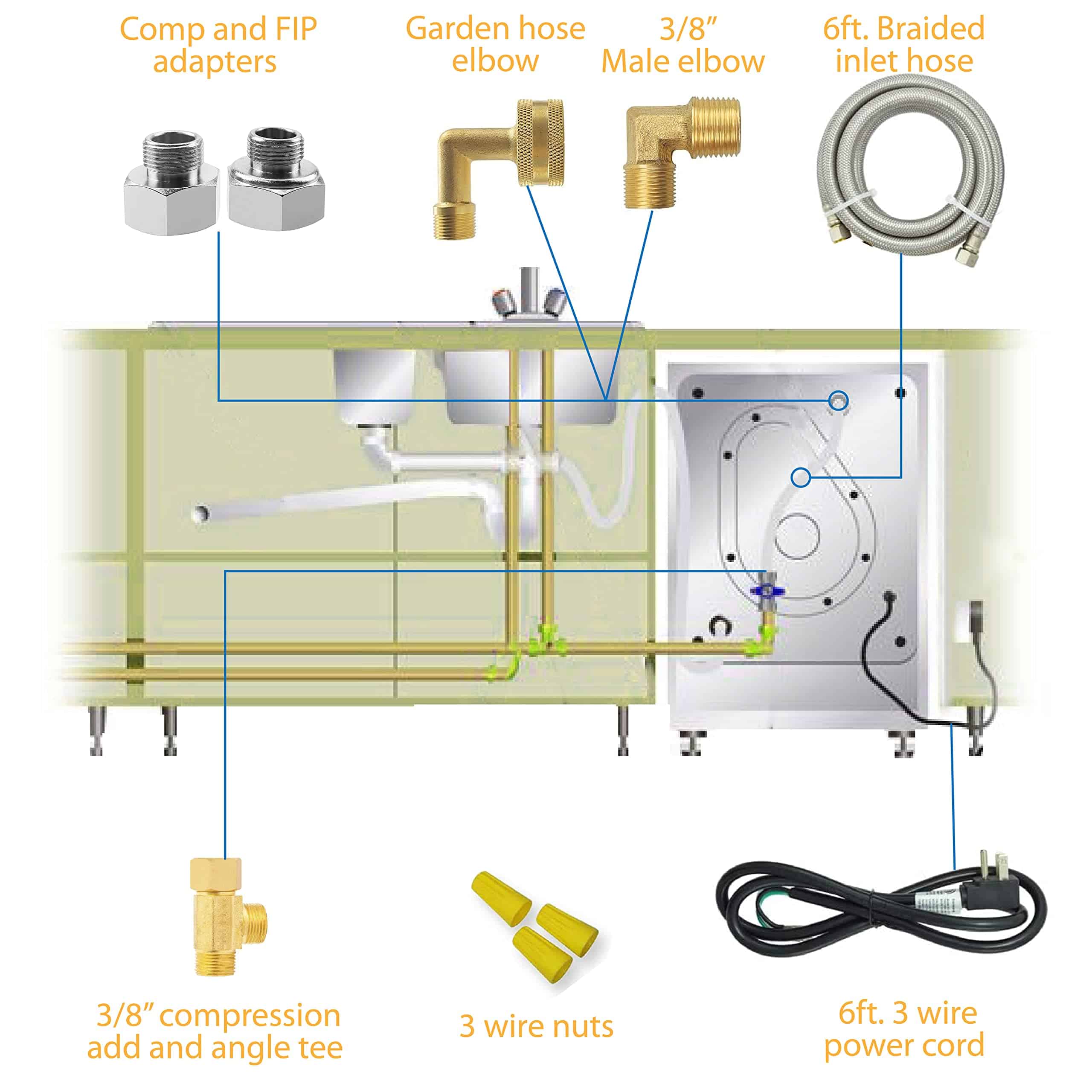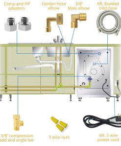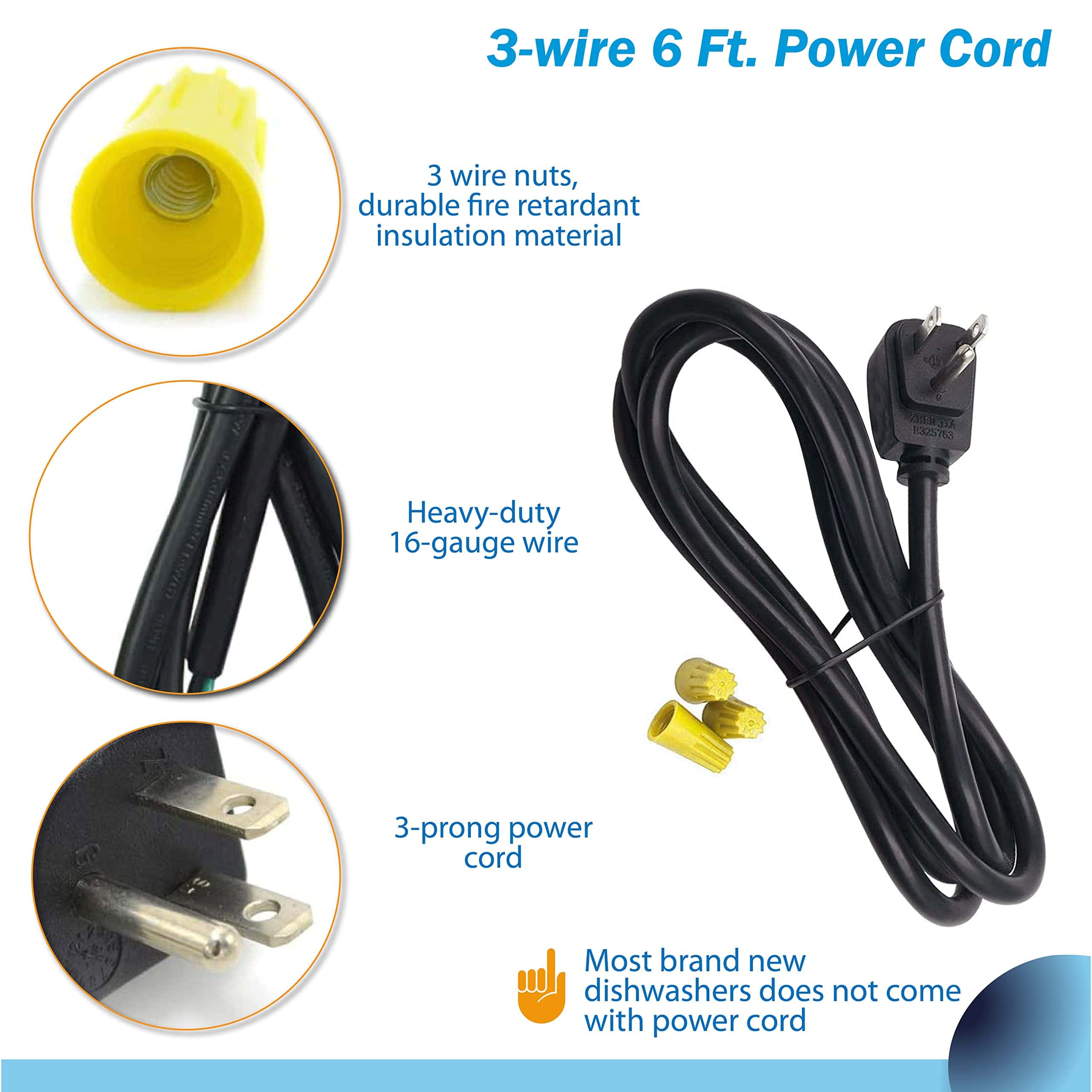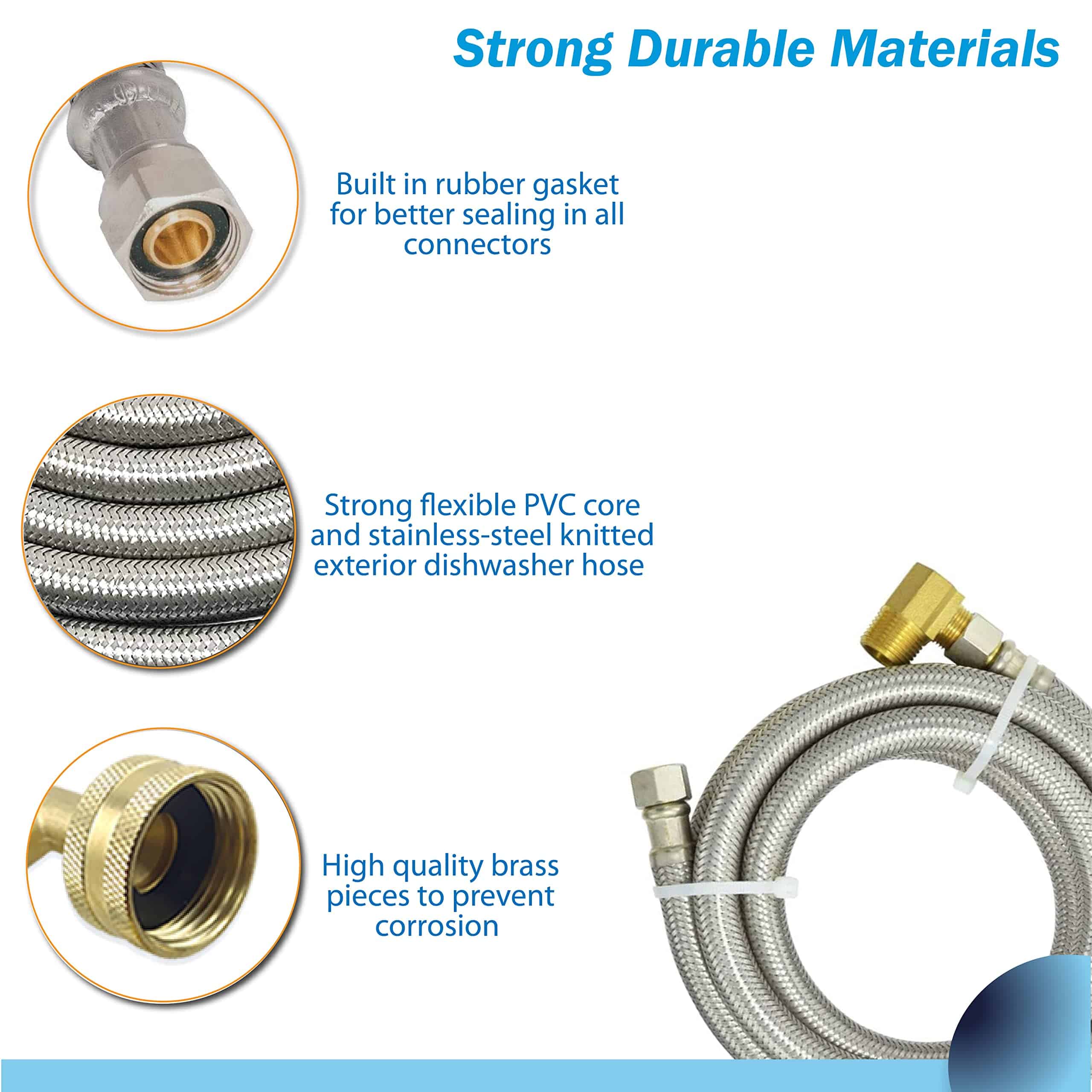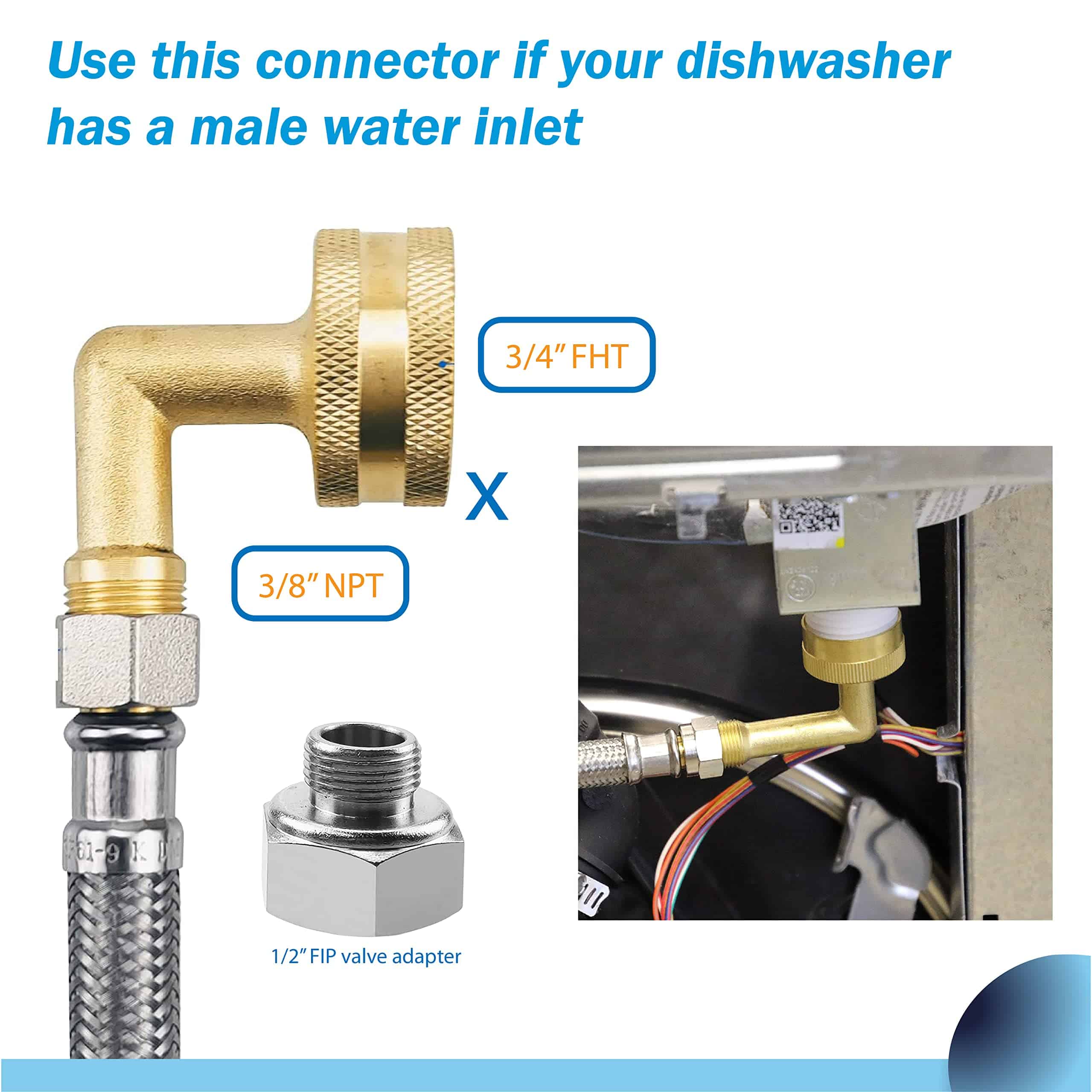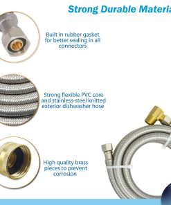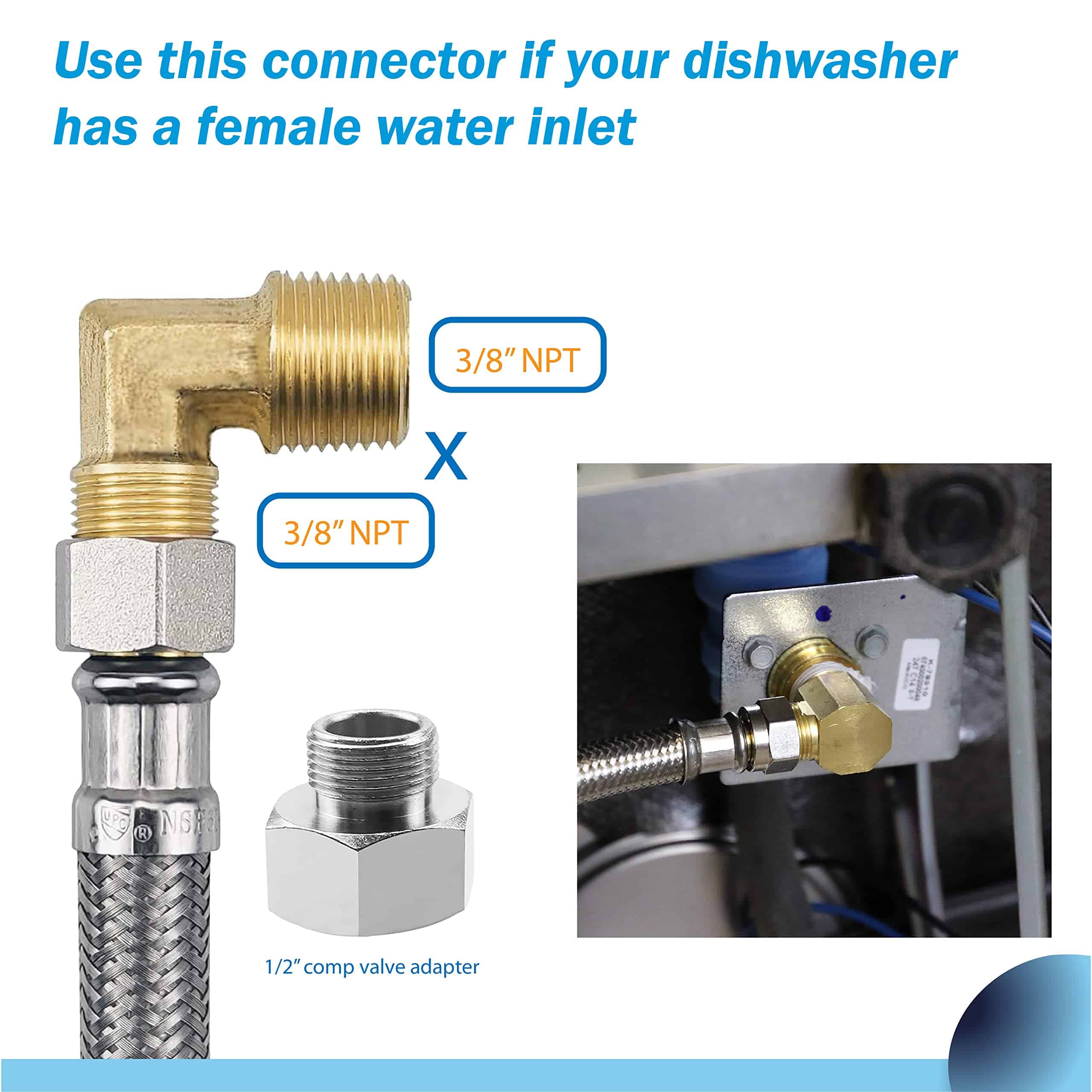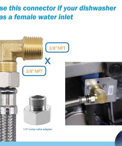 Kit de instalación para lavavajillas, diseñado especialmente para lavavajillas residenciales. Materiales fuertes y duraderos: -Manguera trenzada: Núcleo de PVC flexible resistente y exterior de acero inoxidable premium que previene el anudamiento y la deformación. Aún después de doblarse repetidamente, mantiene su forma original. Diseño a prueba de roturas. -Codo de compresión y codo FHT: Piezas de latón resistente al óxido de alta calidad, fáciles de limpiar y mantener. -Válvula de ángulo para dividir la salida de agua añadiendo un accesorio de T: Esta válvula añade una salida en un ángulo a la válvula de parada de la lavadora de platos en caso de que necesite otra salida. Tiene una entrada de compresión de 3/8 pulgadas x dos salidas de compresión de 3/8 pulgadas. Material de latón que proporciona ductilidad a altas temperaturas y baja permeabilidad magnética, más duradero que los productos de hierro y galvanizados. Kit de instalación para lavavajillas más completo: -Cable de alimentación recto de 6 pies -Manguera de agua de 6 pies -Codo de 3/8 pulgadas MIP -Codo de 3/4 pulgadas FHT -3 tuercas de cable -Válvula en T de ángulo de compresión de 3/8 pulgadas -Adaptador de válvula de compresión de 1/2 pulgadas -Adaptador de válvula FIP de 1/2 pulgadas