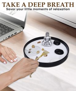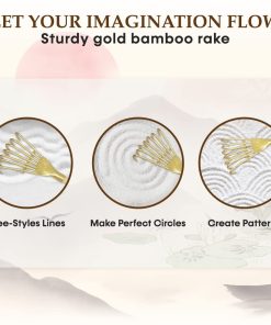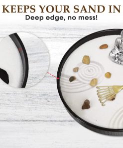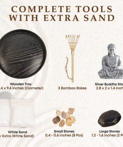 Relájate y toma un corto descanso con tus herramientas de jardín zen para escritorio. Haz patrones y alivia la ansiedad y el estrés con nuestros completos accesorios y herramientas de jardín zen japoneses. Set de 9.4″ que incluye rastrillo, bandeja de jardinería de arena estable con accesorios de roca como juego de herramientas de meditación de mesa para el hogar. Dale nuestra caja de arena zen a tus seres queridos que necesitan relajarse. Excelente jardín zen de meditación de escritorio para despejar la mente y elevar el estado de ánimo. Bandeja de escritorio de jardín de arena zen de madera de alta calidad para contener la arena sin derramarse cuando rastrille. Mejora la concentración mientras trabajas con tu jardín zen de mesa para escritorio. Nuestro mini kit de jardín zen viene con 8 piedras pequeñas, 1 estatua de buda, 2 piedras grandes, rastrillo y arena adicional para jardines zen. Usa tu mini jardín zen de arena para escritorio para relajarte. Exhibe tu set de jardín zen para el hogar en casa, la oficina, la sala de estar o el dormitorio, ya que tu decoración japonesa zen simplista se adaptará a tu interior y elevará tu positividad.