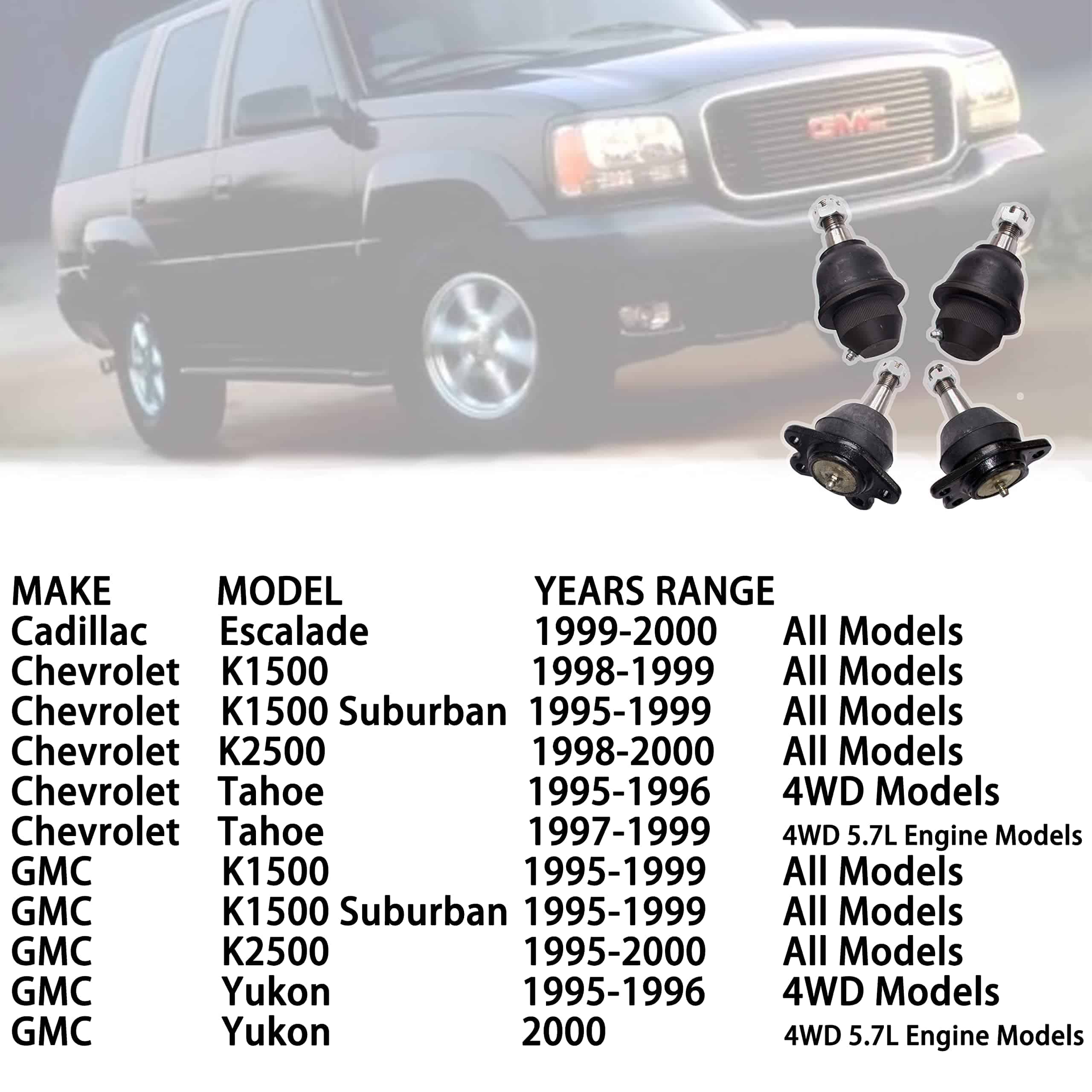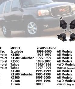 Compatible: Escalade 99 00 Todos los modelos; K1500 98 99 Todos los modelos; K1500 Suburban 95 96 97 98 99 Todos los modelos; K2500 98 99 00 Todos los modelos; Tahoe 95 96 Modelos 4WD; Tahoe 97 98 99 Modelos 4WD 5.7L Engine; K1500 95 96 97 98 99 Todos los modelos; K1500 Suburban 95 96 97 98 99 Todos los modelos; K2500 95 96 97 98 99 00 Todos los modelos; Yukon 95 96 Modelos 4WD; Yukon 00 Modelos 4WD 5.7L Engine