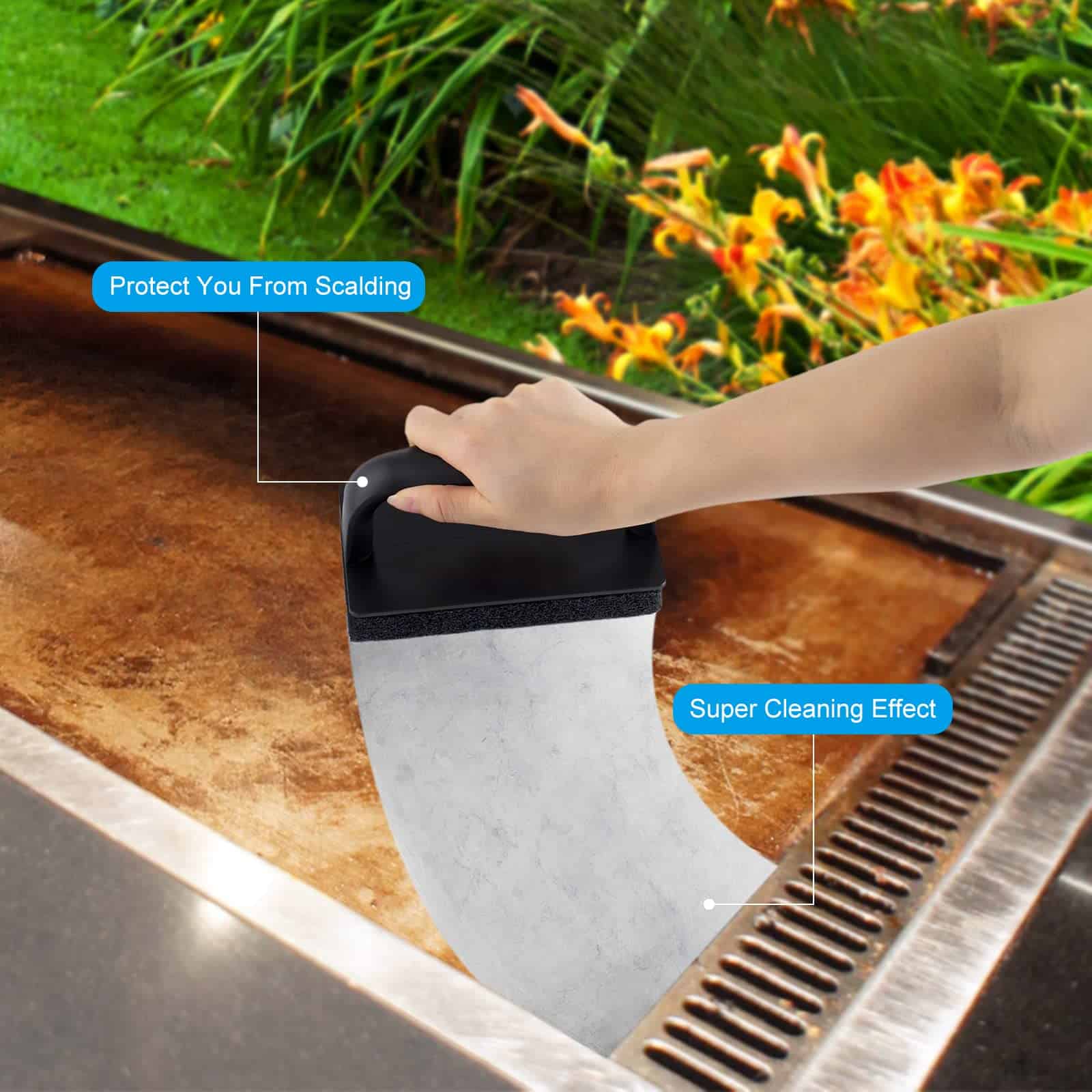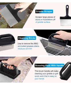 Cada conjunto de bloques de limpieza para plancha contiene 3 ladrillos grises para plancha y 1 mango, fácil de instalar y más seguro, lo protege de la superficie caliente de la parrilla durante la limpieza de la parrilla. El raspador de plancha de metal resistente está hecho de acero inoxidable de 1,5 mm y el mango está hecho de PP de alta calidad, reutilizable y duradero. Los 5 estropajos son reemplazables, para limpieza o condimento. Nuestras piedras de parrilla de barbacoa están hechas de piedra pómez ecológica natural, no te harán daño. Tamaño perfecto para una operación con una sola mano y amigable con espacios pequeños como rejillas y parrilla de hierro fundido o plancha Blackstone. Se recomienda remojar la piedra de plancha con agua antes de limpiar. Este kit de limpieza Blackstone viene con 1 raspador de parrilla, 1 mango de almohadilla de limpieza, 10 almohadillas de limpieza, 3 ladrillos grises para plancha y 1 mango. Prometemos brindar un servicio postventa 100% amigable para garantizar que use nuestro limpiador de piedras planas de parrilla Blackstone sin problemas.