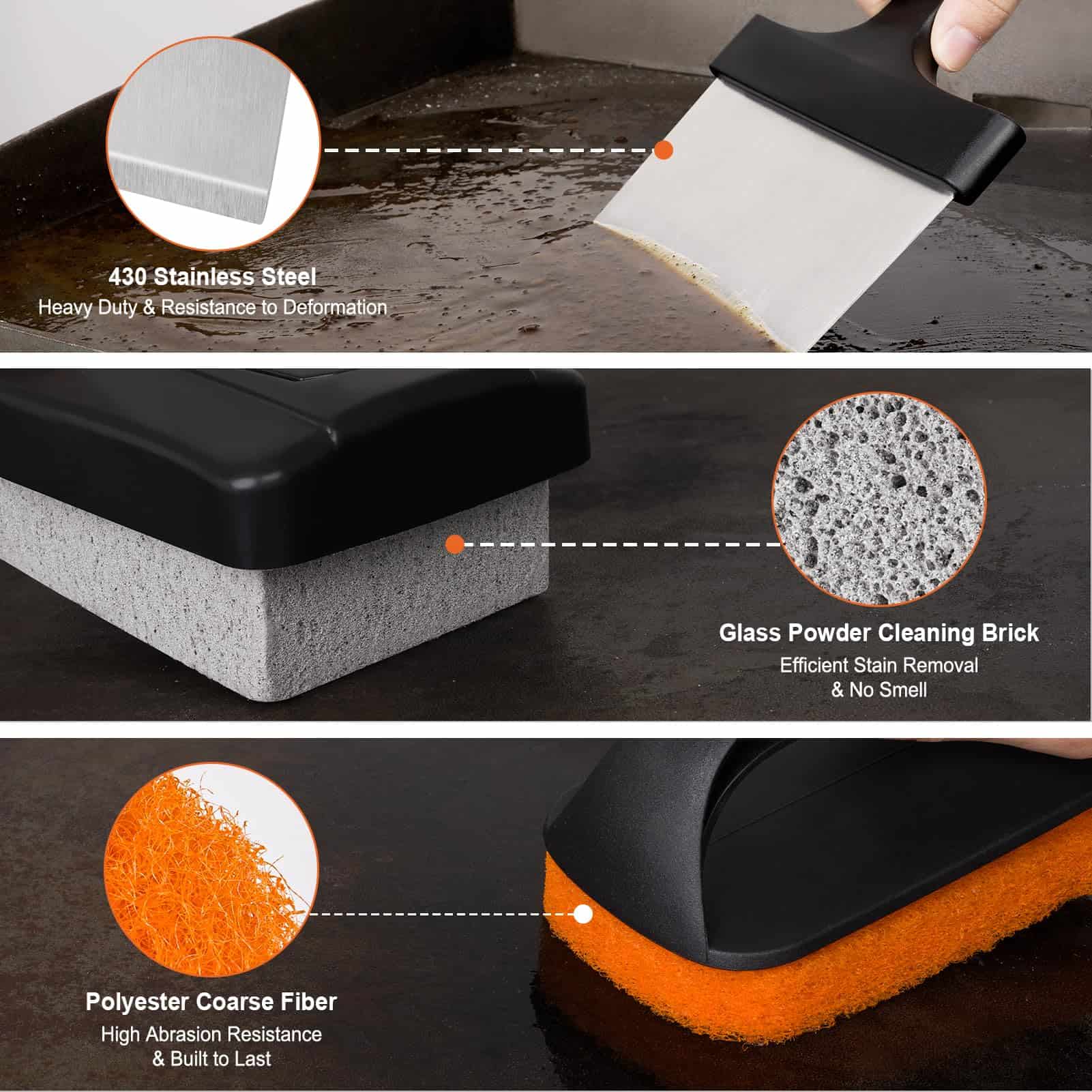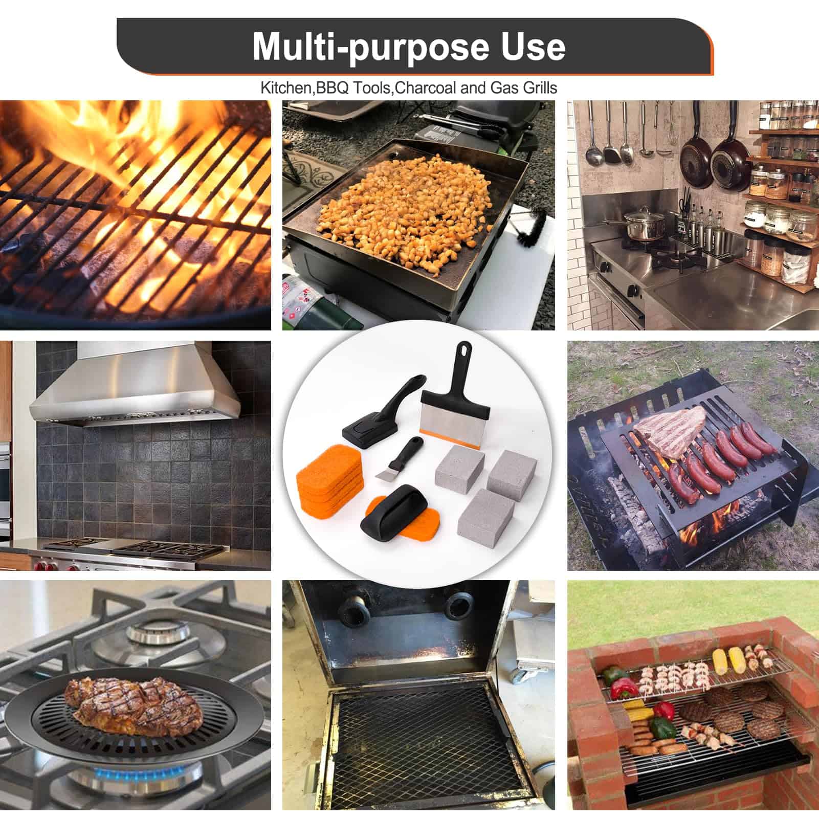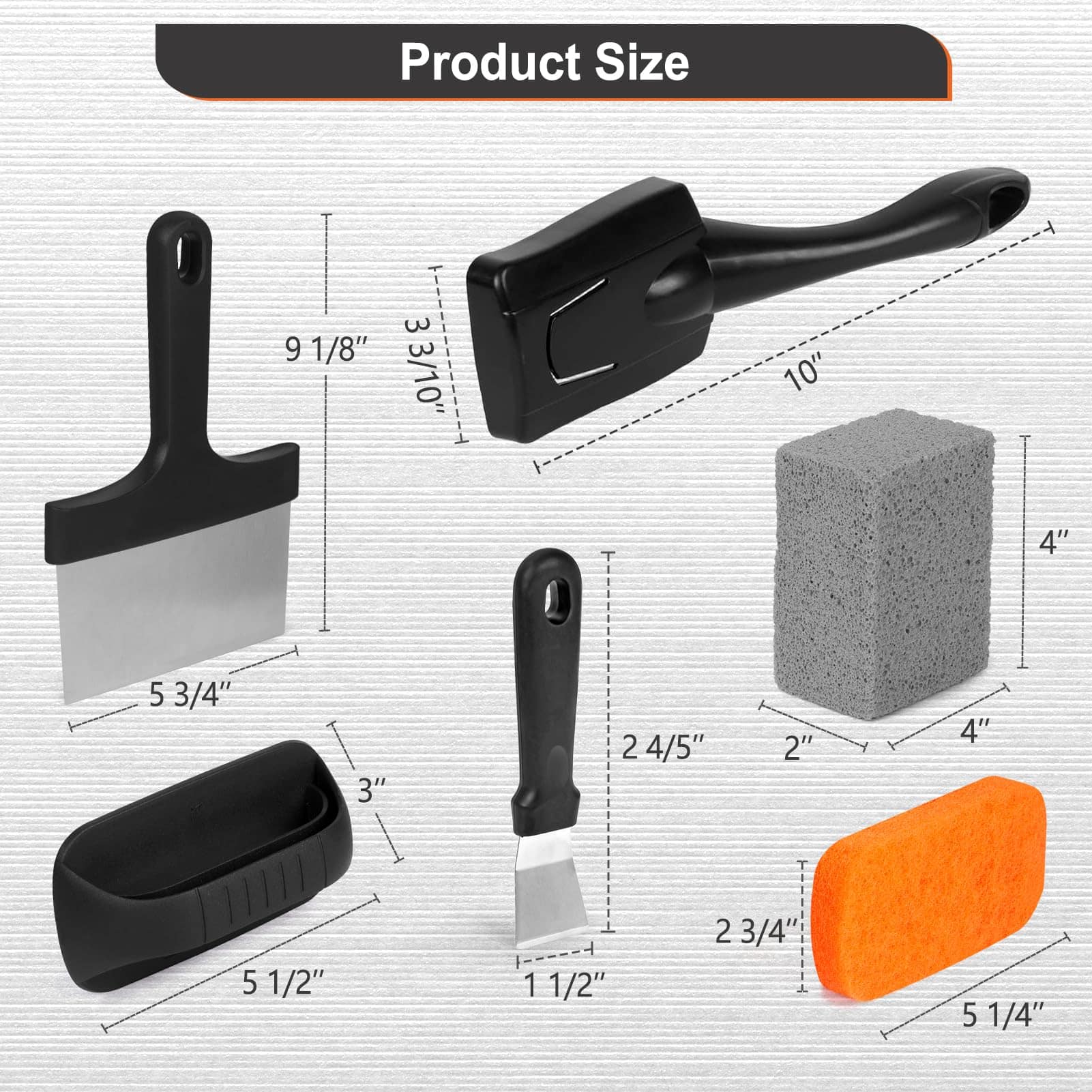 La rasqueta de alta resistencia elimina eficazmente los restos de la sartén y elimina los residuos de alimentos y grasa de su parrilla plana, y una rasqueta más pequeña para esos bordes complicados y lugares estrechos, manteniendo su superficie de cocción limpia y lista para la próxima comida. Los raspadores de BBQ también se pueden utilizar para picar alimentos. Los bloques de limpieza, fabricados con materiales naturales y seguros, eliminan eficazmente la grasa y la suciedad obstinadas de las planchas de hierro fundido y acero inoxidable, sin rayar sus superficies de cerámica o metal. Las esponjas con mango, hechas al 100% de poliéster, son ideales para eliminar restos de alimentos, grasa y manchas sin causar arañazos, ayudando a que su plancha se mantenga como nueva. El mango asegura una limpieza fácil y eficiente, protegiendo sus manos. Para obtener los mejores resultados, permita que la plancha se enfríe antes de usar. Este juego se presenta de forma elegante en un empaque y es un regalo ideal para los entusiastas de la parrilla. Adecuado para la mayoría de las planchas y parrillas al aire libre, ayuda a mantener el equipo de cocina limpio y listo para usar. Perfecto tanto para profesionales como para parrilleros de fin de semana casual.