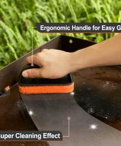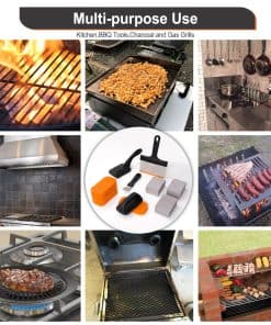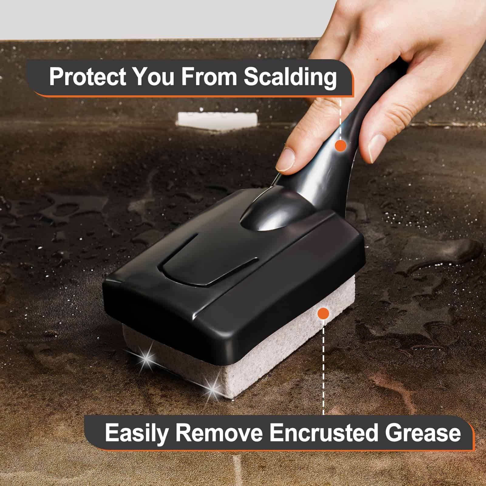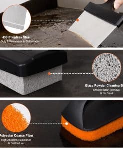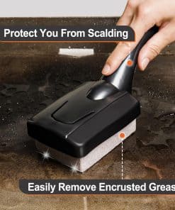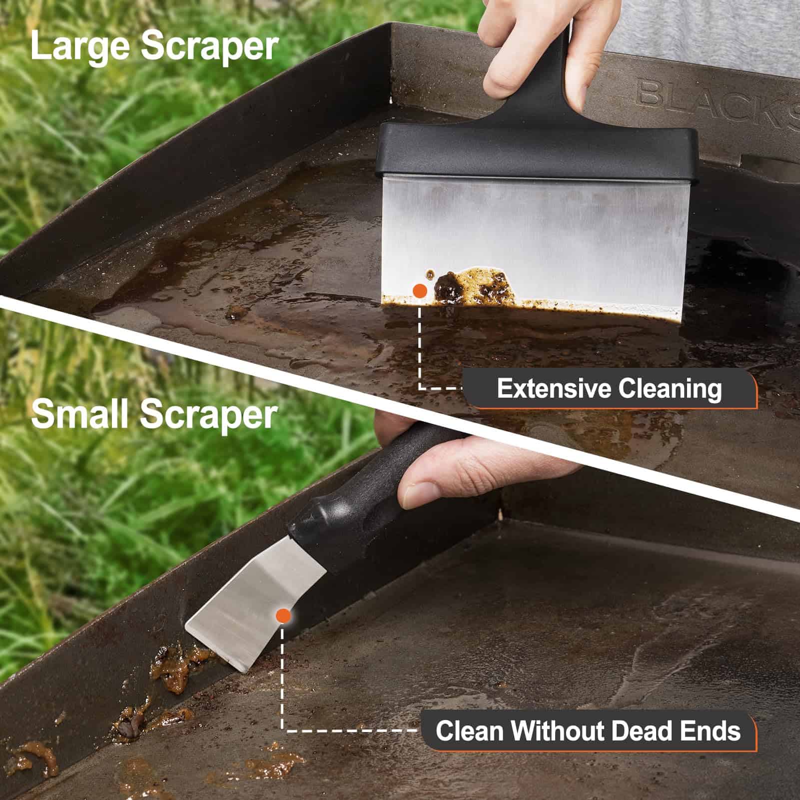 La rasqueta de alta resistencia elimina eficazmente los restos de la sartén y elimina los residuos de alimentos y grasa de su parrilla plana, y una rasqueta más pequeña para esos bordes complicados y lugares estrechos, manteniendo su superficie de cocción limpia y lista para la próxima comida. Los raspadores de BBQ también se pueden utilizar para picar alimentos. Los bloques de limpieza, fabricados con materiales naturales y seguros, eliminan eficazmente la grasa y la suciedad obstinadas de las planchas de hierro fundido y acero inoxidable, sin rayar sus superficies de cerámica o metal. Las esponjas con mango, hechas al 100% de poliéster, son ideales para eliminar restos de alimentos, grasa y manchas sin causar arañazos, ayudando a que su plancha se mantenga como nueva. El mango asegura una limpieza fácil y eficiente, protegiendo sus manos. Para obtener los mejores resultados, permita que la plancha se enfríe antes de usar. Este juego se presenta de forma elegante en un empaque y es un regalo ideal para los entusiastas de la parrilla. Adecuado para la mayoría de las planchas y parrillas al aire libre, ayuda a mantener el equipo de cocina limpio y listo para usar. Perfecto tanto para profesionales como para parrilleros de fin de semana casual.