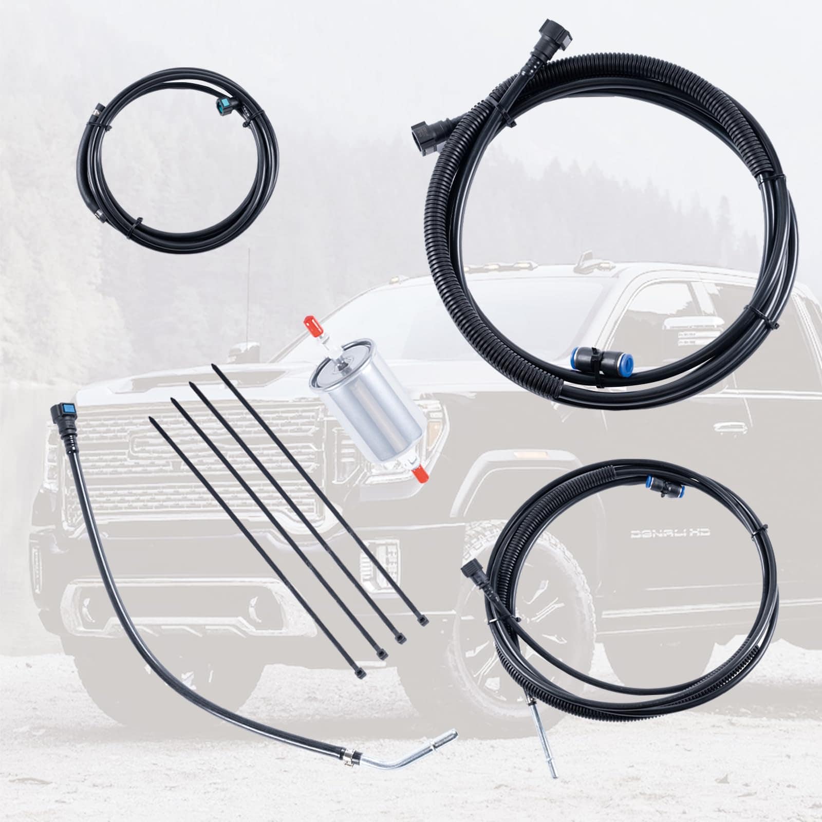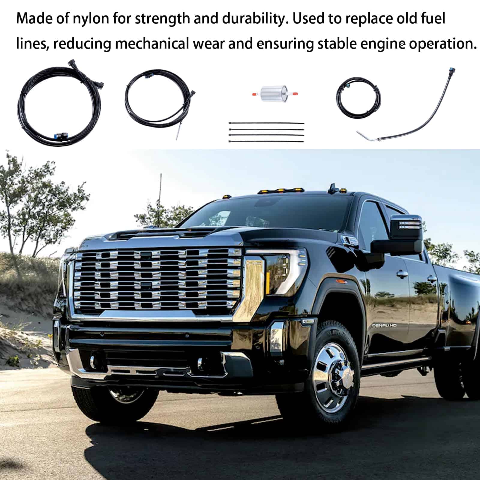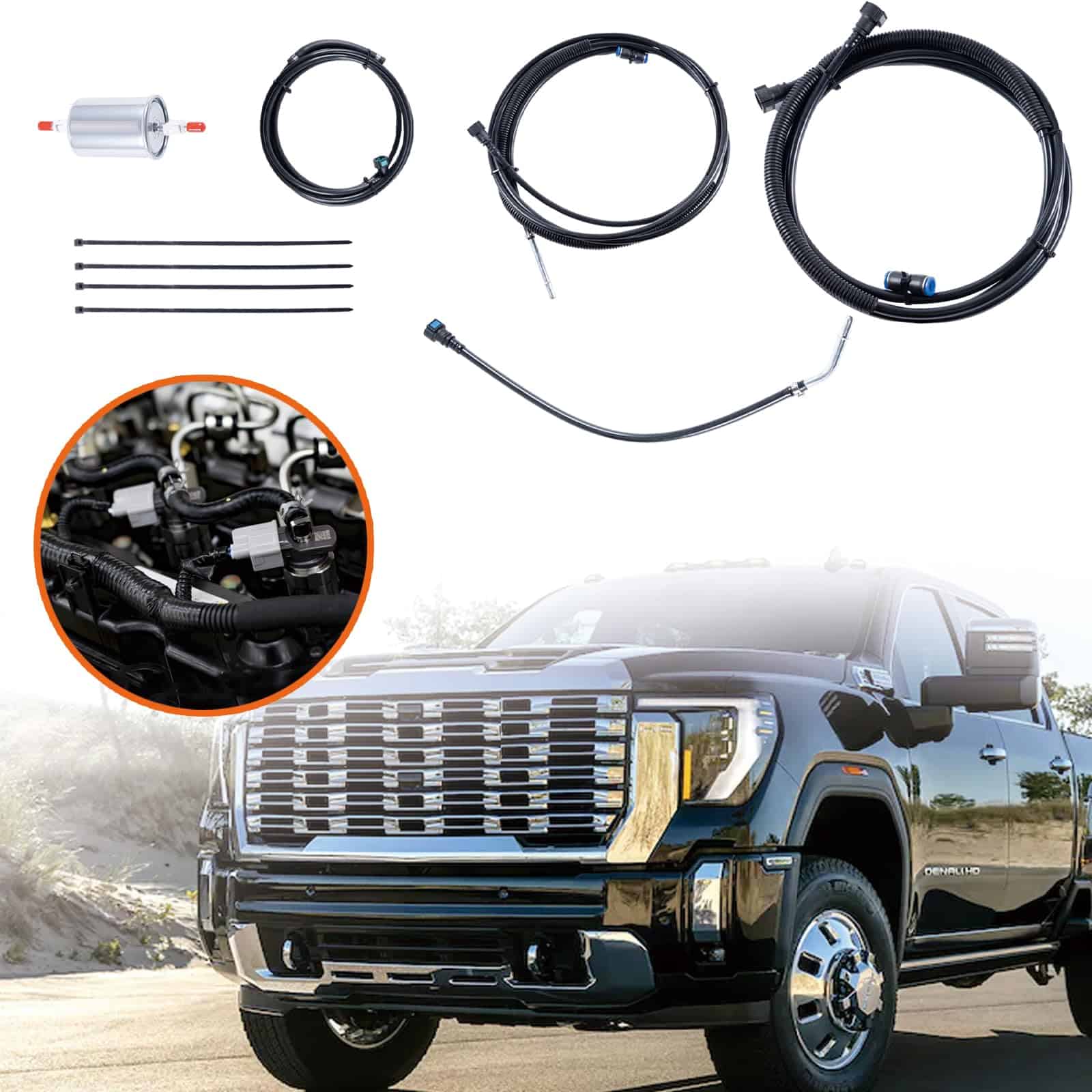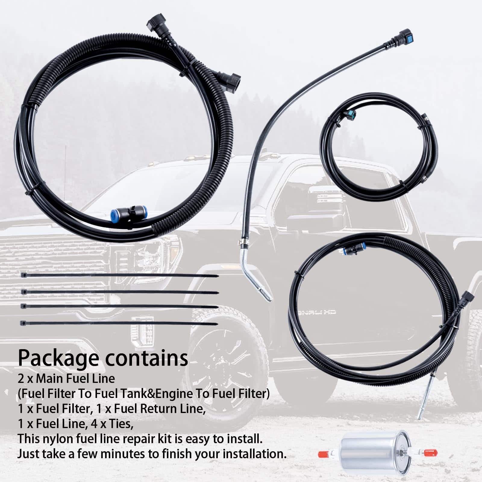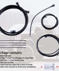 – 2 Líneas Principales de Combustible (Filtro de Combustible al Tanque de Combustible y del Motor al Filtro de Combustible), 1 Filtro de Combustible, 1 Línea de Retorno de Combustible, 1 Línea de Combustible, 4 Corbatas