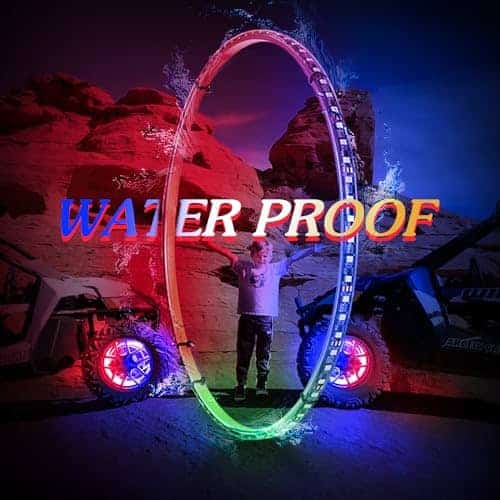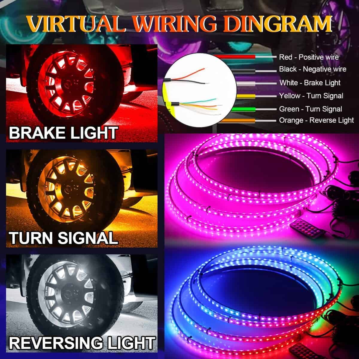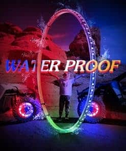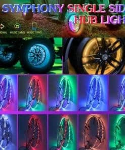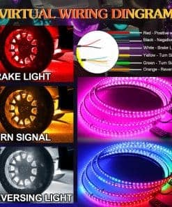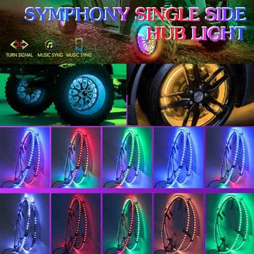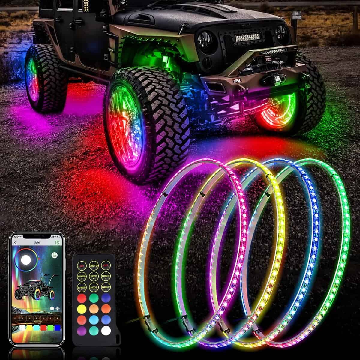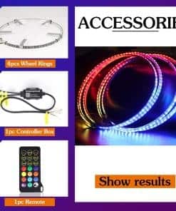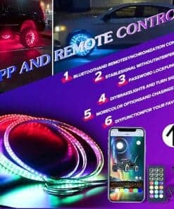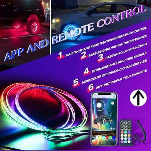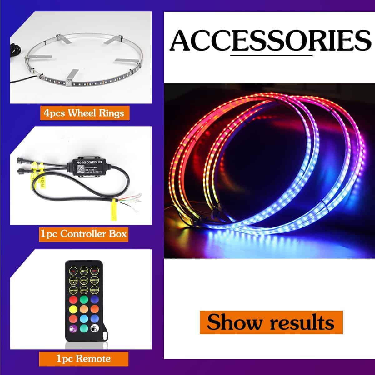 Nuevo con Característica que Puede ser Controlado por Control Remoto y Aplicación Bluetooth al Mismo Tiempo, la Operación es Más Conveniente, Puedes Cambiar el Modo de Control a Voluntad. Incluye Sincronización de Música, Ajuste de Velocidad y Brillo, e Incluso Crear tus Propios Patrones DIY! Tiene Colores de Baile y perseguidores, Combinaciones de Colores al Azar o Personalizados, Haciendo que tu Vehículo sea único. El Color del Giro Puede ser Determinado por tu Propia Preferencia – Rojo o Ámbar, la Frecuencia de Parpadeo Rojo de la Luz de Freno También Puede ser Configurada por Tí Mismo. Hecho de Construcción Impermeable IP67 y Sólida de Aluminio Fundido a Presión, resistente a Golpes / Polvo / Oxidación. Diámetro Exterior de las Luces de Anillo para Ruedas es de 15,5 pulgadas; Diámetro Interior de las Luces de Anillo para Ruedas es de 14,5 pulgadas. Fácil de Instalar Luces de Anillo para Ruedas LED RGB que se pueden Instalar Directamente en el Escudo de Polvo o Conjunto del Cubo, Revoluciona la Apariencia de tu Coche o Camión con Iluminación LED Potente y Efectos de Iluminación Innovadores que se Combinan para Crear una Apariencia y Sensación Completamente Únicas para tus Luces de Anillo para Ruedas. Incluye 4PCS Luces de Anillo para Ruedas RGB con Cables, 1PC Caja de Control, Instrucciones de Cableado, 1PC Control Remoto, 20PCS Soportes de Montaje.