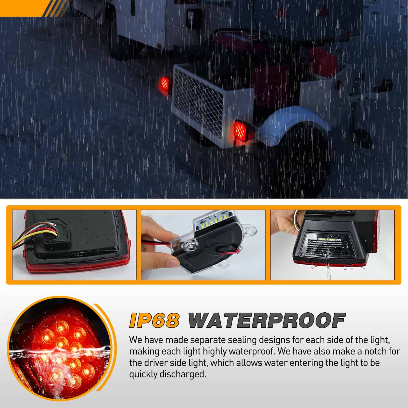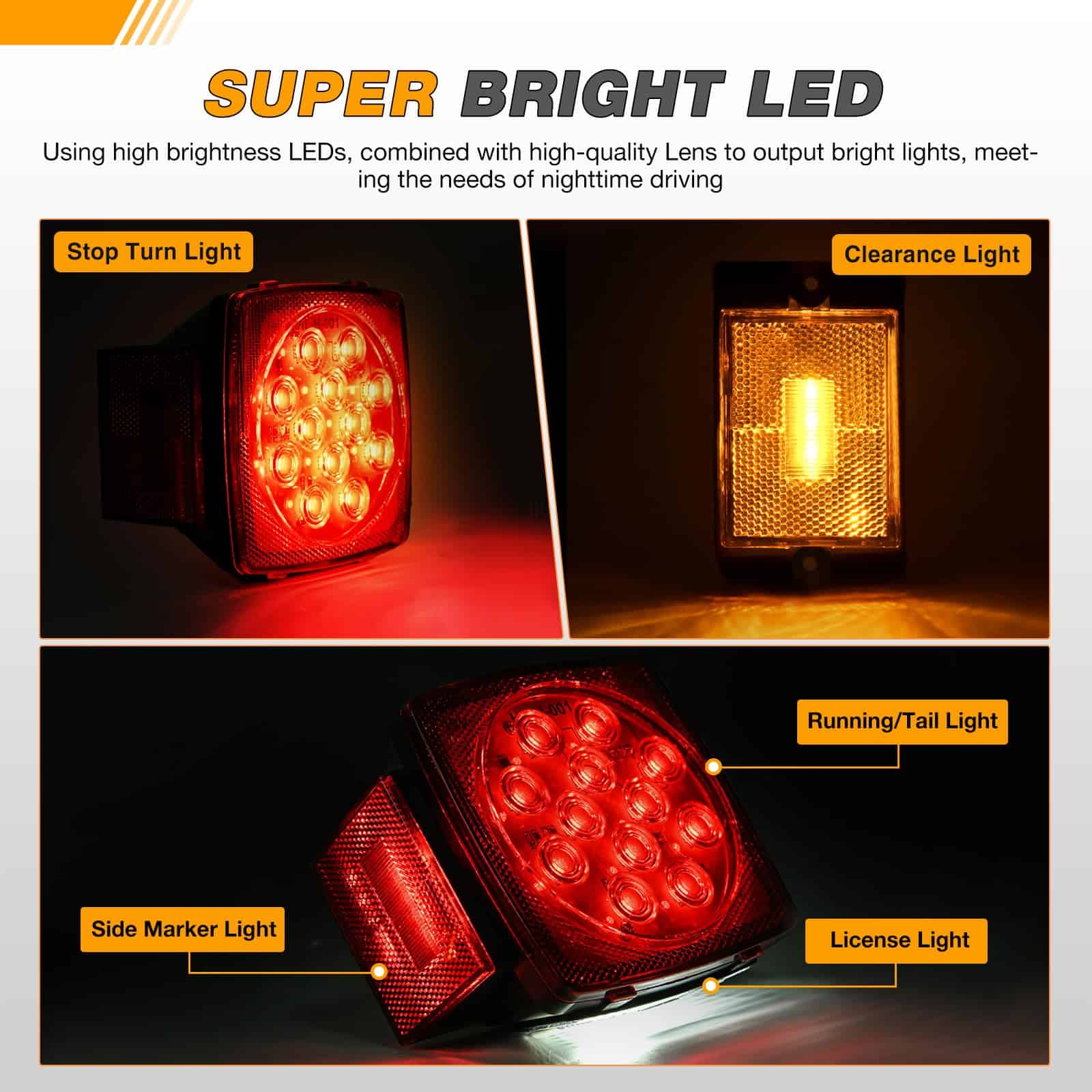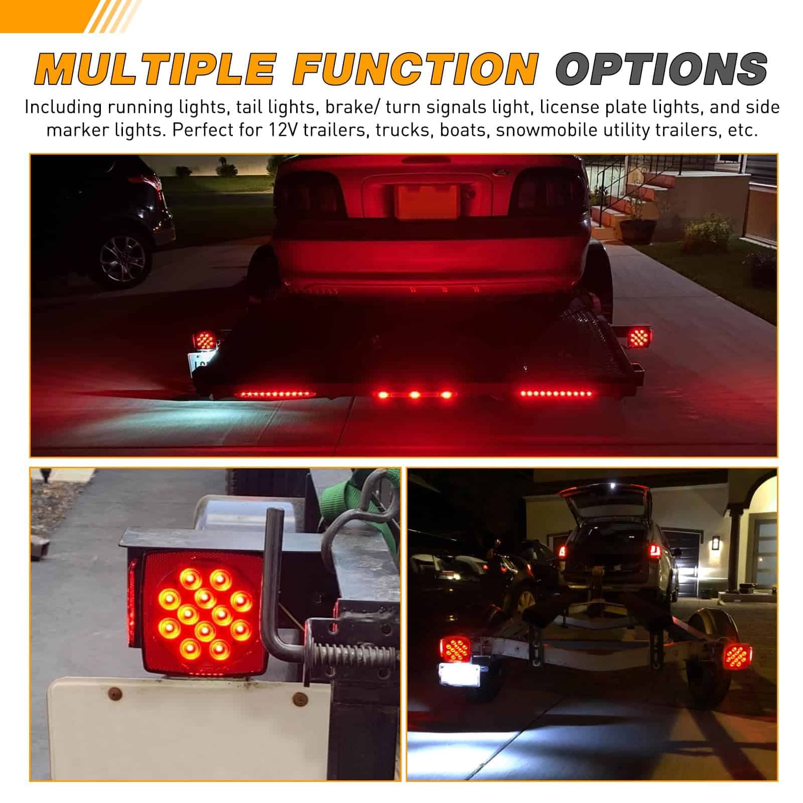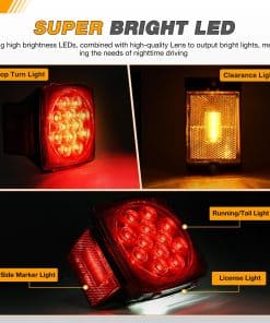 5. Funciones Múltiples: Funciones combinadas de luz de parada, luz de giro, luz de cola, marcador lateral, luz de matrícula. Perfecto para vehículos de 12V DC con un ancho máximo de 80 pulgadas. Se adapta a la mayoría de remolques, barcos, camiones, RV, vehículos marinos, camionetas, campistas, tractores, autobuses, camiones, furgonetas, caravanas, motos de nieve y remolques utilitarios.