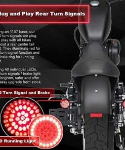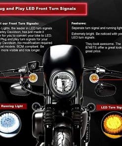 «LUCES DE GIRO DELANTERAS DE LED – Diseño completamente nuevo. Nuestras luces de giro delanteras de LED tienen un anillo halo de 24 LED como luz de marcha. Los 24 LEDs internos son ámbar y funcionan como la luz de giro. El anillo halo es de 6000K de luz blanca pura y brillante. El color del anillo halo se combinará con todos tus otros productos LED. El 8748TS permite una luz de giro LED más brillante al desactivar el anillo halo LED blanco cuando activas tu luz de giro. Esto permite que la luz de giro ámbar sea más visible y vibrante. LUCES DE GIRO TRASERAS – Este kit incluye Luces de Giro Traseras 1157 de LED. Necesitarás las Luces de Giro Traseras 1157 si no tienes una luz de freno central trasera. Cuentan con 48 LEDs rojos en total para una luz de giro, luz de marcha y luz de freno altamente visible. Los 24 diodos externos se iluminan como un anillo halo para la luz de marcha. Los 48 diodos se iluminan para una luz roja de giro y freno brillante.»