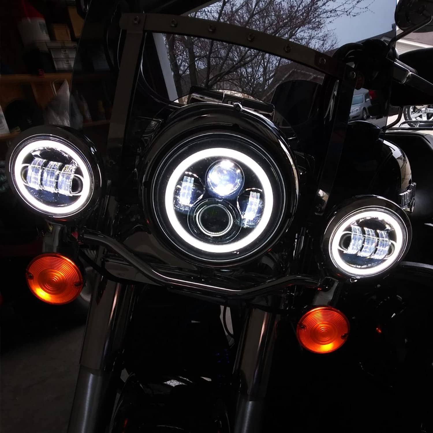 3. COMPATIBILIDAD Se ajusta a cualquier motocicleta con faro de 7 pulgadas y luces de niebla de 4.5 pulgadas. Incluye Road King, Street Glide, Ultra Classic, Electra Glide, Heritage Softail, Softail Deluxe, Softail Slim, Fatboy, Switchback, Ultra Limited, Tri, CVO, 1989-2019. NOTA: Switchback, Road King, Street Glide, Electra Glide y Ultra Limited necesitan un anillo para fijarse firmemente, el «Street Glide Special» y «Road King Special» de «2014 a 2019» necesitan un adaptador H4 a H9 (NO INCLUIDO).