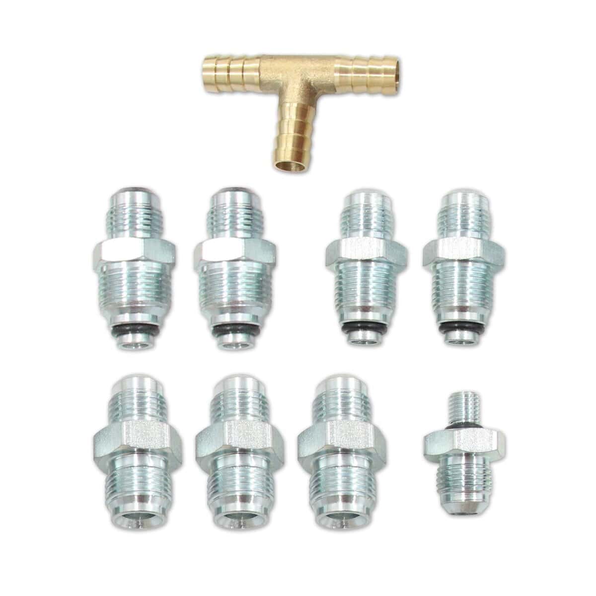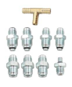 2 adaptadores de 5/8″ inverted flare a -6AN; 1 adaptador de 11/16″ inverted flare a -6AN; 1 adaptador de 5/16″-24 O-ring a rosca hembra de -6AN
