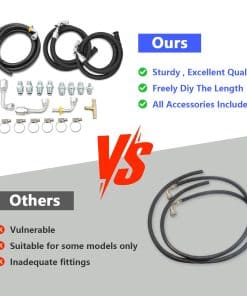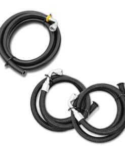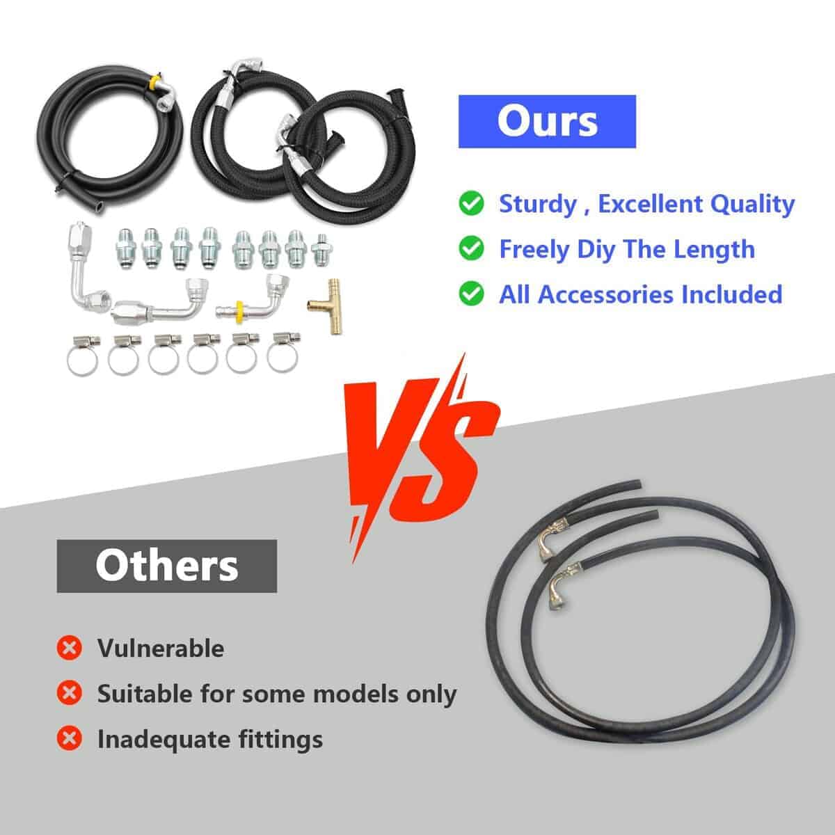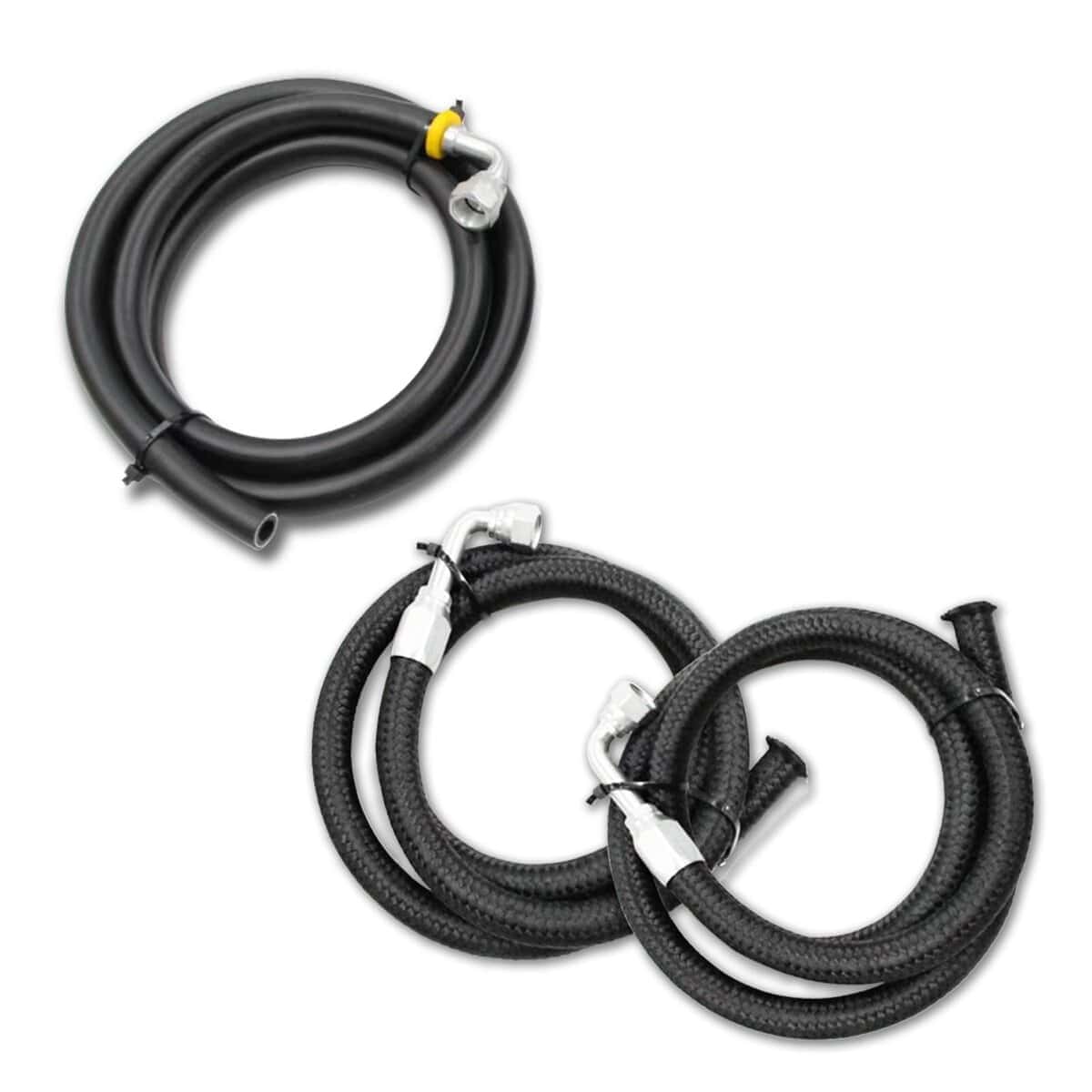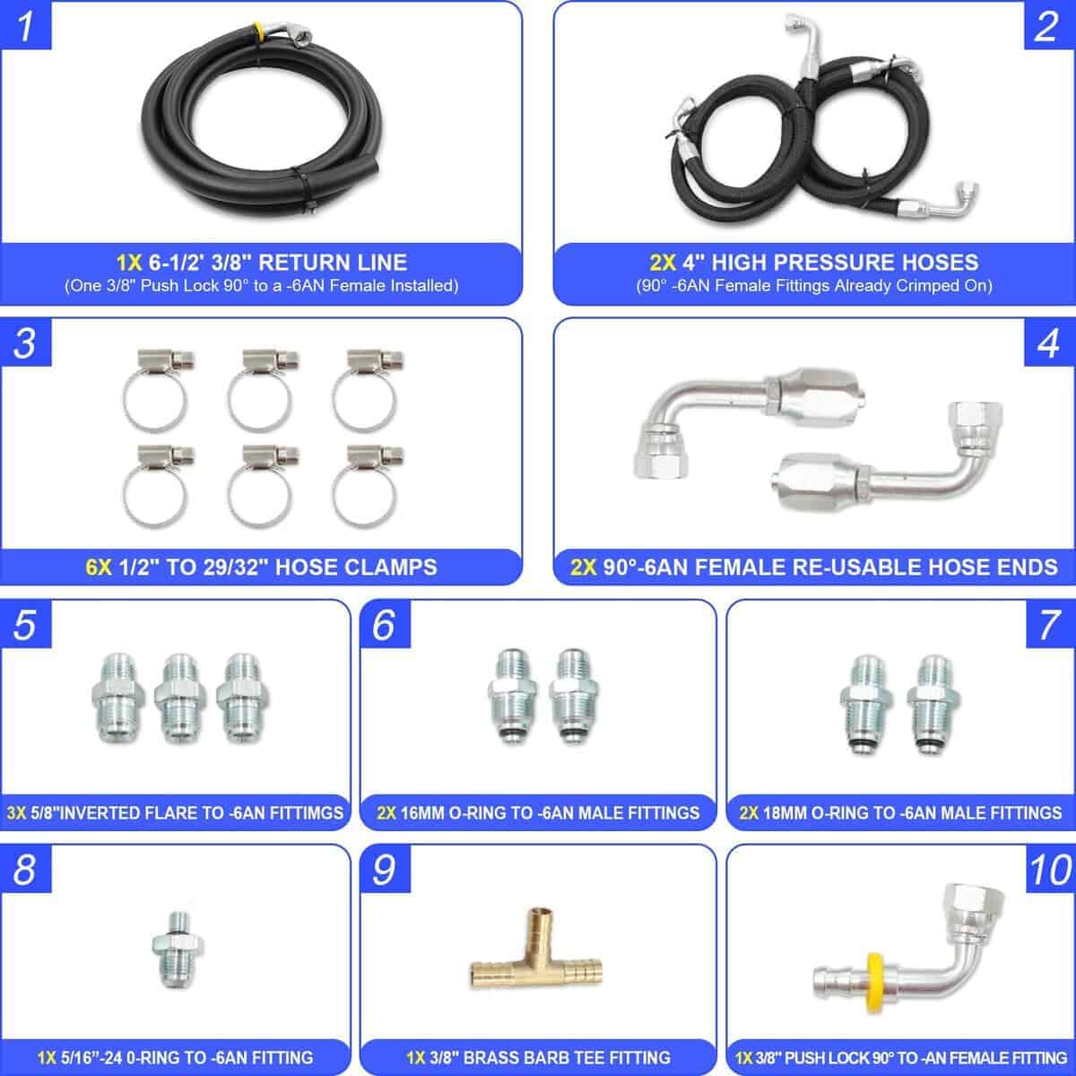 Incluye: 2 piezas de manguera de alta presión de caucho de 4 pies (90 -6AN de ajuste hembra crimpado); 1 manguera de retorno de 3/8″ de 6-1/2′ (con un 90 de 3/8″ push-lock a rosca hembra -6AN)