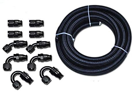 INCLUYE Kit de Manguera de Combustible AN-6 de PTFE Negro Nylon x 20 pies Conector PTFE Recto AN-6 x 4 Conector PTFE de 45 grados AN-6 x 2 Conector PTFE de 90 grados AN-6 x 2 Conector PTFE de 180 grados AN-6 x 2 DETALLES DEL PRODUCTO Tipo de Manguera de Combustible: AN-6 (5/16″) de Nylon Negro PTFE (TEFLÓN) Dentro Recubierto Diámetro Interior: 8 mm (5/16″) Diámetro Exterior: 11.80 mm (1/2″) Condición: Nuevo. Nunca se ha usado o instalado Calificación de Presión: 1000 PSI de Trabajo / 5000 PSI de Ruptura Calificación de Temperatura: -100F a 500F (-73 C a + 260 C) bajo la mayoría de las condiciones de operación Aplicación: combustible, lubricante, alcohol, etanol, refrigerante y aire para automóviles o motores marinos, más adecuado para autos de carrera y motocicletas de carreras. Nota: Si ordenas más de 1, te enviaremos una longitud continua de manguera CARACTERÍSTICAS DEL PRODUCTO Esta Manguera de Combustible de Nylon Negro Trenzado está diseñada especialmente para funcionar en cualquier proyecto automotriz. Esta manguera te proporciona niveles de rendimiento y confiabilidad inigualables para tus duras aplicaciones de alto desempeño. Esta manguera es ideal para alta temperatura, alta presión y ofrece una amplia gama de compatibilidad de fluidos. Esta manguera está hecha de poliuretano de alta calidad en el interior que les da alta resistencia química y térmica, junto con un exterior de Nylon Negro trenzado que les proporciona una alta durabilidad, resistencia extrema a la presión y una apariencia profesional y de alta tecnología. Son de flujo óptimo.