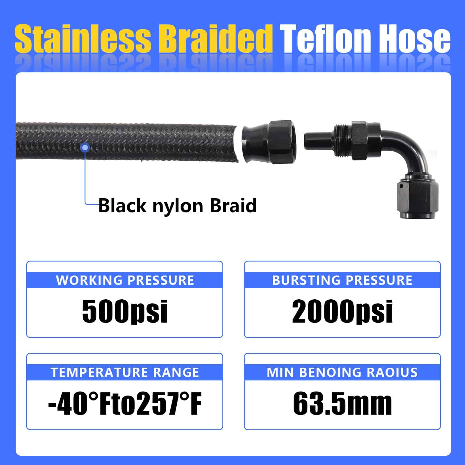 Rango de temperatura de trabajo: 25in 3/8 «Manguera de teflón trenzada de acero inoxidable