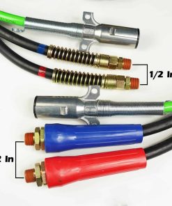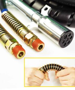 El kit de manguera de aire 3 en 1 tiene un cable de alimentación de 7 vías ABS verde y dos cables negros. Está hecho de materiales de alta calidad y es resistente a la intemperie, a la nieve y al sol para sus diferentes necesidades ambientales. Tiene un espiral premium que no solo brinda protección adicional a los cables de alimentación, sino que también los mantiene ordenados y limpios. También tiene un gancho para colgar el kit de línea aérea 3 en 1 para ayudarlo a ahorrar espacio.