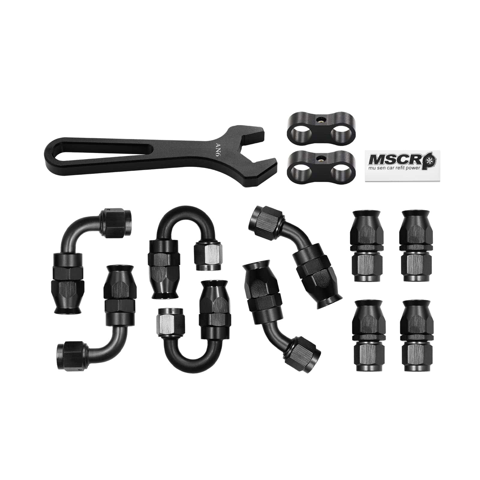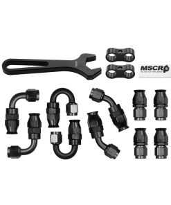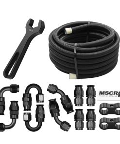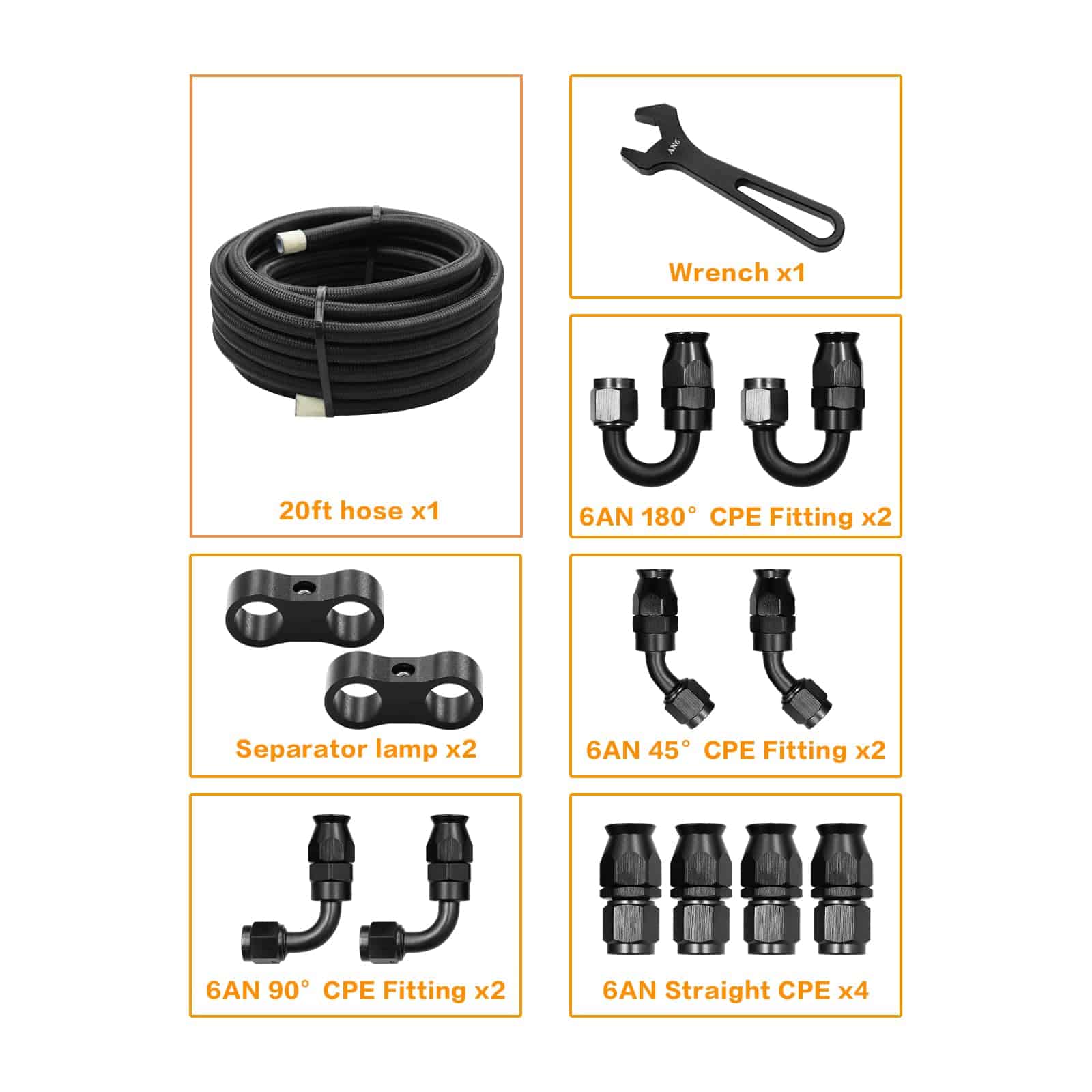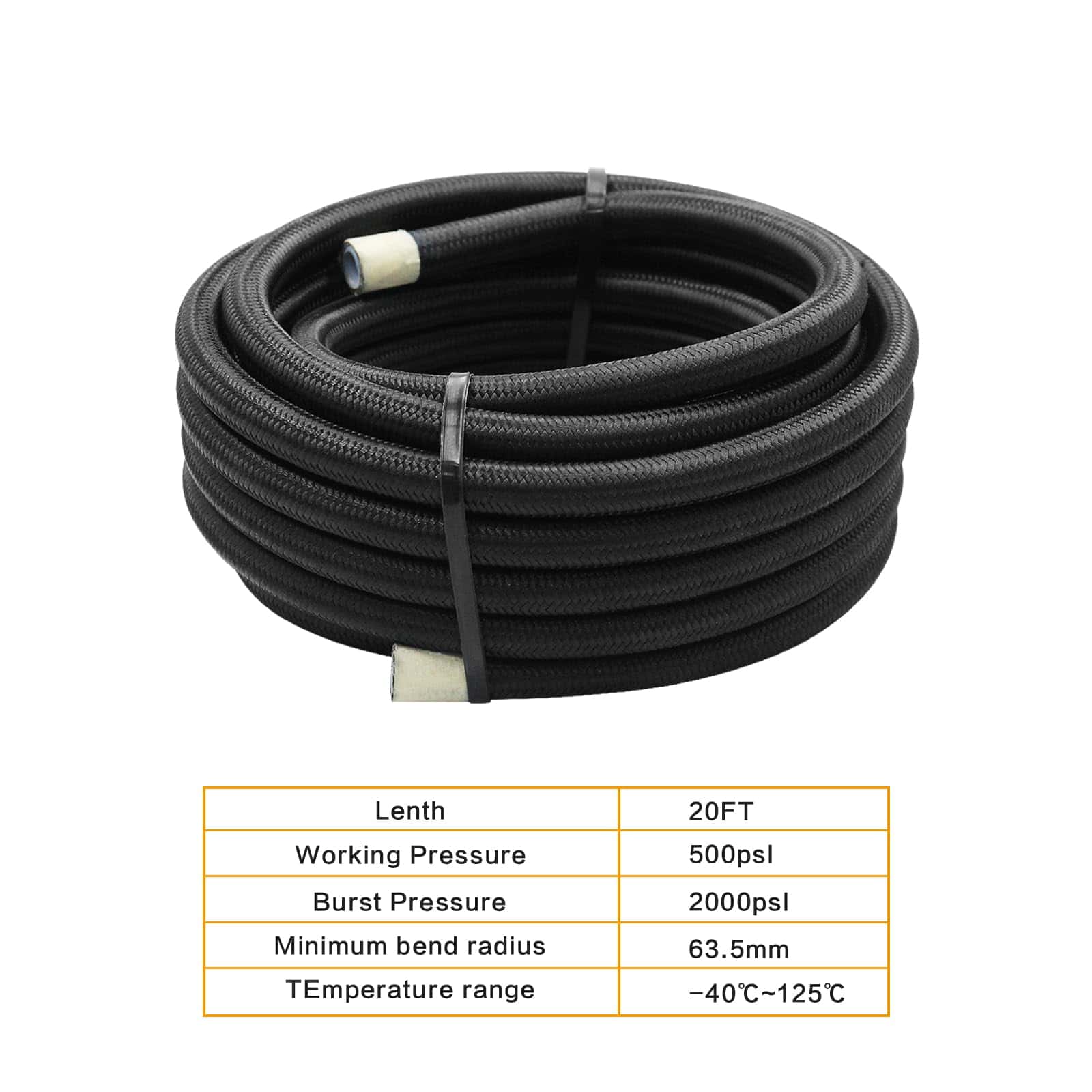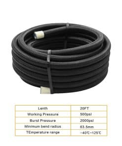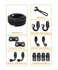 El kit de manguera de línea de combustible Pro AN6 20FT incluye una manguera trenzada de acero inoxidable de nylon de 20 pies con un diámetro interno de 3/8″ – 8.73mm. Viene con accesorios AN6-0 Degree fitting 4, AN6-45 Degree fitting 2, AN6-90 Degree fitting 2, AN6-180 Degree fitting 2, Clamp 2, AN6 wrench 1. La manguera 6AN tiene un rango de temperatura de funcionamiento de -40 a 257 (-40 a 125 ). Es compatible con casi todas las sustancias o agentes utilizados. Presión máxima de trabajo (psi): 500 psi. Presión de estallido (psi): 2000psi.