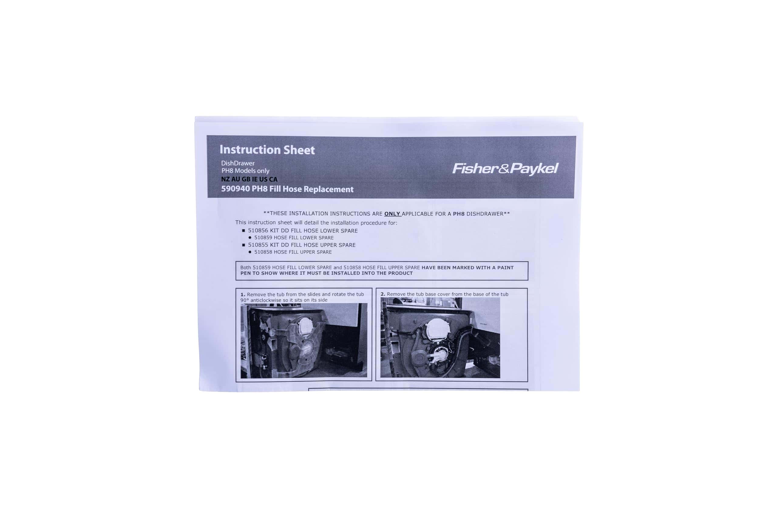 FISHER & PAYKEL 510855 KIT DE MANGUERA DE LLENADO SUPERIOR DD es un accesorio de repuesto de calidad para lavavajillas. Este kit está diseñado para adaptarse a varios modelos, incluidos DD24D, DD24SDFTX9, DD24SV2T9 y DD60D. La hoja de instrucciones incluida proporciona instrucciones detalladas para la instalación, lo que facilita una instalación sin problemas. Mantenga su lavavajillas funcionando sin problemas con este kit de manguera de llenado superior de calidad.