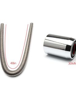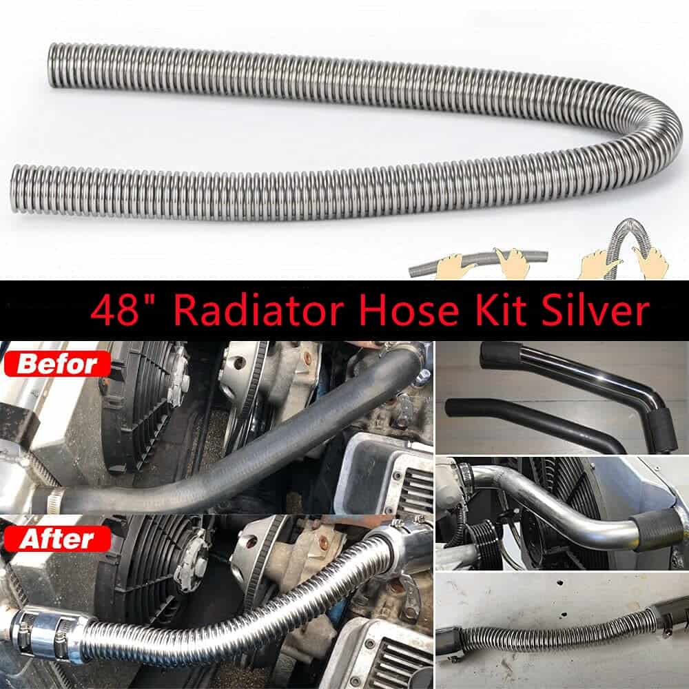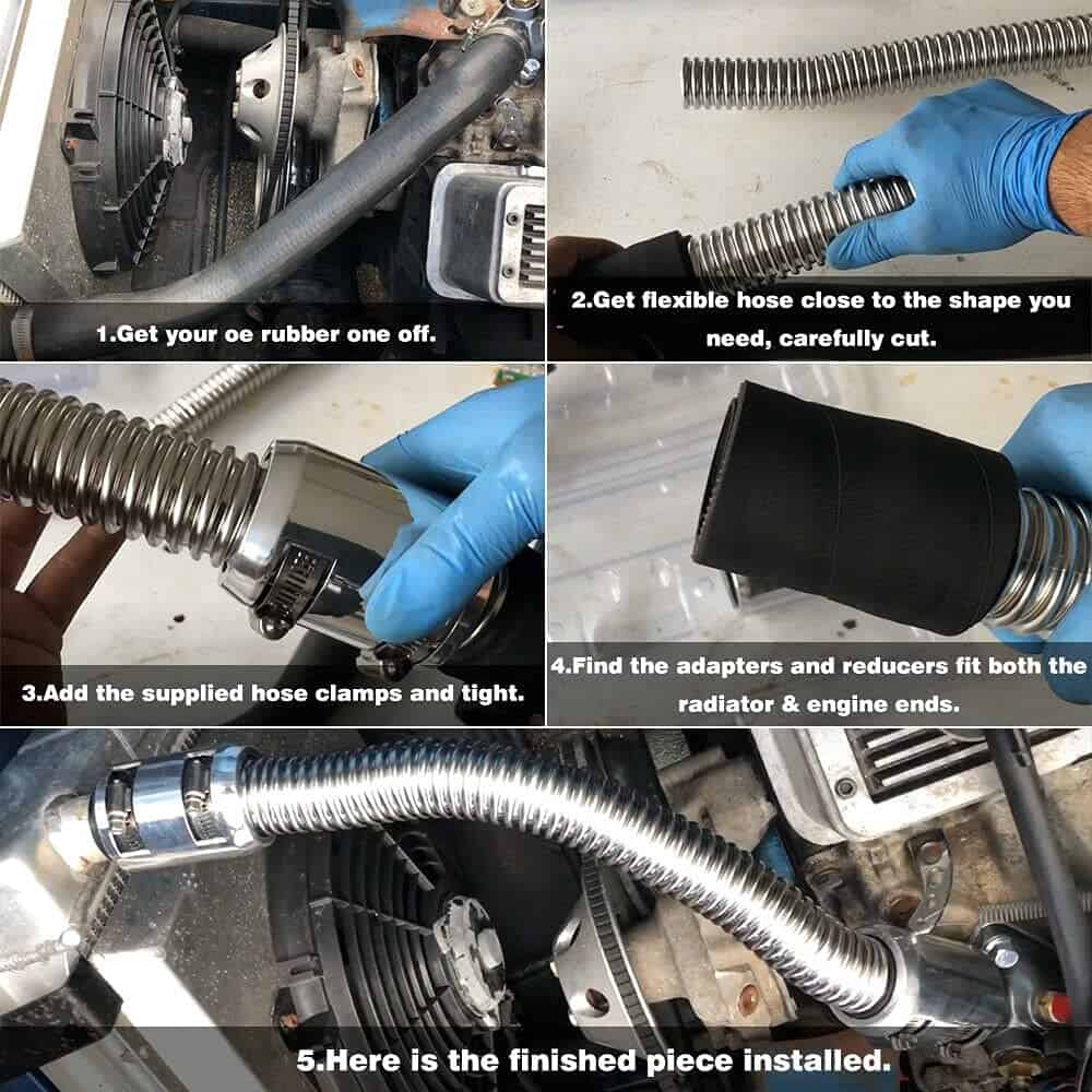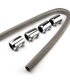El paquete incluye Manguera flexible de acero inoxidable, longitud de 48″ 4x Tapas de extremo cromadas de aluminio 4x Adaptadores de manga de manguera de goma 4x Reductores de goma, 1-1/4″ I.D. 4x Reductores de goma, 1-1/2″ I.D. 8x Abrazaderas de manguera