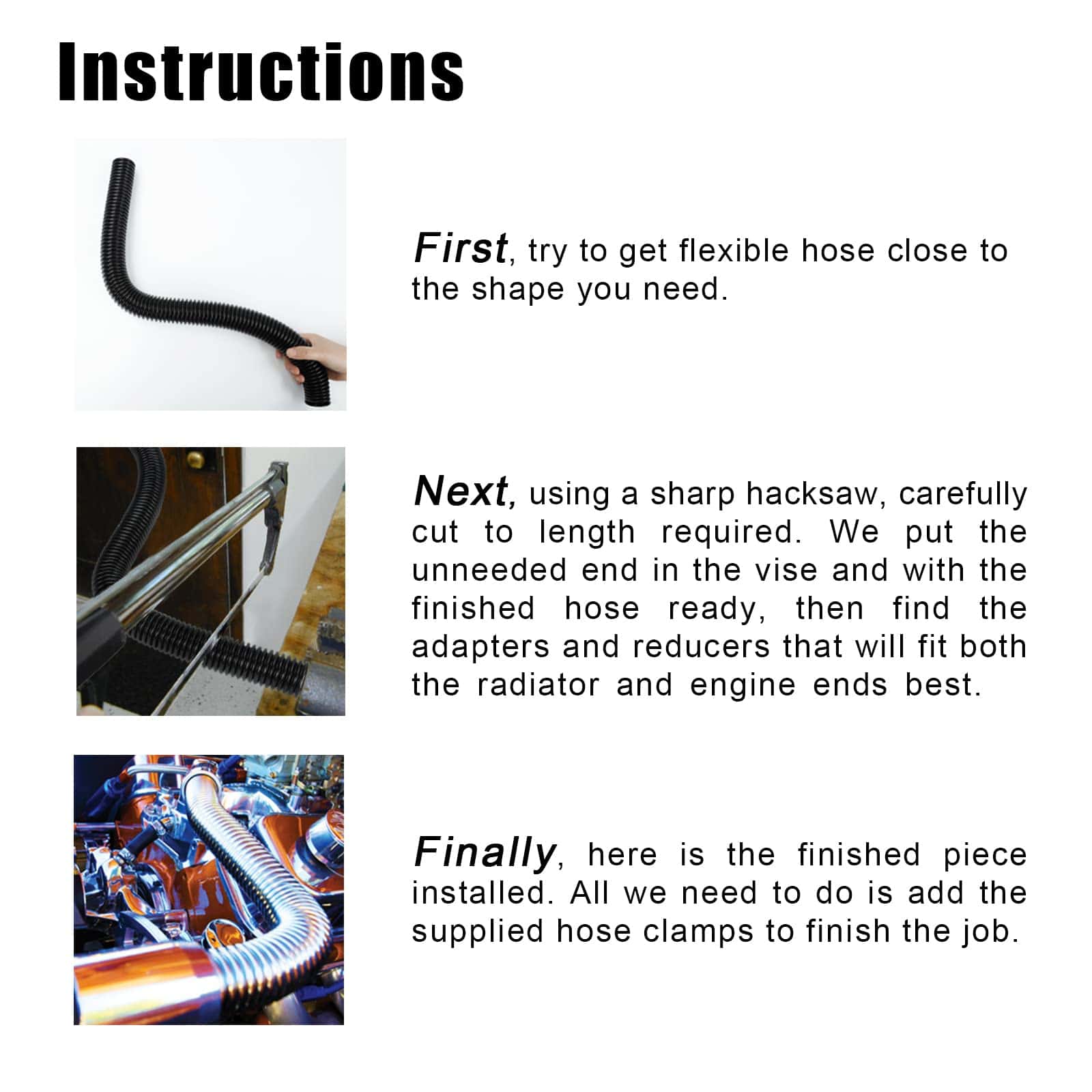 5. Incluye: 1x manguera de acero inoxidable de 36″; 2x tapas de aluminio pulido; 2x mangas (diámetro interno de 1-5/8″); 2x reductores (diámetro interno de 1-1/4″); 2x reductores (diámetro interno de 1-1/2″); 4x abrazaderas de manguera