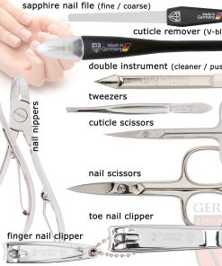 2. CONTENIDO: Tijeras de cutículas, tijeras de uñas, cortaúñas de cutículas, cortaúñas, pinzas, lima de uñas de zafiro, instrumento doble, removedor de cutículas, cortaúñas para dedos, cortaúñas para pies.