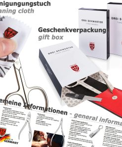 3. IMPLEMENTOS DE ACERO: Hechos a mano, niquelados brillantes (protección contra la corrosión), pulidos y endurecidos. Todos los estuches vienen en una atractiva caja de regalo. Los instrumentos son fabricados por 3 Swords desde 1927.