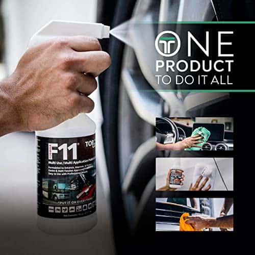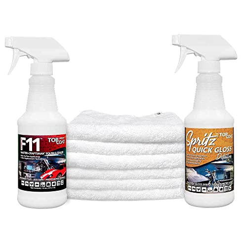 Mantén tu auto y otras superficies en condiciones óptimas con el kit de cuidado de autos TopCoat F11 y Spritz. El F11 Polish & Sealer a base de agua se usa mejor cada 1-3 meses para restaurar, recubrir y proteger las superficies. Pule F11 hasta que el área quede suave y los microarañazos ya no sean visibles. F11 Top Coat ofrece un brillo máximo y hace que las superficies sean resistentes al agua. Con el uso continuo, las grietas y arañazos que pueden dejar pasar la suciedad se rellenan. El spray de detalle para autos Spritz es perfecto para limpiar y quitar el polvo de las superficies exteriores e interiores. ¡No se necesita jabón ni agua! Solo rocía y limpia con una de las toallas de microfibra incluidas. Estos productos de cuidado para autos de 16 oz se pueden usar en una variedad de superficies, incluidas exteriores e interiores de automóviles, motocicletas y RV. Una vez que se aplica F11, el agua perlará de la superficie, lo que lo hace ideal para ventanas y parabrisas para mantener la visibilidad.