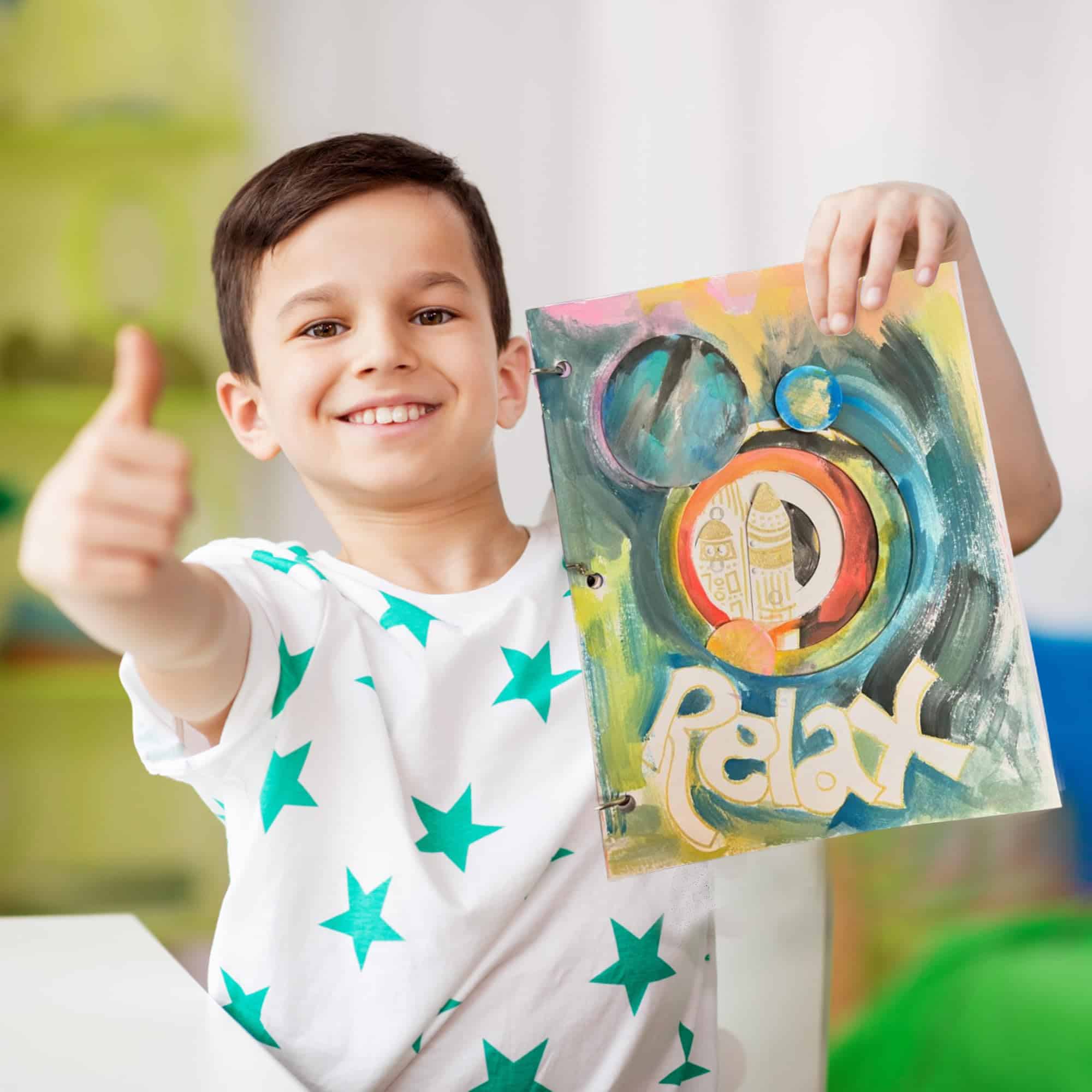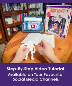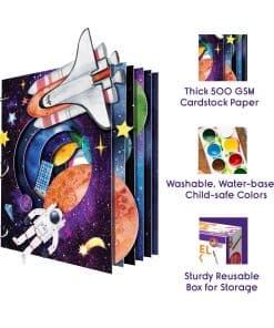 4. MATERIALES Y RESULTADOS DE CALIDAD: Las páginas del Libro en Túnel 3D están hechas de cartulina gruesa de 500 gsm. Los materiales artísticos no solo son vibrantes y jugosos, sino también a base de agua, lavables y seguros para las manitas pequeñas. Y la resistente caja reutilizable es ideal para guardar tu obra en progreso.