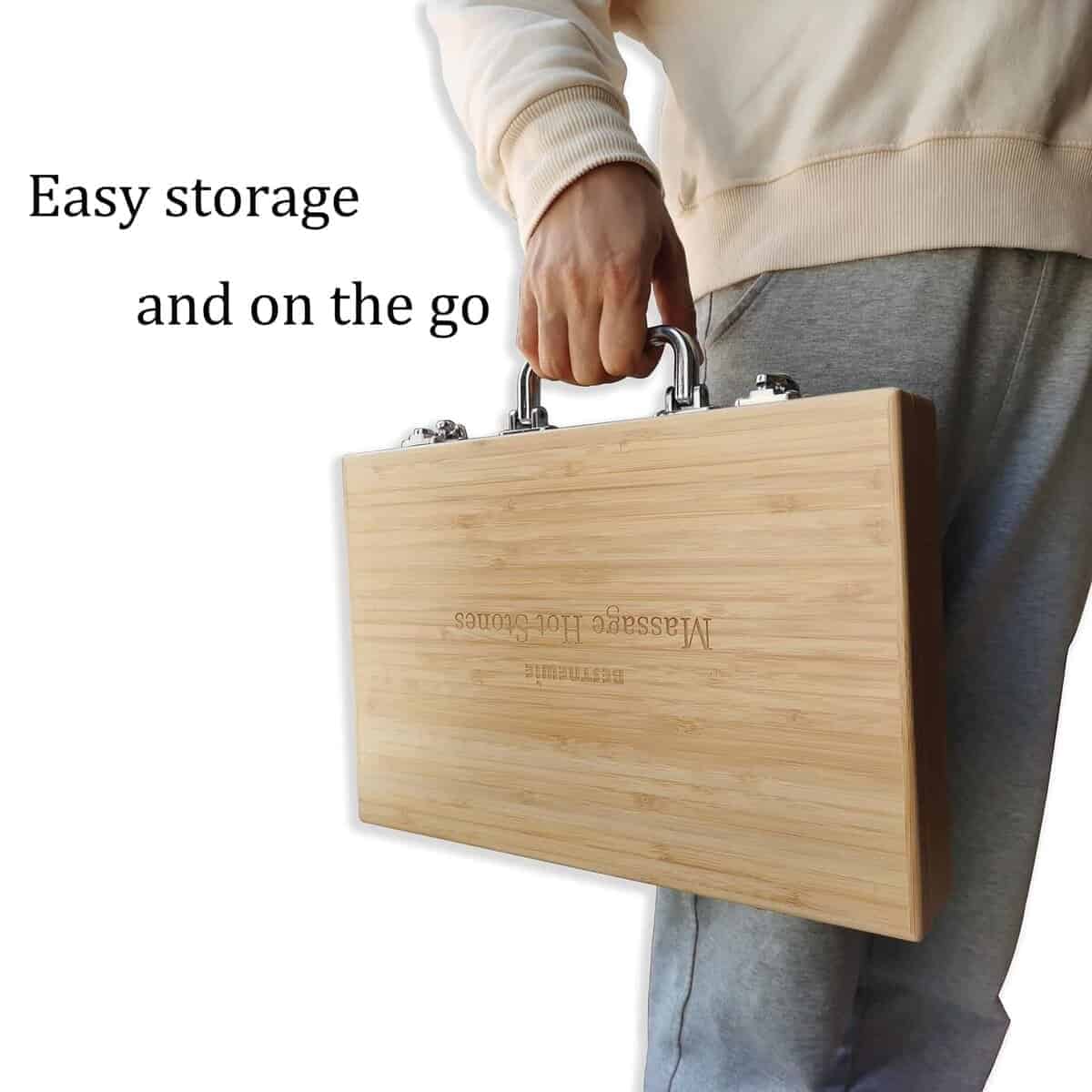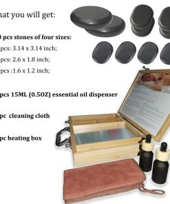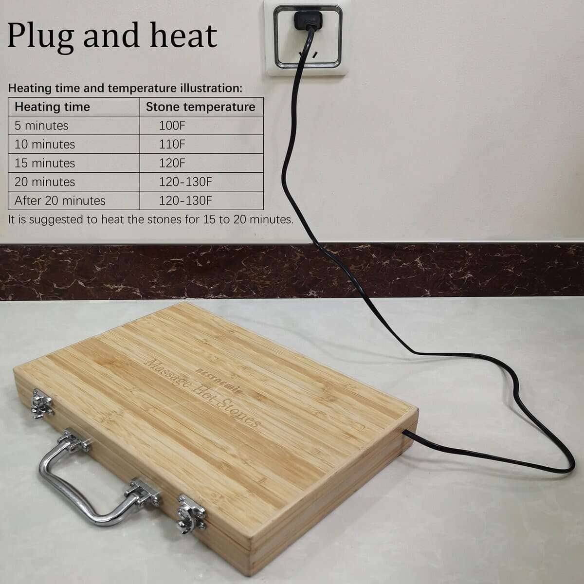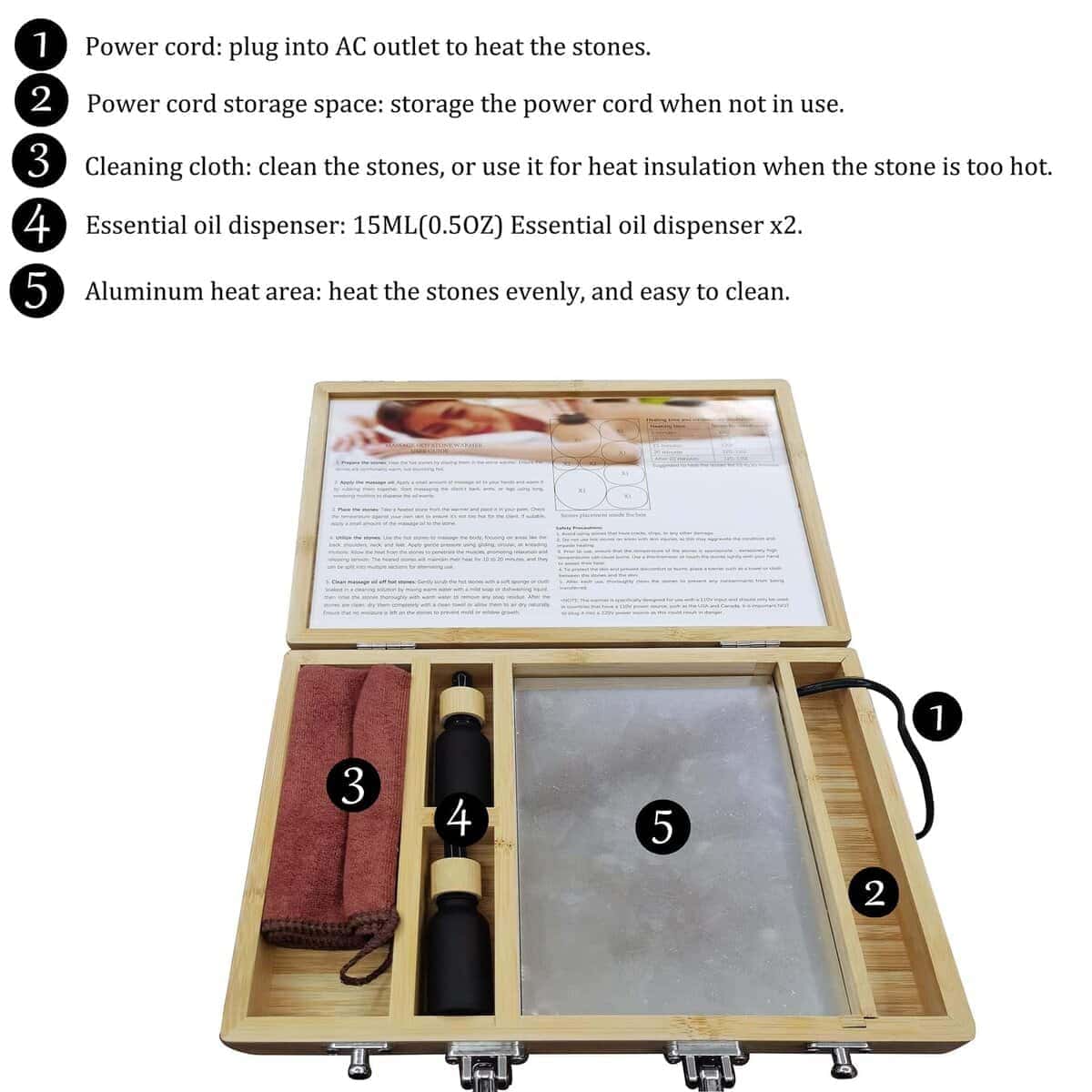 1. CORDÓN DE ALIMENTACIÓN ALMACENADO: El cordón de alimentación para la caja calentadora de piedras calientes se puede almacenar ordenadamente dentro de la caja para evitar desorden cuando no se usa. Kit de masaje de piedras calientes de 10 piezas. Cada piedra está hecha de piedras naturales; las piedras de basalto tienen una gran retención de calor, perfectas para spa y terapia de masaje.