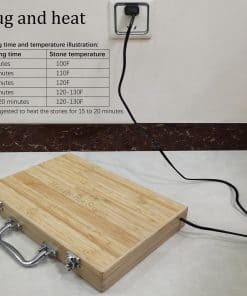 4. CONECTAR Y CALENTAR: Conecte el dispositivo a una fuente de alimentación y caliente las piedras durante 15 a 20 minutos, alcanzando una temperatura de 120 a 130 grados Fahrenheit. El calor se mantendrá durante 15-20 minutos, y las piedras se pueden dividir en dos partes para un uso alternativo.