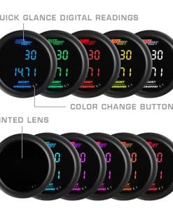 El Kit de Medidores Digitales Dual de 10 Colores para Presión de Boost/Vacío y Relación Aire/Combustible Amplia de GlowShift es la solución perfecta para monitorear de manera precisa y eficiente diferentes parámetros en tu vehículo de rendimiento. Este medidor avanzado te permite vigilar simultáneamente los niveles de presión de boost de un motor turbo o sobrealimentado, así como las ratios de aire a combustible de tu vehículo de alto rendimiento. Con un rango de lecturas amplio, desde -30 inHg hasta 45 PSI para el boost/vacío y de 10.00 a 20.00 AFR para la relación aire/combustible, puedes estar seguro de obtener información precisa en todo momento. El medidor cuenta con 2 pantallas LED multicolor de fácil lectura y una lente tintada que garantiza una visualización óptima en cualquier condición de luz. Además, puedes configurar cada pantalla con tu color favorito de los 10 modos sólidos disponibles o elegir entre los 2 modos de ciclo de color para una experiencia visual única. La auto-calibración al inicio asegura que el medidor esté funcionando de manera óptima en todo momento. Para una instalación sencilla, el kit incluye todo lo necesario, desde sensores electrónicos hasta arneses y accesorios de montaje. Con la garantía GlowShift que cubre el producto por un año y el soporte técnico gratuito de por vida, puedes estar seguro de que estás adquiriendo un producto de calidad respaldado por una marca de confianza en el mercado de medidores para vehículos de alto rendimiento.