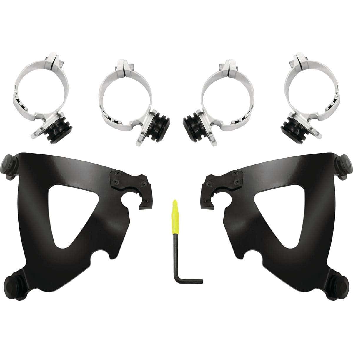 Los kits están hechos a medida para cada estilo de motocicleta para una instalación realmente sin problemas. Hecho en EE.UU. Se vende como kit. Notas: Kit de montaje SOLAMENTE; todos los parabrisas se venden por separado. Algunas adaptaciones pueden requerir reubicación de las luces de giro delanteras. Kits de Montaje de Bloqueo por Gatillo vs Pla