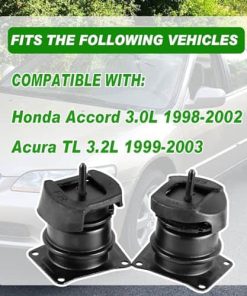 Kit de montaje de motor y transmisión de 5 piezas compatible con Honda Accord 3.0L 1998-2002 Acura TL 3.2L 1999-2003. Reemplazo directo de las partes originales OE. Fabricado con alta calidad para mayor durabilidad y resistencia térmica, reducción de ruido y prevención de vibraciones. Fácil de instalar, se recomienda una instalación profesional. Garantía: El kit de montaje de motor y transmisión de Honda Accord/Acura TL de Lochnchn viene con servicios de devolución y cambio gratuitos. Si tienes alguna pregunta, contáctanos y las resolveremos de inmediato. Por favor, verifica cuidadosamente el modelo y año del coche antes de ordenar.