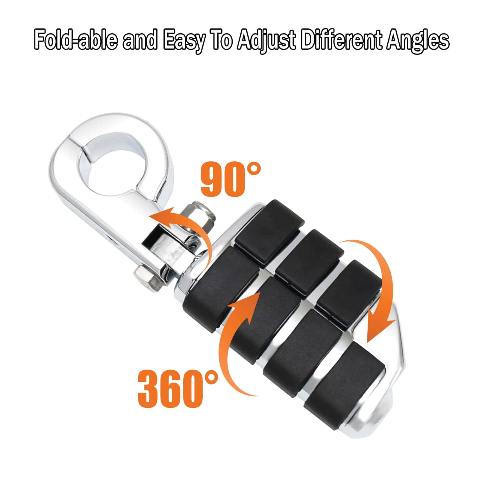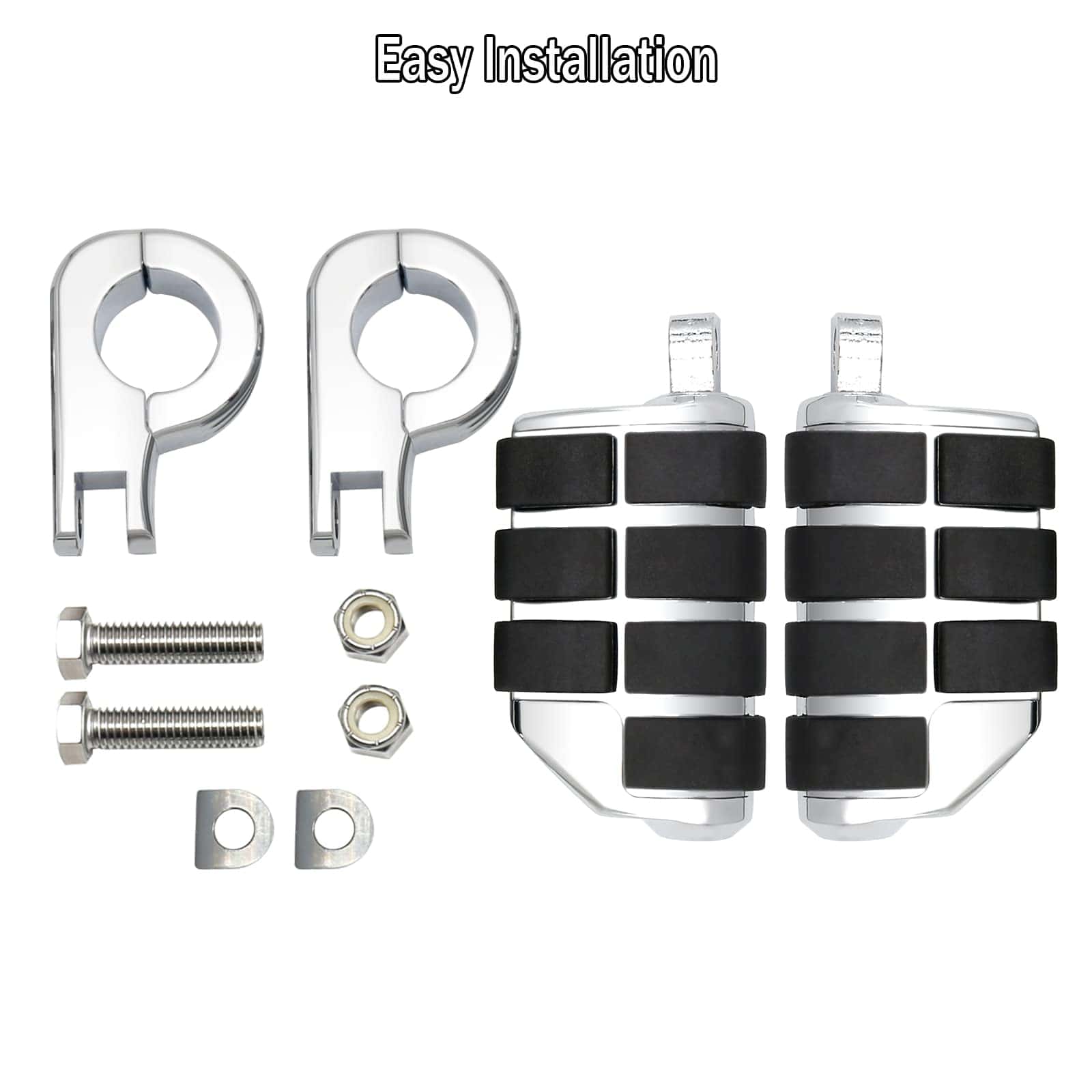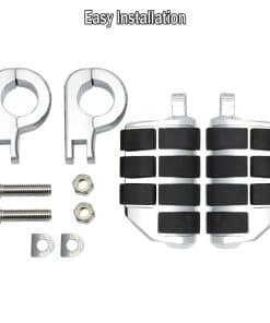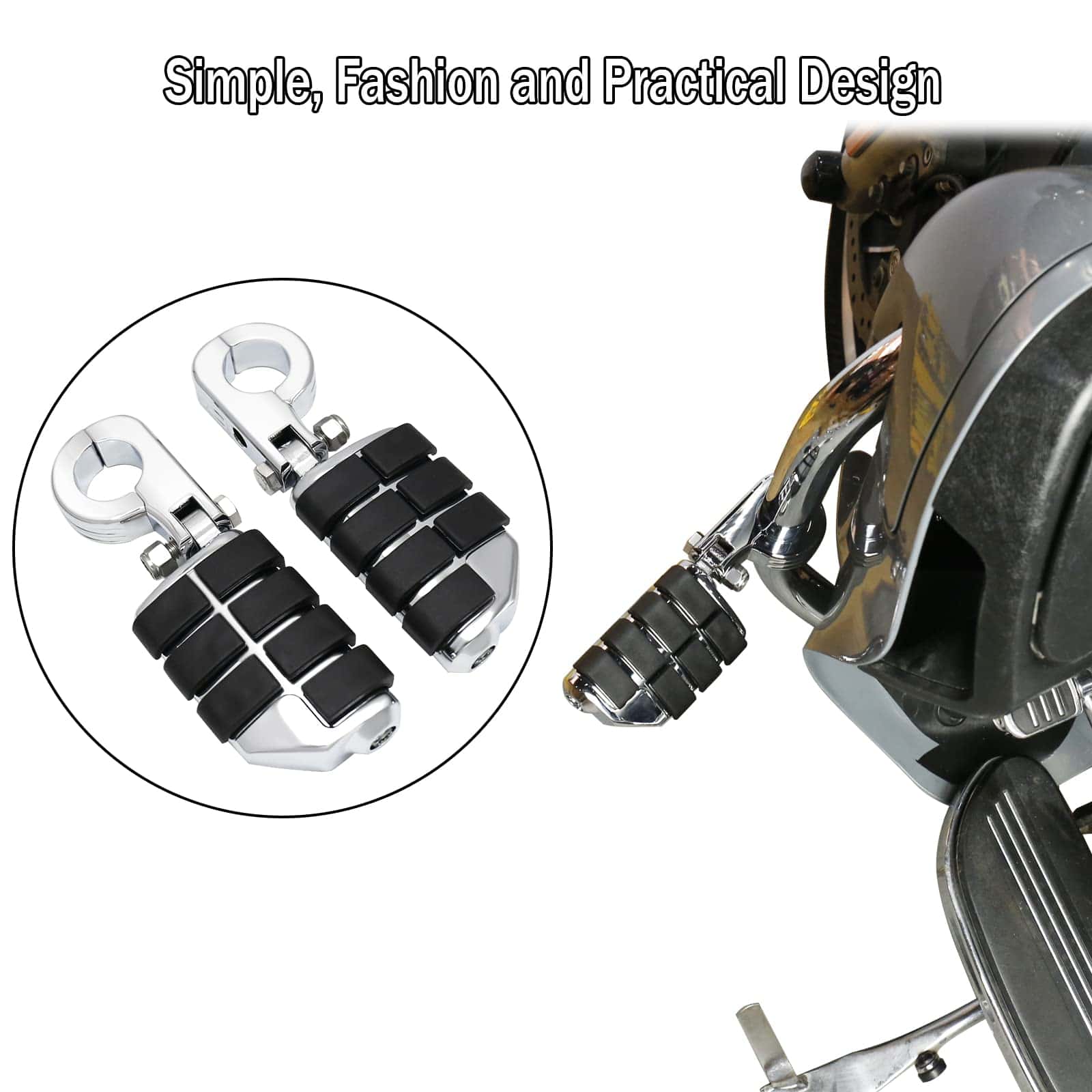 Kit de montaje de reposapiés ajustable para motocicleta, ideal para defensas/barras de choque de motor de 1.25 pulgadas. Hecho de aleación de aluminio de primera calidad mecanizado CNC con inserción de goma, este kit es resistente al desgaste, antideslizante y te proporcionará una sensación cómoda en los pies. Compatible con modelos Harley Sportster Softail Touring Road Glide Road King Street Glide Electra Glide (excepto ciertos modelos de defensas). Ajuste de ángulo de 360 grados para una personalización óptima. Proporciona comodidad adicional en tus viajes largos, permitiéndote relajar los pies. La abrazadera de montaje mejorada con diseño de bloqueo de 4 tornillos garantiza una fijación segura a la defensa del motor. Mejora el estilo y la impresión de tu motocicleta con este kit de montaje de reposapiés de autopista.