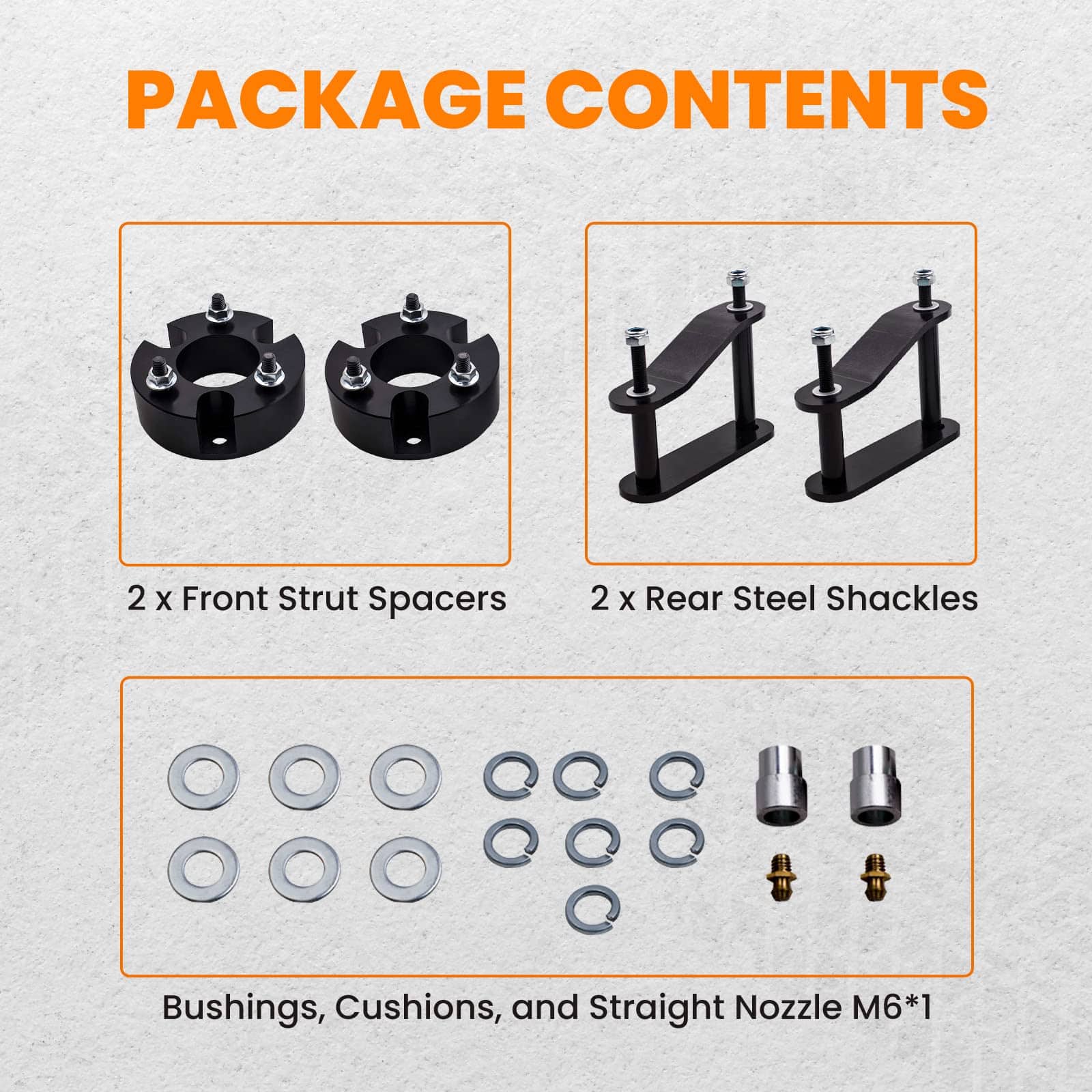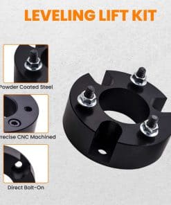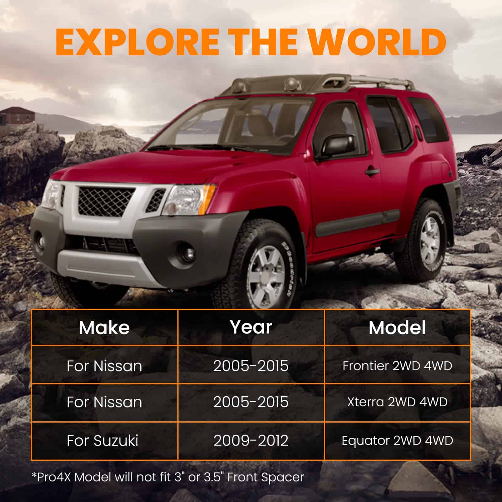 Aplicaciones para Nissan Frontier 2005-2015 2WD 4WD para Nissan Xterra 2005-2015 2WD 4WD para Suzuki Equator 2009-2012 2WD 4WD No se adapta al modelo Pro4X de 3″ o 3.5″ Espaciador delantero de 3″ de elevación Levantadores de acero traseros de 2″ Característica Mecanizado CNC para un rendimiento y calidad excepcionales Recubrimiento protector patentado para prevenir la oxidación y el óxido Aumenta la altura al suelo e instala llantas y neumáticos personalizados más grandes Incluye topes de golpe para evitar el contacto de la brazo de control con el cubo del amortiguador Proceso de instalación fácil, no se requieren herramientas especiales Notas No se incluyen instrucciones y se recomienda la instalación profesional Si necesita las instrucciones de instalación, contáctenos