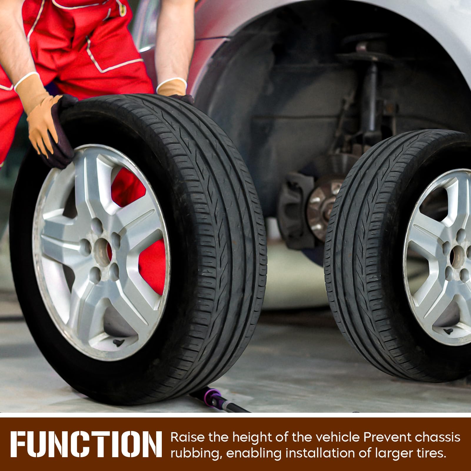 Función: Aumenta la altura delantera del vehículo para lograr una apariencia más agresiva y evitar roces en el chasis al instalar neumáticos más grandes.