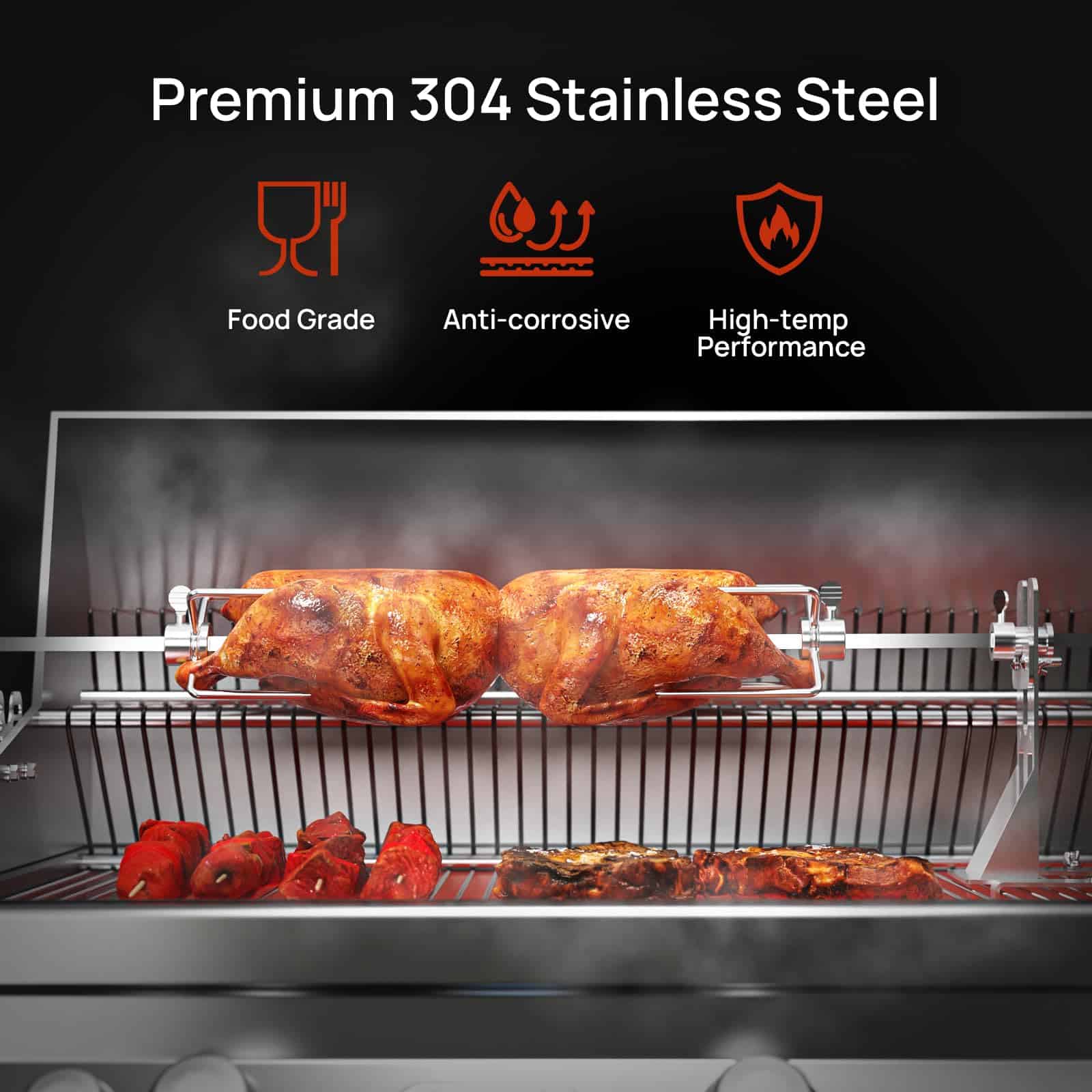 3. Piezas Ajustables El soporte de varilla proporciona estabilidad y también tiene una altura ajustable para adaptarse a cortes de carne variados para una cocción precisa y uniforme. Asa pollos suculentos y sabrosos pinchos, ajustando cada comida a la perfección.