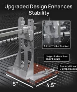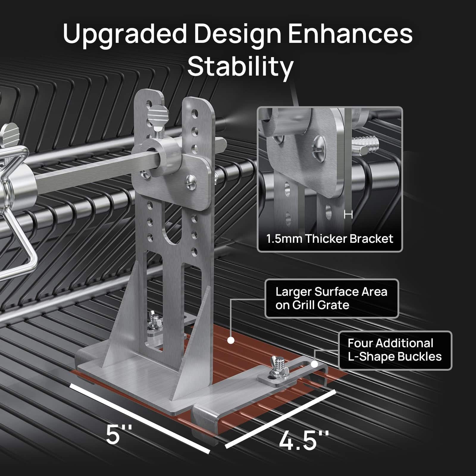 4. Configuración Sencilla Guiados por instrucciones claras y un diseño intuitivo, el ensamblaje es pan comido. Nota: Este kit solo es adecuado para parrillas que tengan agujeros en al menos un lado para instalar un soporte de motor y tengan parrillas para instalar el soporte de varilla.
