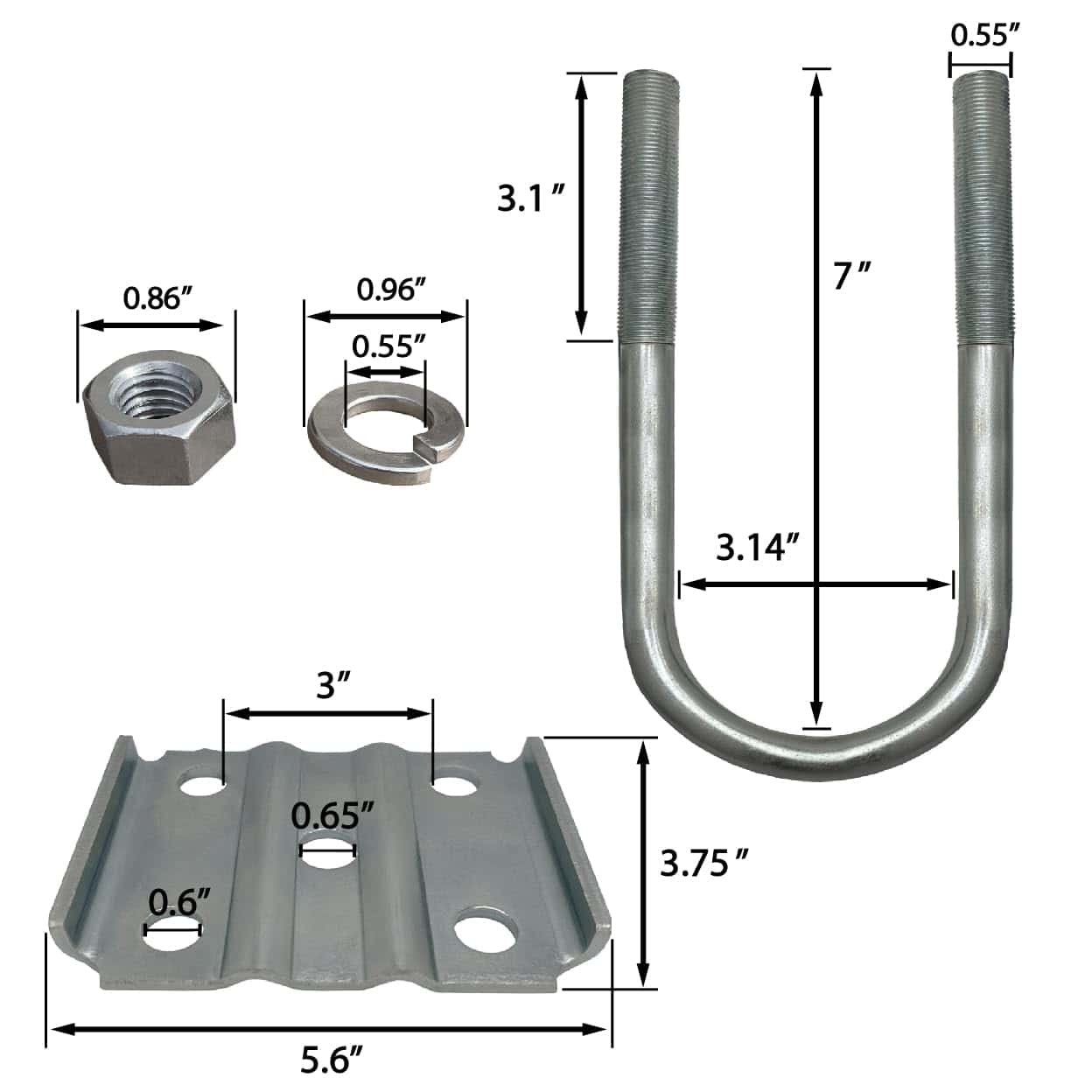 Kit de Perno U Redondo y Placa para Eje de Remolque, Galvanizado, 3″ W x 7″ L. Este kit está diseñado específicamente para ejes redondos de 3 pulgadas con una longitud de perno de 7 pulgadas y un diámetro de 0.55 pulgadas, adecuado para ejes redondos de 5,200 a 7,000 libras de capacidad. Fabricado con acero galvanizado resistente y duradero, este kit incluye 4 placas de sujeción para muelles de 1-3/4 pulgadas. El recubrimiento de zinc evita la corrosión, lo que lo hace adecuado para su uso en remolques marinos y lanchas a motor en condiciones de agua salada, agua dulce, condiciones costeras y remolques de tierra en condiciones heladas. El kit incluye: 4 placas de sujeción, 8 pernos U redondos, 16 tuercas hexagonales y 16 arandelas de seguridad. Compatible únicamente con ejes de calidad de marcas como Dexter, Lippert, Al-Ko y Hayes.