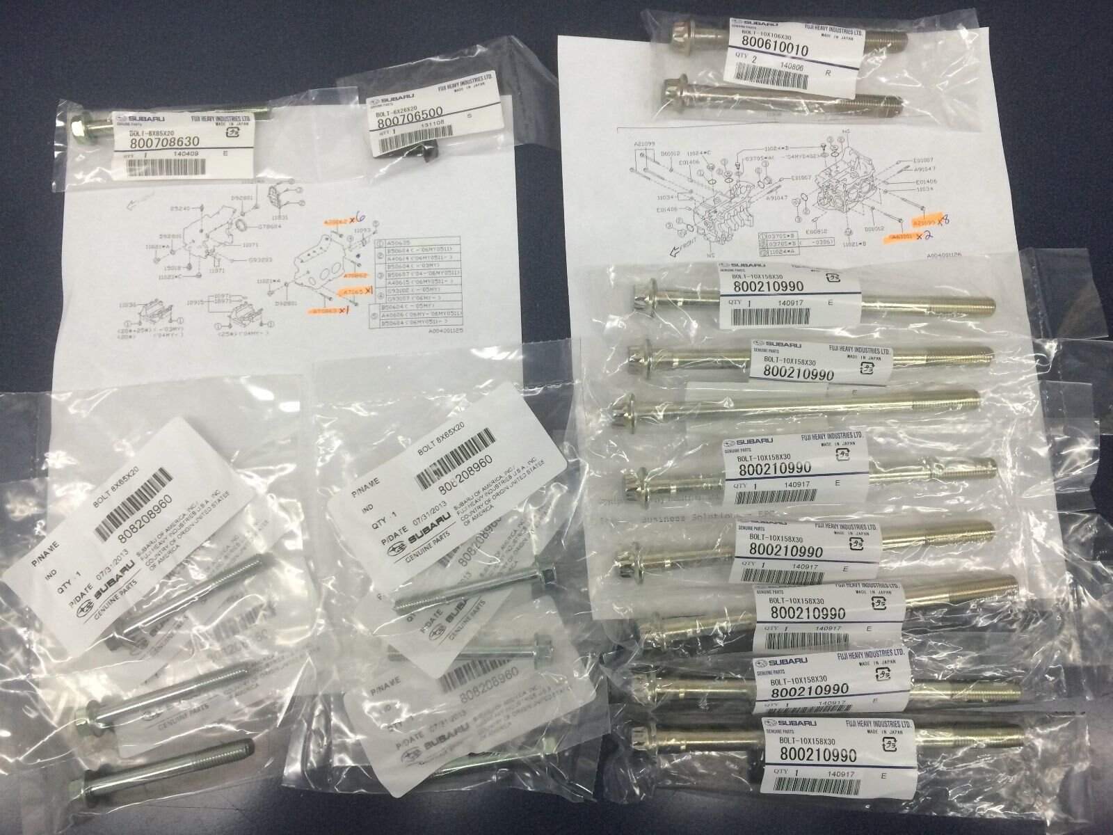 ¿Necesitas Pernos de Bloque y Pernos Principales originales en un kit para tu Subaru? Tu kit incluirá piezas originales selladas de fábrica. El kit incluirá pernos de la mitad del bloque 800610010 x2 (A61001 en la imagen)(10x106x30) pernos de la mitad del bloque 800210990 x8 (A21099 en la imagen)(10x158x30) pernos de la mitad del bloque 808208960 x6 (A70862 en la imagen)(8x65x20) perno de la mitad del bloque 800706500 x1 (A7065 en la imagen)(6x26x20) perno de la mitad del bloque 800708630 x1 (A70863 en la imagen)(8x85x20) TAMBIÉN TENEMOS LAS ORINGS DE LA MITAD EN NUESTRA TIENDA TAMBIÉN TENEMOS LAS ARANDELAS DE LA MITAD EN NUESTRA tienda No te conformes con componentes de mercado de dudosa calidad y siempre insiste en repuestos genuinos de Subaru. Compatible con: 1995-2014 Outback y Legacy y Baja Turbo y No turbo 1993-2014 Impreza & WRX & STI Turbo y No turbo 1998-2013 Forester Turbo y No Turbo 1996 1997 1998 1999 2000 2001 2002 2003 2004 2005 2006 2007 2008 2009 2010 2011 Subaru EJ205 EJ207 EJ255 EJ257 EJ25D 2.0 2.5 DOHC Por favor, revisa nuestros otros listados para otros kits de juntas de tapa de válvulas y kits de pernos de culata y kits de juntas de culata. Por favor, envía un correo electrónico o llama con tu número de identificación del vehículo si deseas verificar la compatibilidad con tu Subaru. Este Kit de Pernos de Culata Genuinos de Subaru se ofrece a la venta por Subaru Parts Online, un concesionario de Subaru en EE.UU. Todas las piezas de Subaru incluyen una garantía de 1 año/kilometraje ilimitado por defectos de mano de obra o material. Si el artículo falla durante el período de garantía, no es necesario devolverlo a menos que lo desees. ¡Simplemente ve a tu concesionario Subaru más cercano con tu recibo! Si tienes preguntas sobre si este artículo es compatible con tu vehículo, por favor llámanos o envíanos un mensaje.