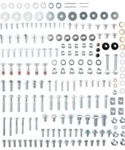 Incluye (6) pernos de rueda dentada, (6) tuercas de rueda dentada, (6) pernos del asiento de Honda CR/CRF, (2) pernos del subchasis CRF, (2) pernos de ajuste de cadena y tuercas, (10) pernos del revestimiento CR/CRF, (6) pernos de la horquilla, (6) bujes de revestimiento de aluminio, (6) arandelas de compresión M8, (2) arandelas de compresión M6, (4) arandelas de compresión de banjo M10, (10) pernos y tuercas del rotor de freno CR/CRF, (20) pernos hexagonales de brida M8 de 10 mm, (48) pernos hexagonales de brida M6 de 8 mm, (4) tuerca en T del guardabarros trasero, (2) tuercas hexagonales de brida M10 de 14 mm, (4) tuercas hexagonales de brida M8 de 12 mm, (3) tuercas hexagonales de brida M6 de 10 mm, (25) arandelas para guardabarros, (8) tornillos de cabeza redonda M5, (4) pernos hexagonales de brida M5 de 8 mm, (2) tornillos de montaje empotrado M4, (2) empaquetaduras para válvula de llenado, (2) tapas de válvula de llenado, (1) extractor de núcleos de válvula.